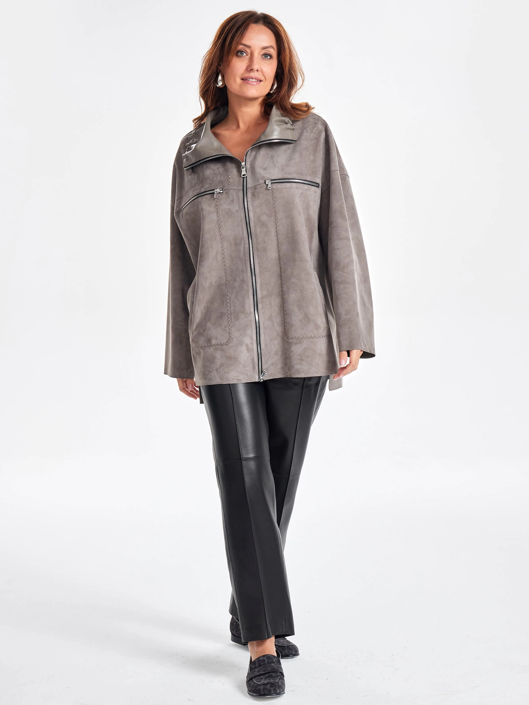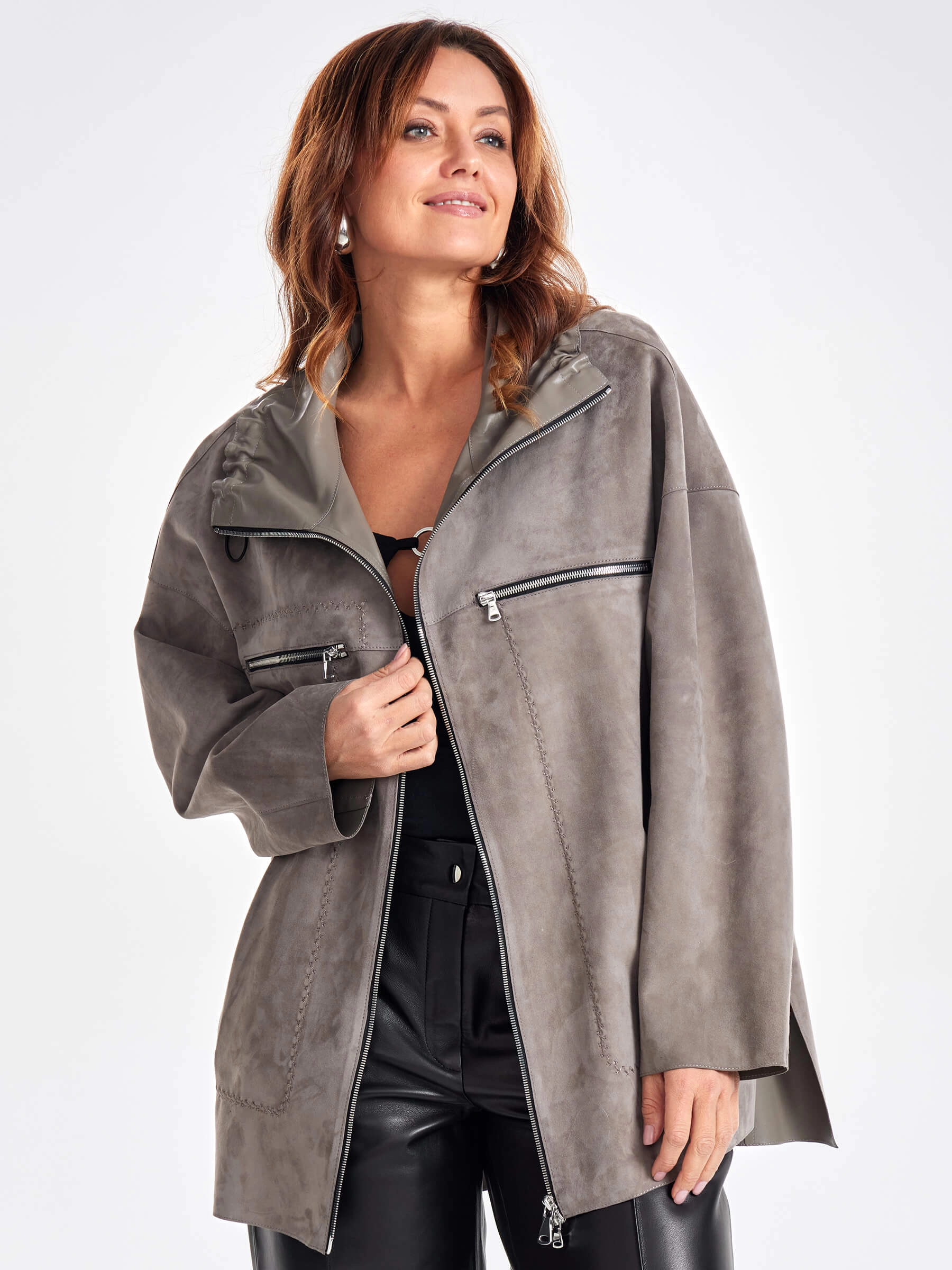 Интересным решением для весеннего гардероба станет куртка выполненная из тонкой замши премиум класса. Свободный крой, регулируемый воротник можно трансформировать в высокую стойку. Для декора использовали зигзагообразный стежок и два нагрудных кармана застегивающиеся как и само изделие крупной молнией в цвете серебро.