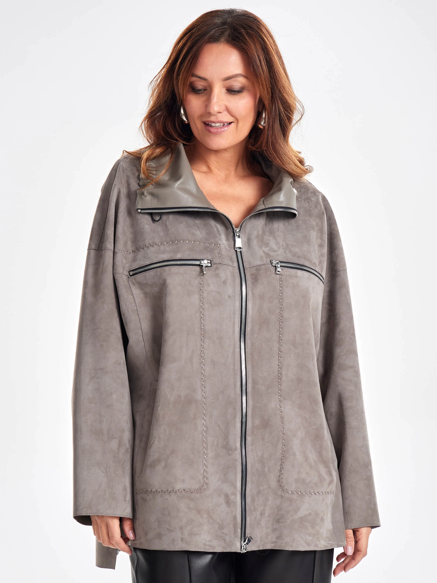 Замшевая женская куртка оверсайз на молнии премиум класса 3055з, серая, размер 50, артикул 23500