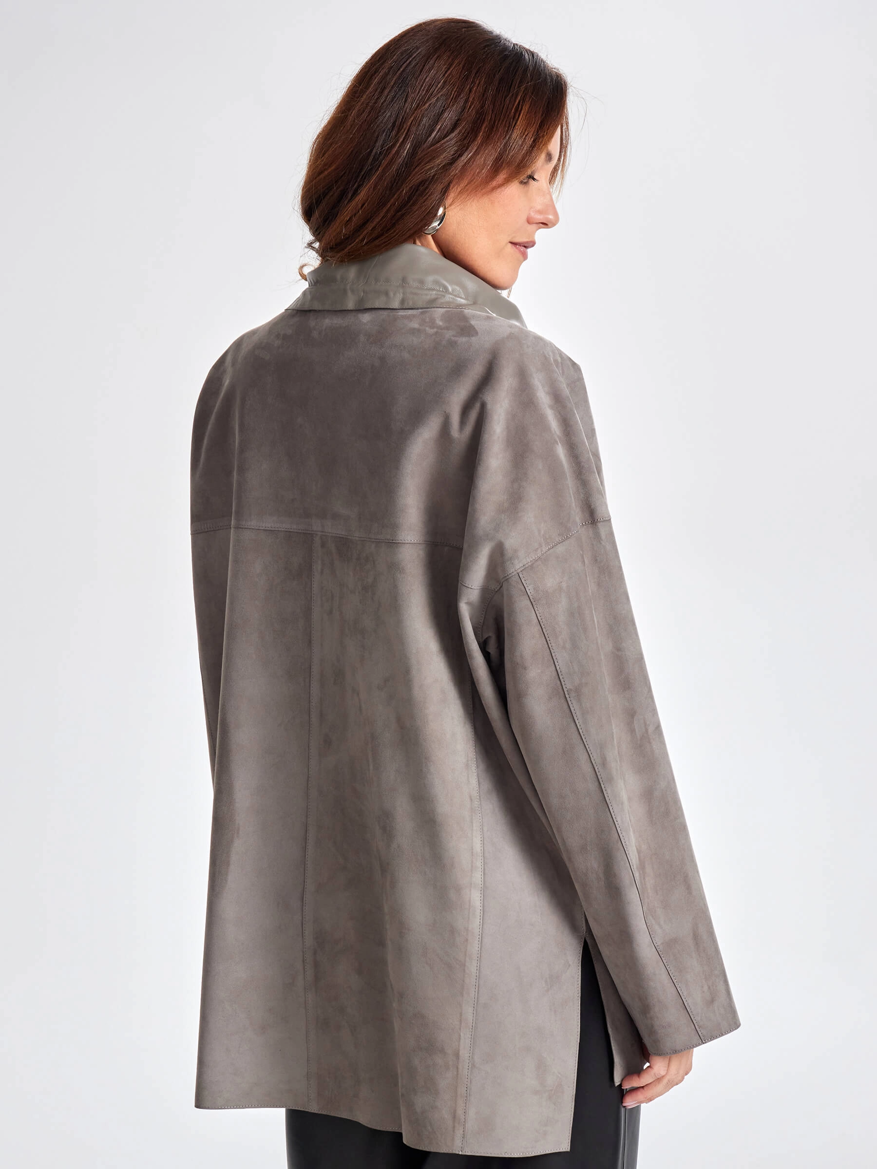 Товар замшевая женская куртка оверсайз на молнии премиум класса 3055з, серая, размер 50, артикул 23500 выполнен из натуральной замши с застежкой молния. Рассчитан на сезон: весна-осень. Длина изделия 80 см, силуэт оверсайз.