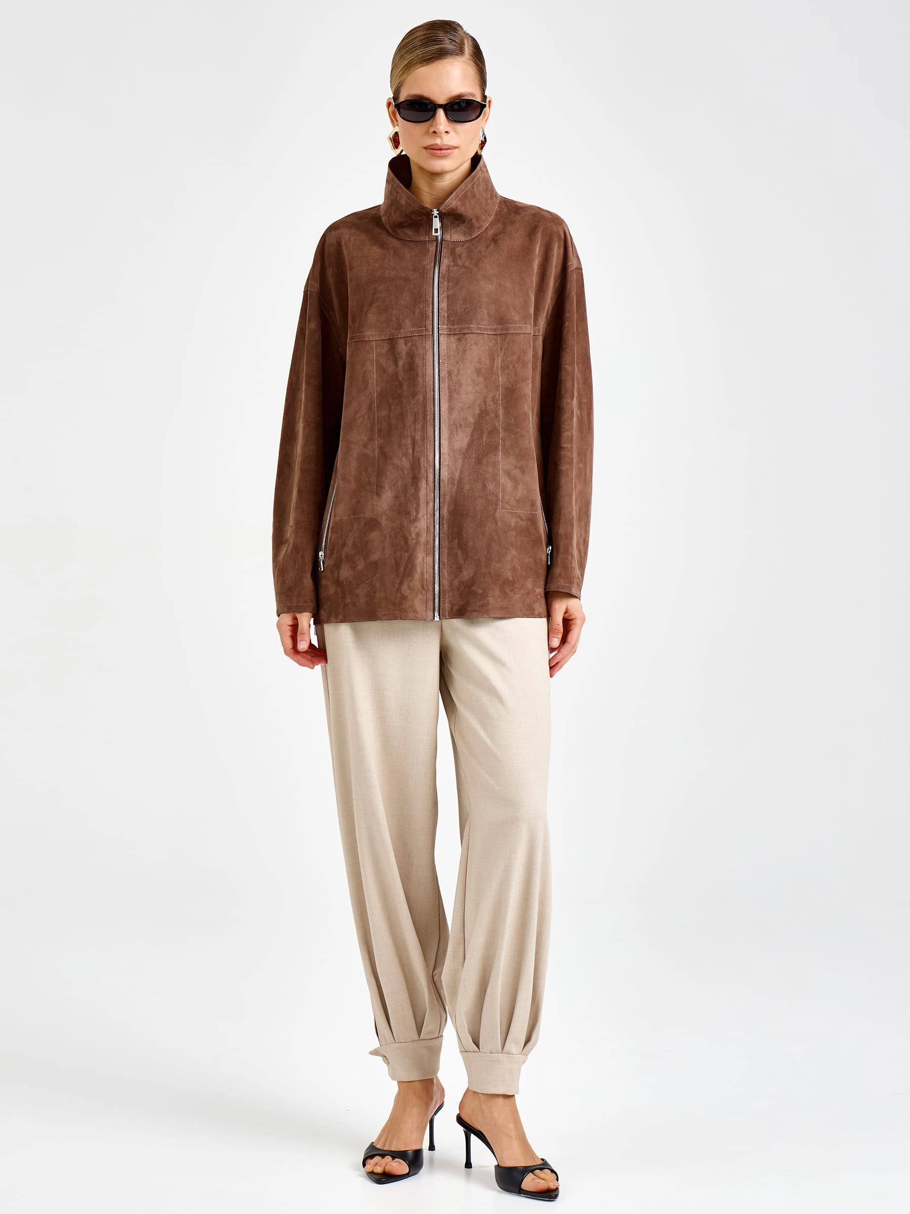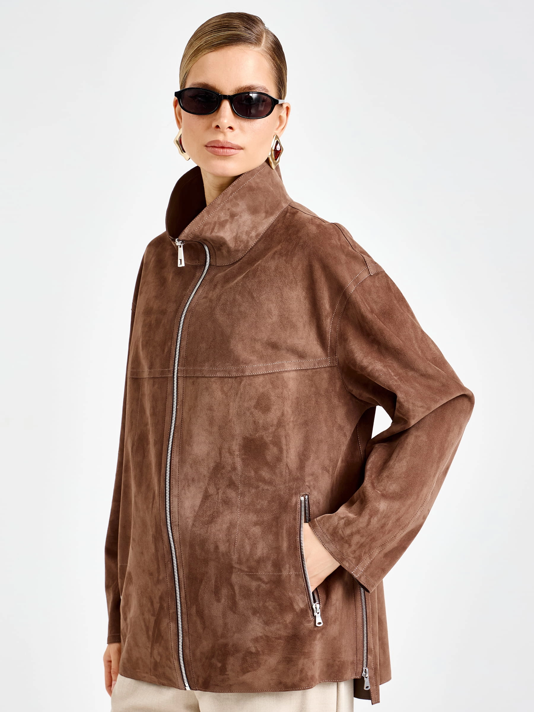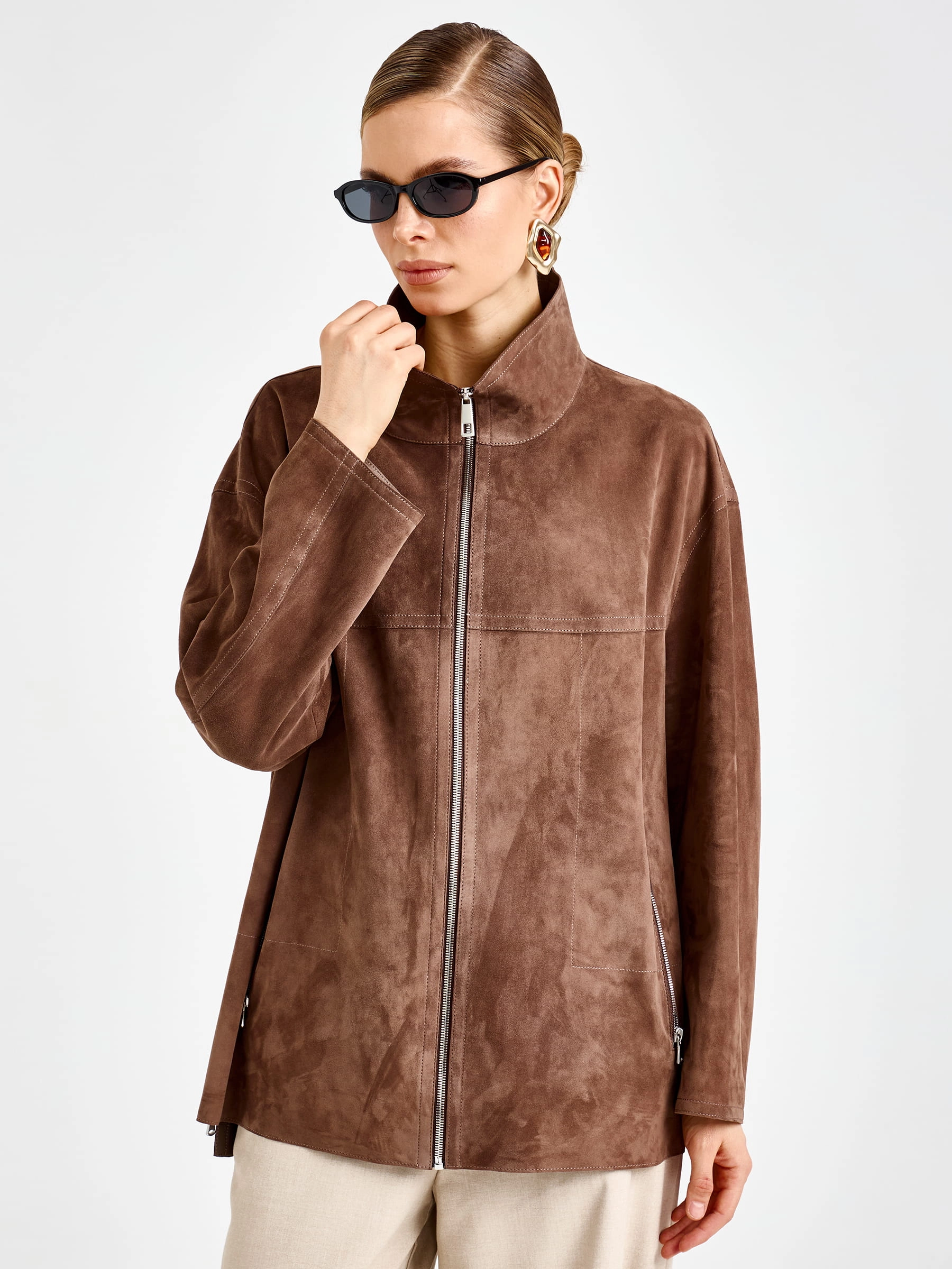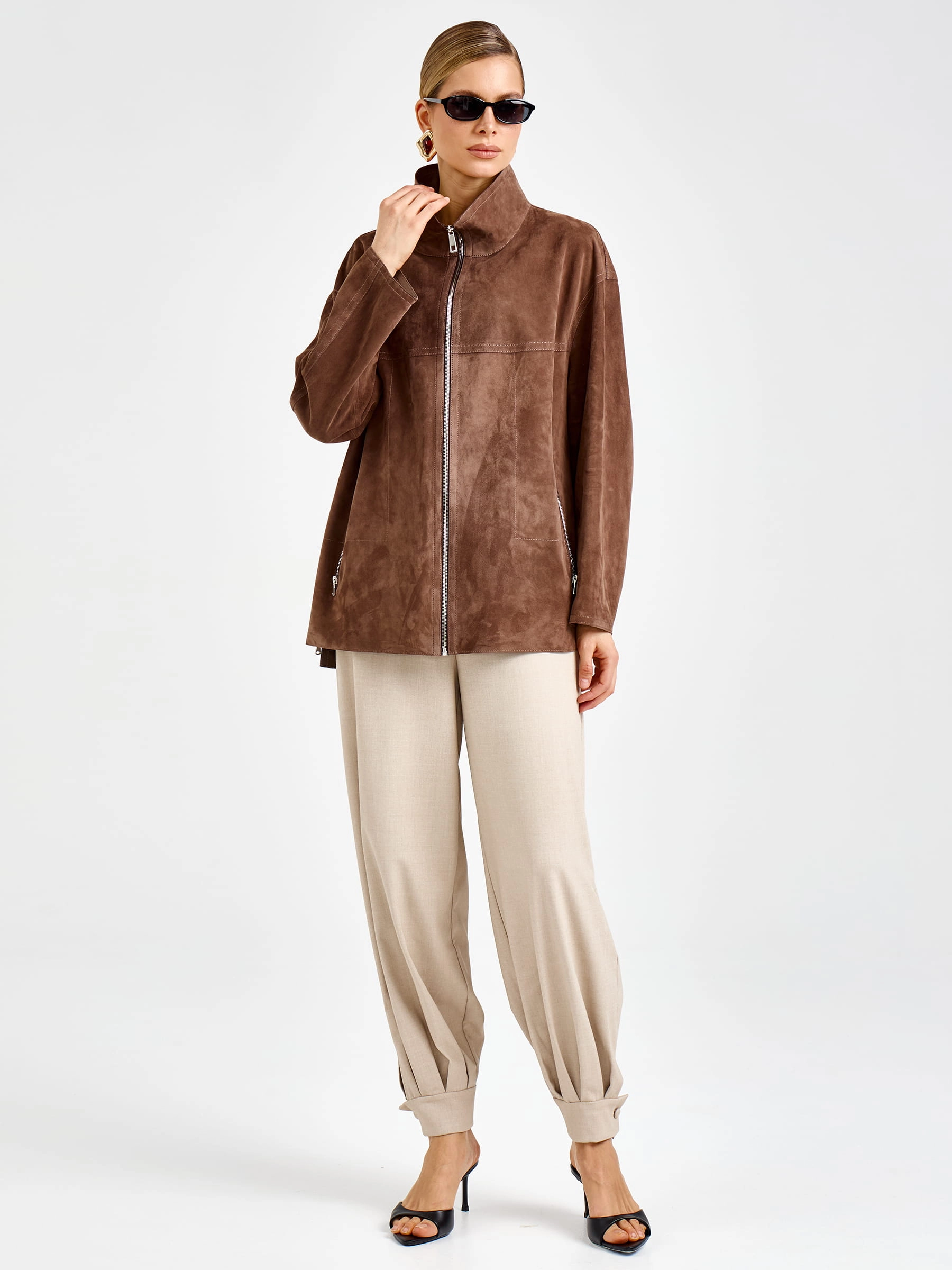 Товар замшевая женская куртка премиум класса 3090з, светло-коричневая, размер 42, артикул 92360 выполнен из натуральной замши с застежкой молния. Рассчитан на сезон: весна-лето. Длина изделия 74 см, силуэт свободный.