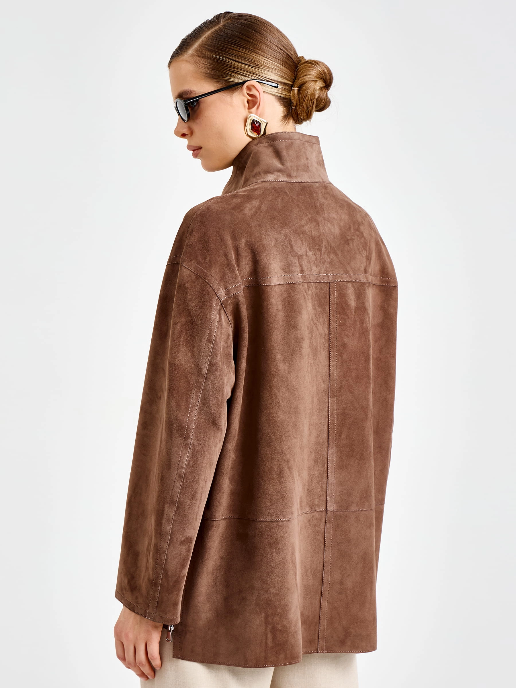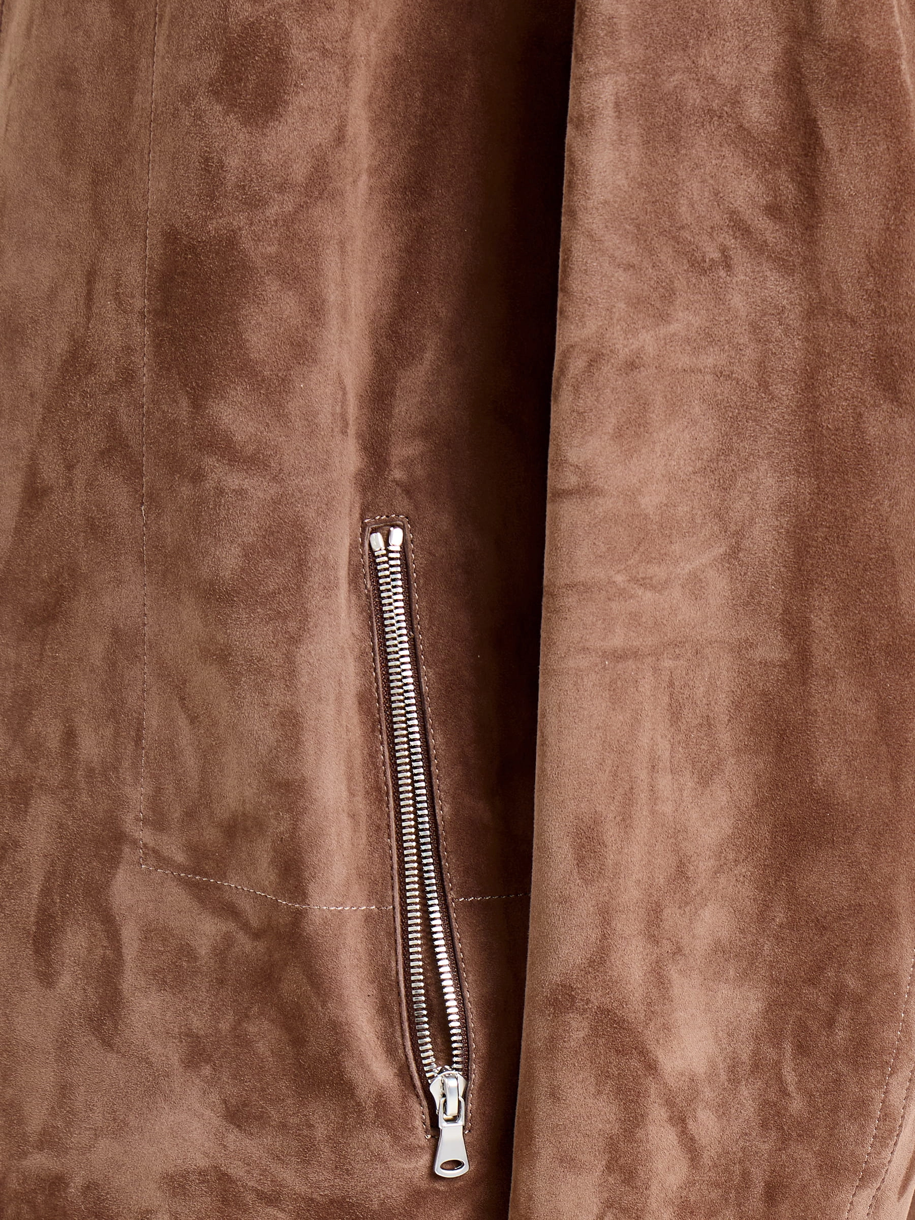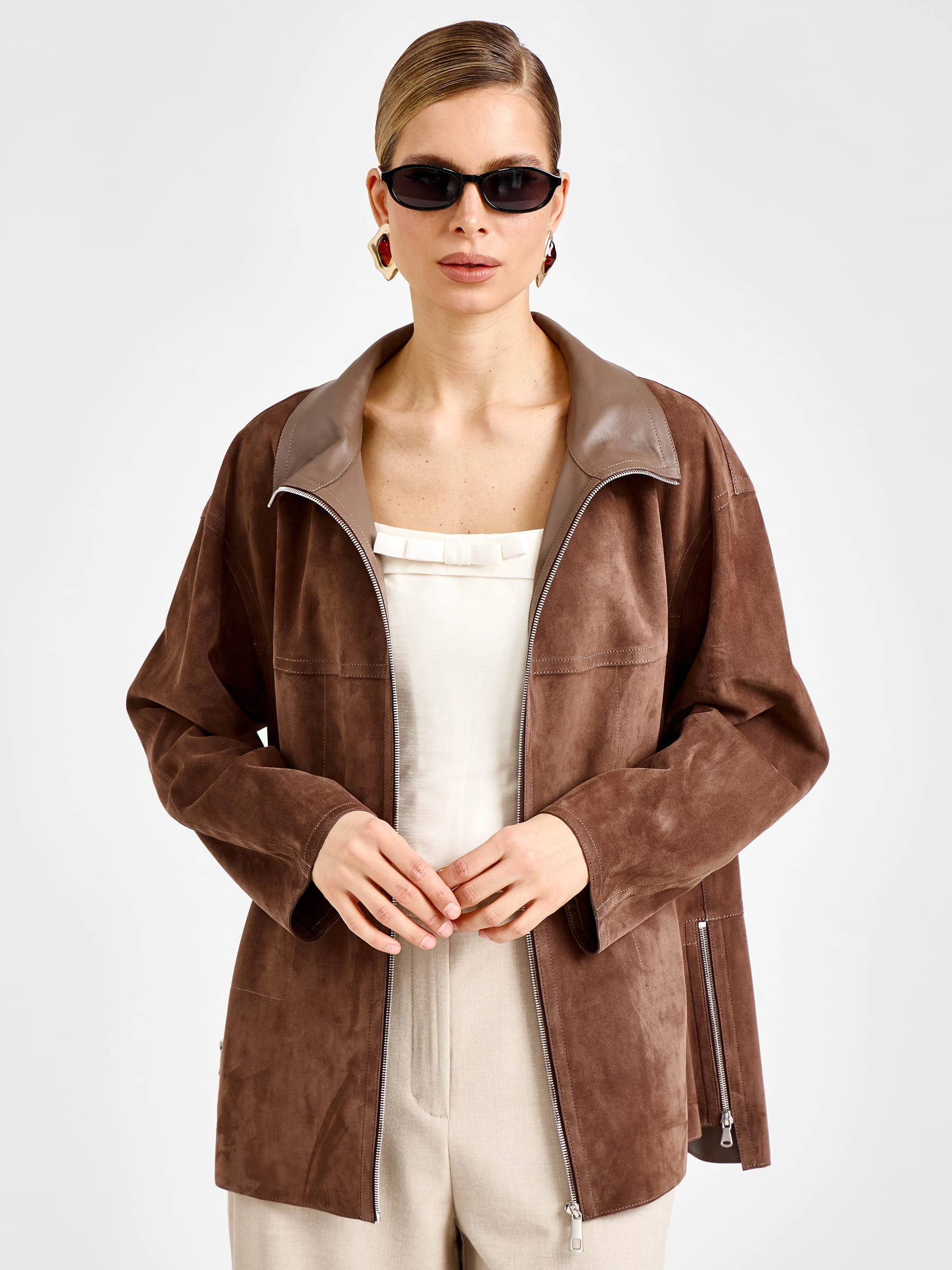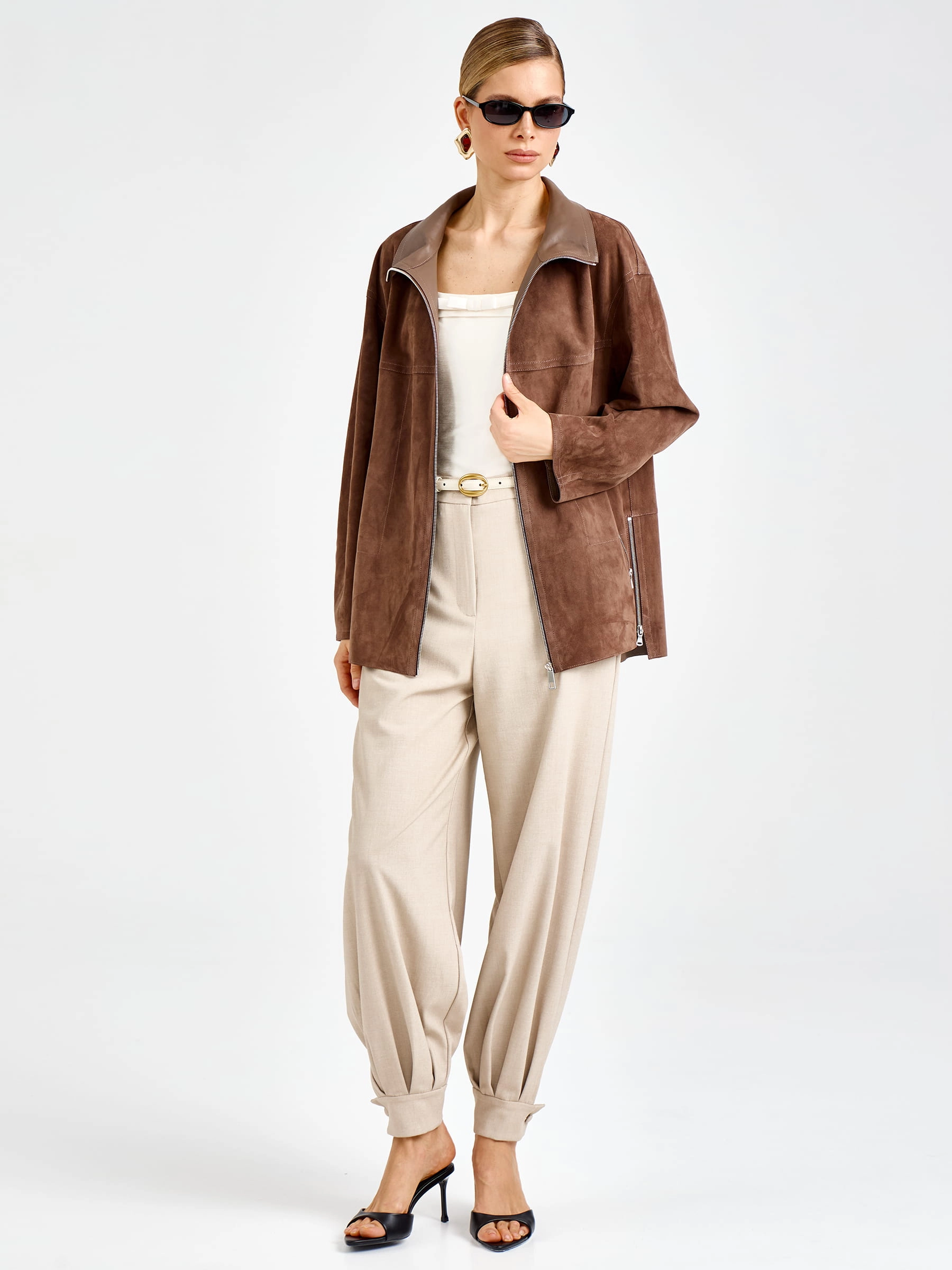 Товар замшевая женская куртка премиум класса 3090з, светло-коричневая, размер 42, артикул 92360 выполнен из натуральной замши с застежкой молния. Рассчитан на сезон: весна-лето. Длина изделия 74 см, силуэт свободный.