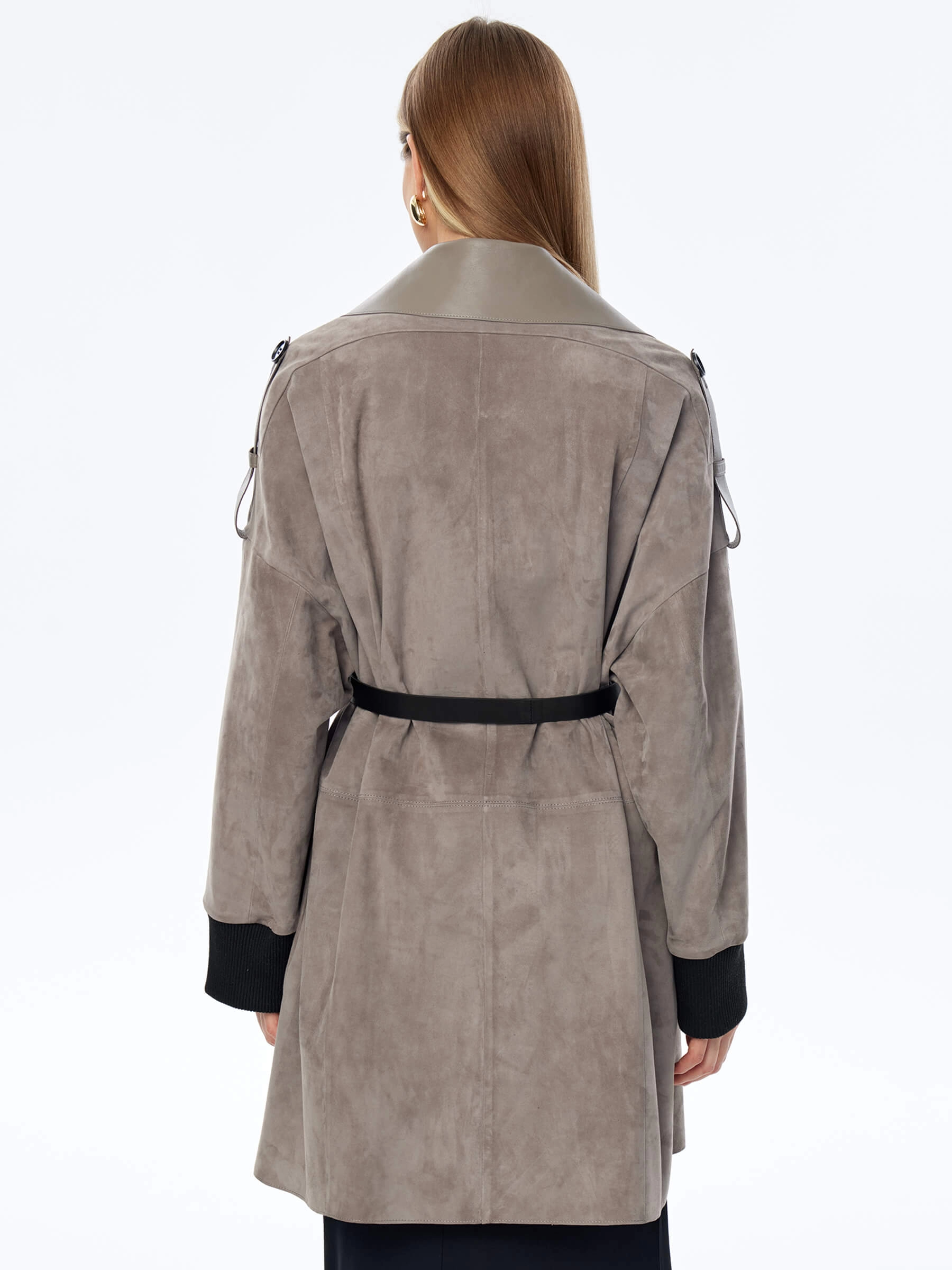 Стильный женственный образ подчеркнет укороченный плащ выполненный из тонкой натуральной замши премиум класса. Свободный силуэт изделия удобно садится по фигуре не сковывая движения. Английский воротник. Спущенная линия плеч. Дополнительный комфорт рукавам добавят плотные трикотажные манжеты. Модель дополнили накладными карманами с клапанами и узким поясом.