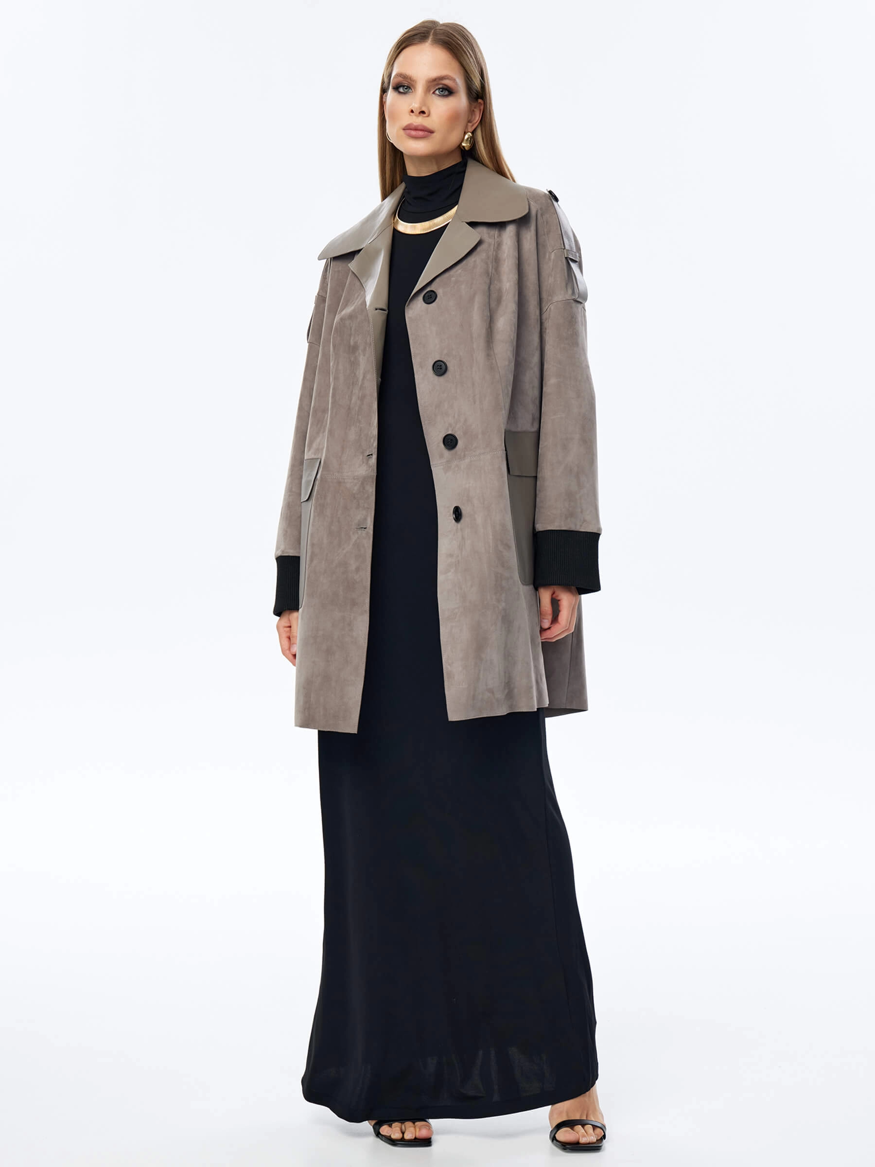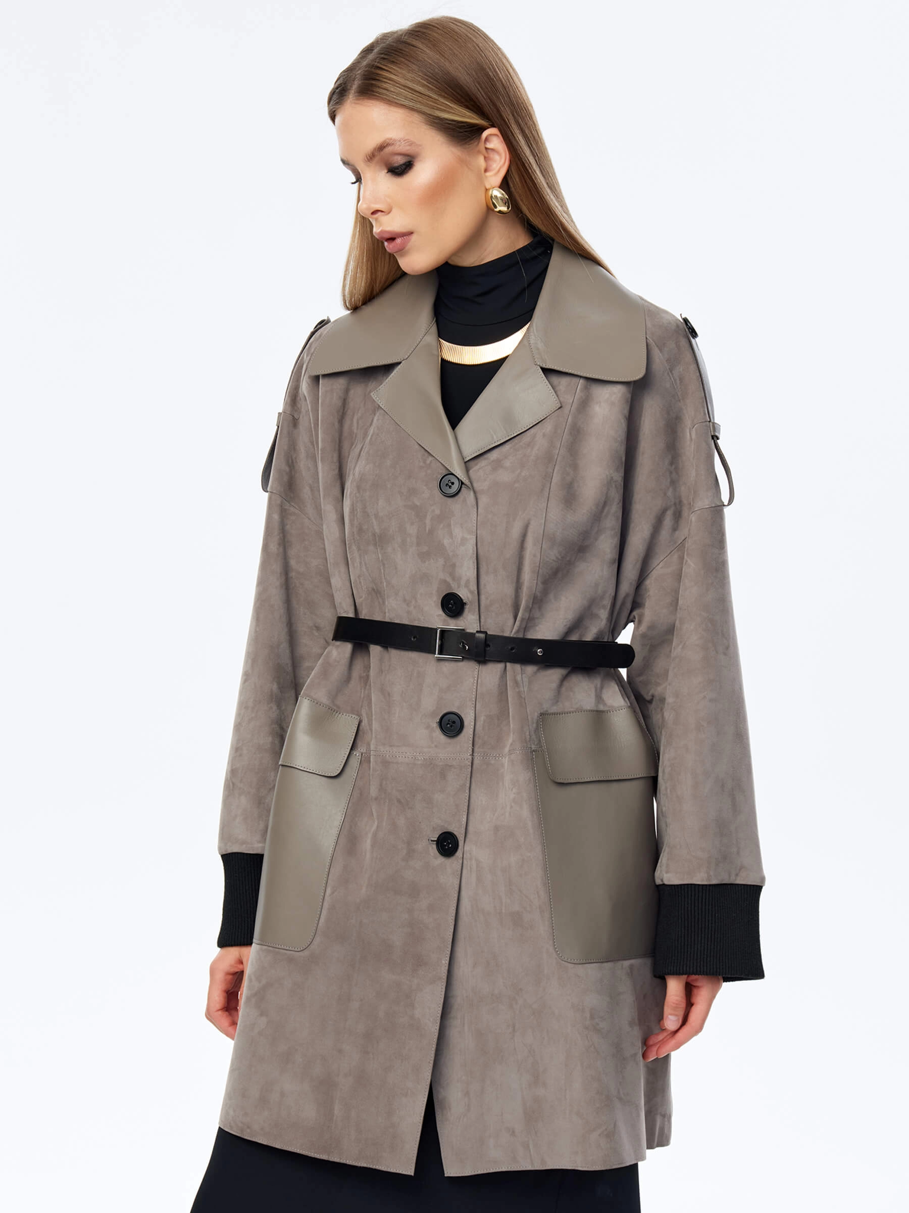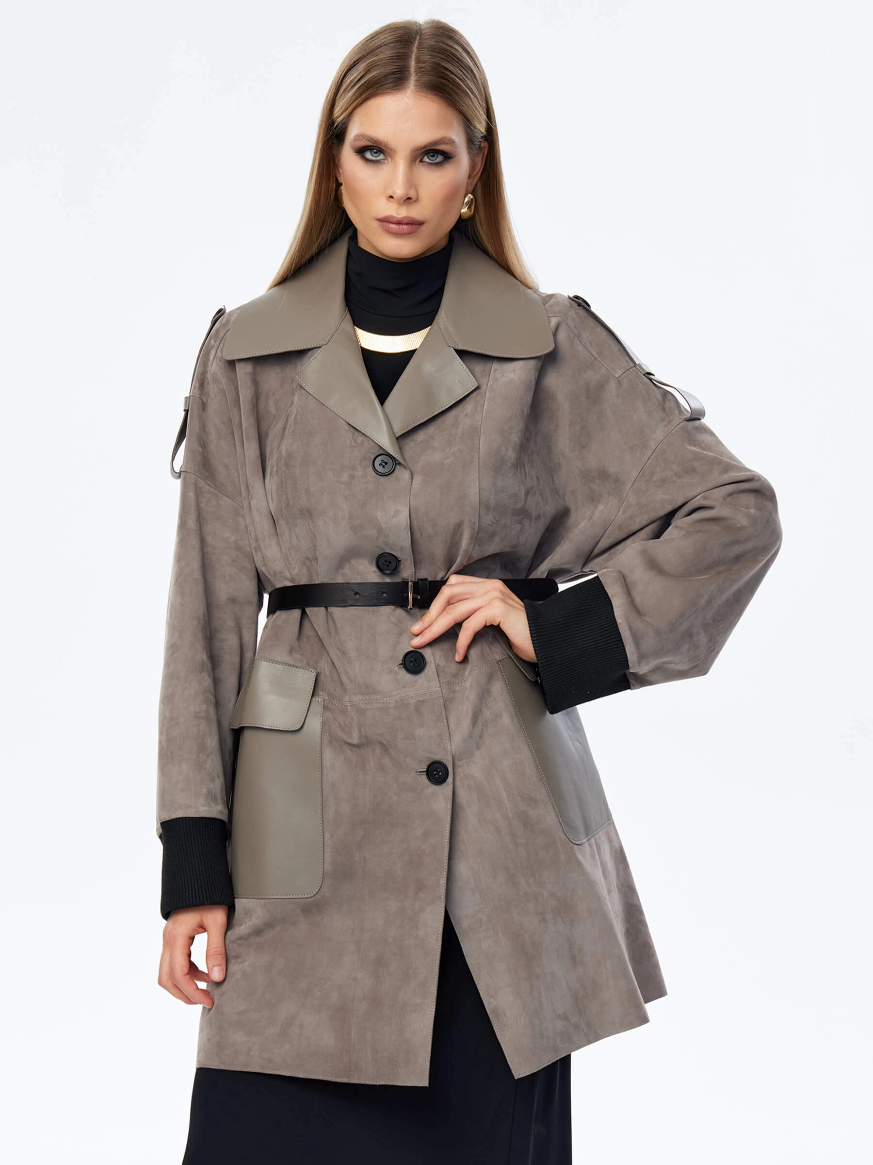 Товар замшевый короткий женский плащ оверсайз с поясом премиум класса 3063з, серый, размер 48, артикул 23730 выполнен из натуральной замши с застежкой пуговицы. Рассчитан на сезон: весна-лето. Длина изделия 93 см, силуэт свободный.