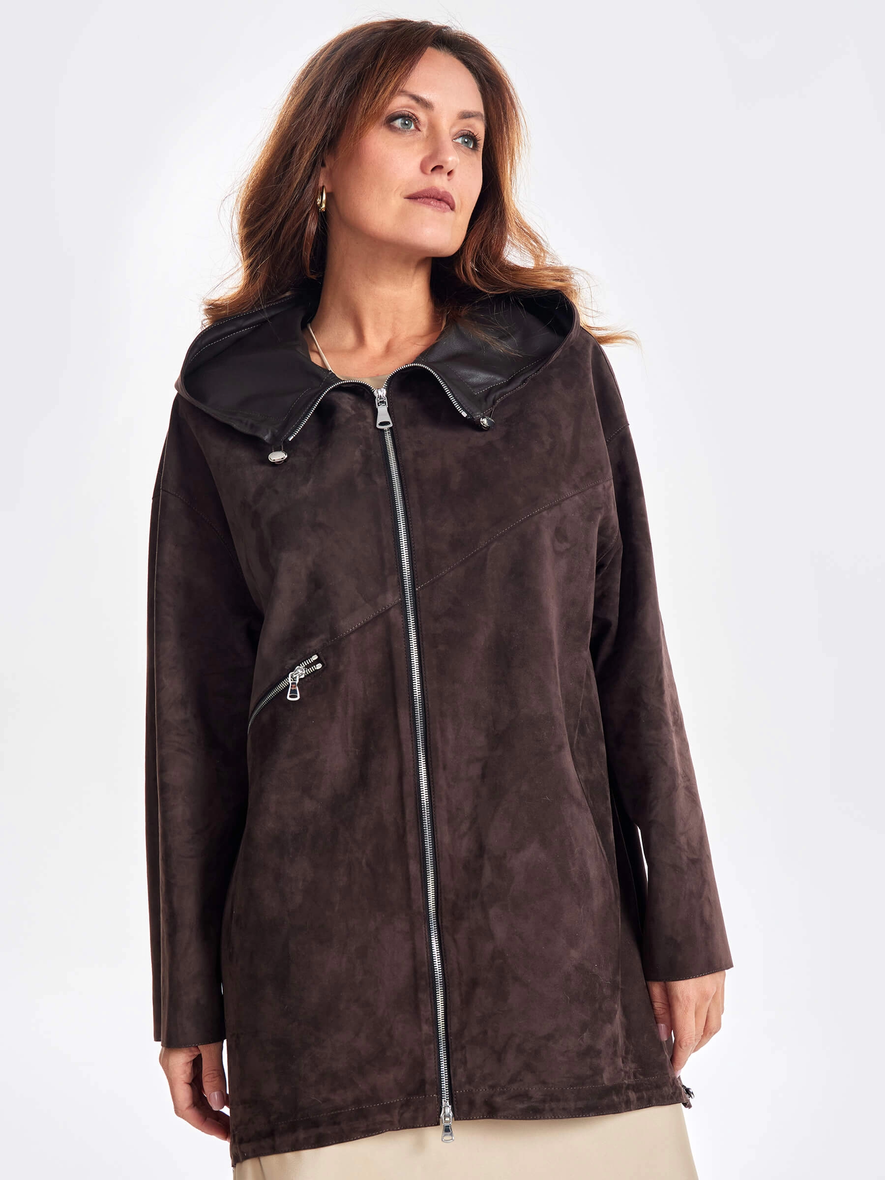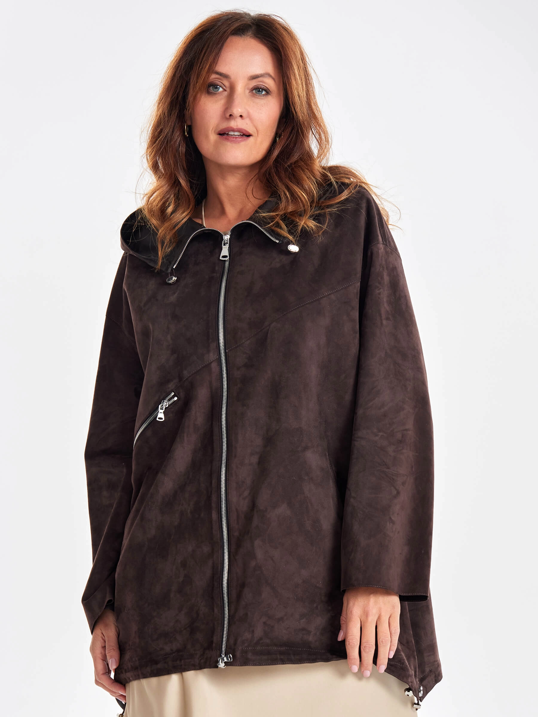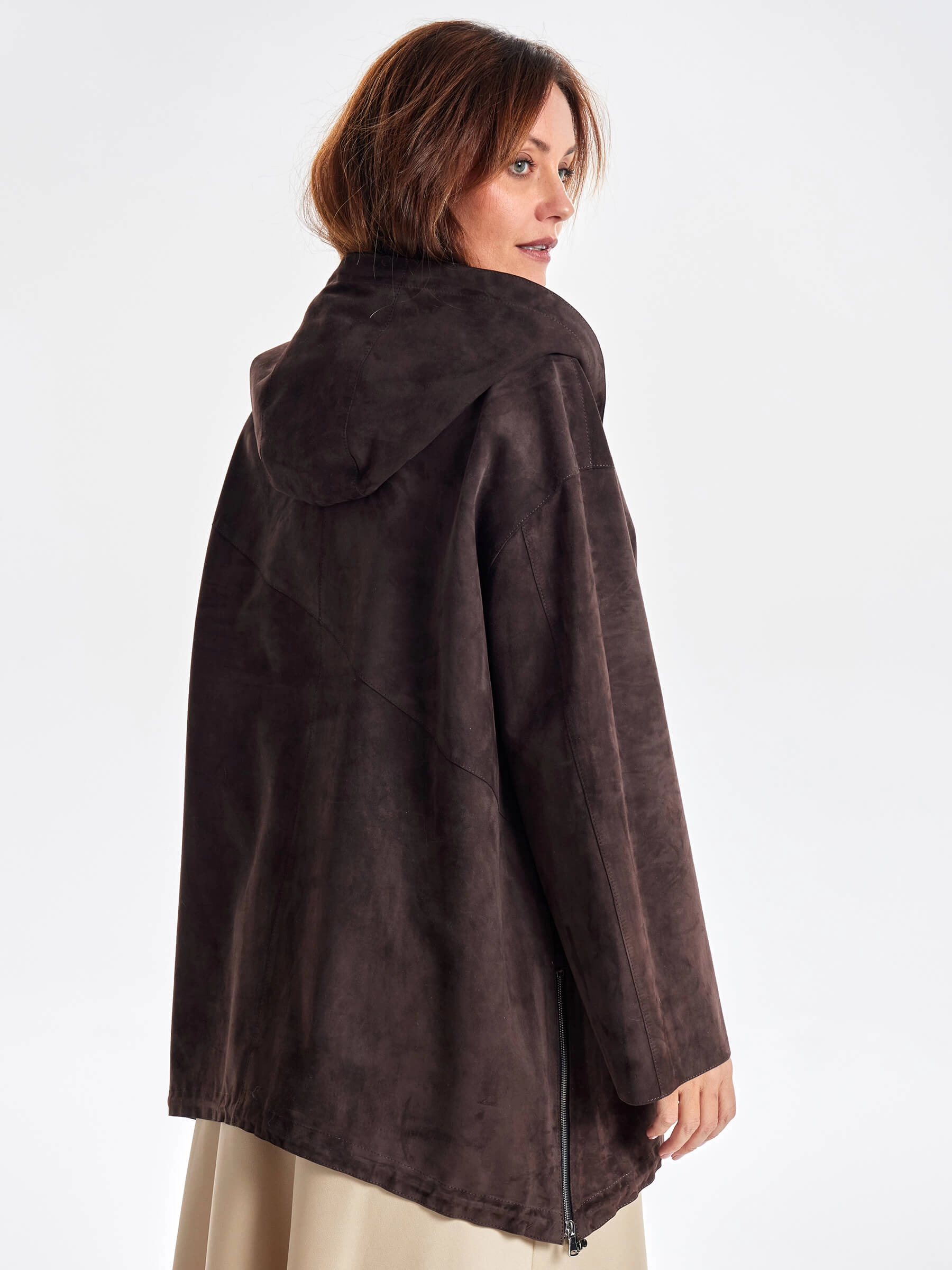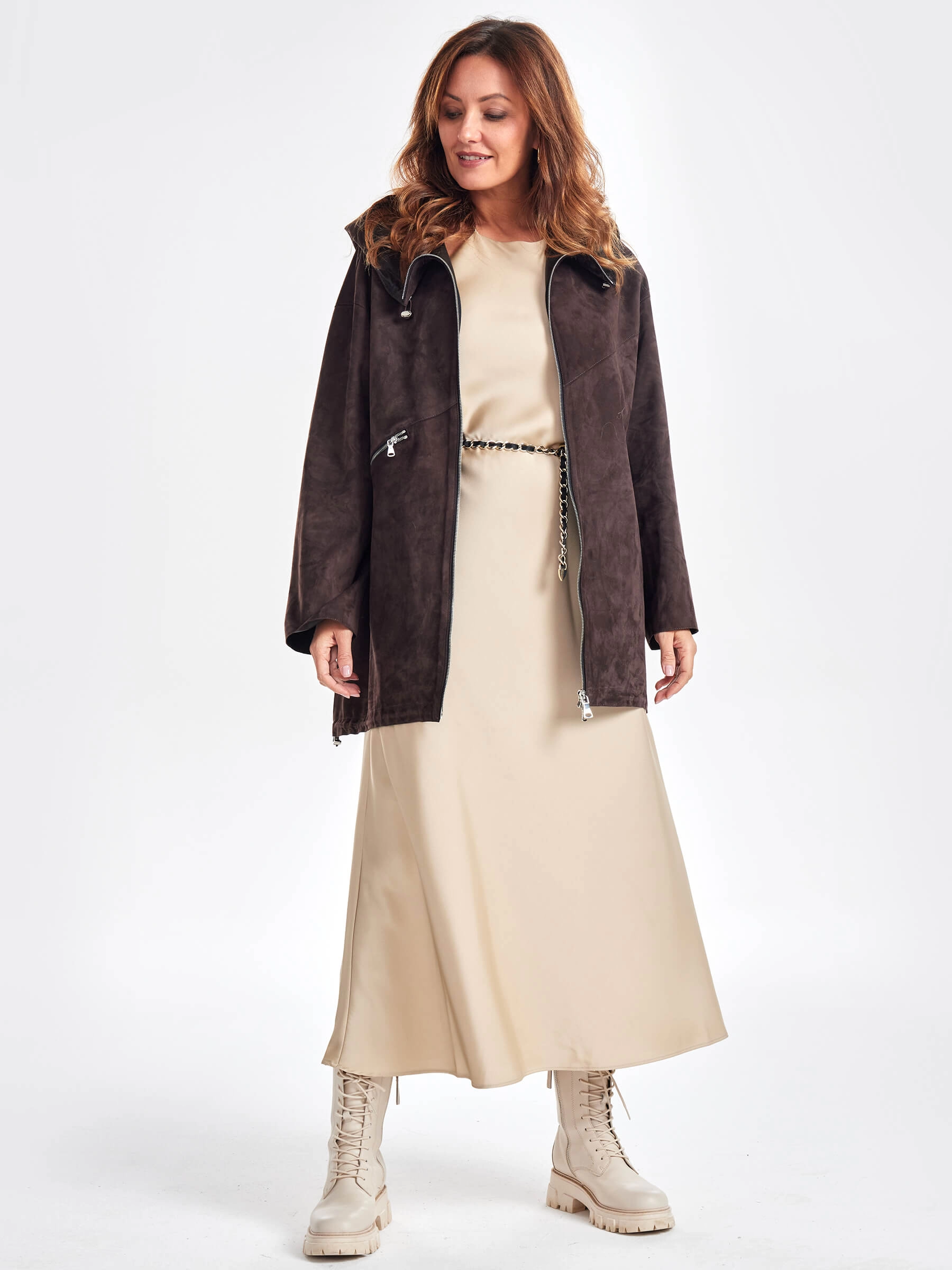 Замшевый женский плащ оверсайз на молнии с капюшоном премиум класса 3053з, коричневый, размер 48, артикул 23470