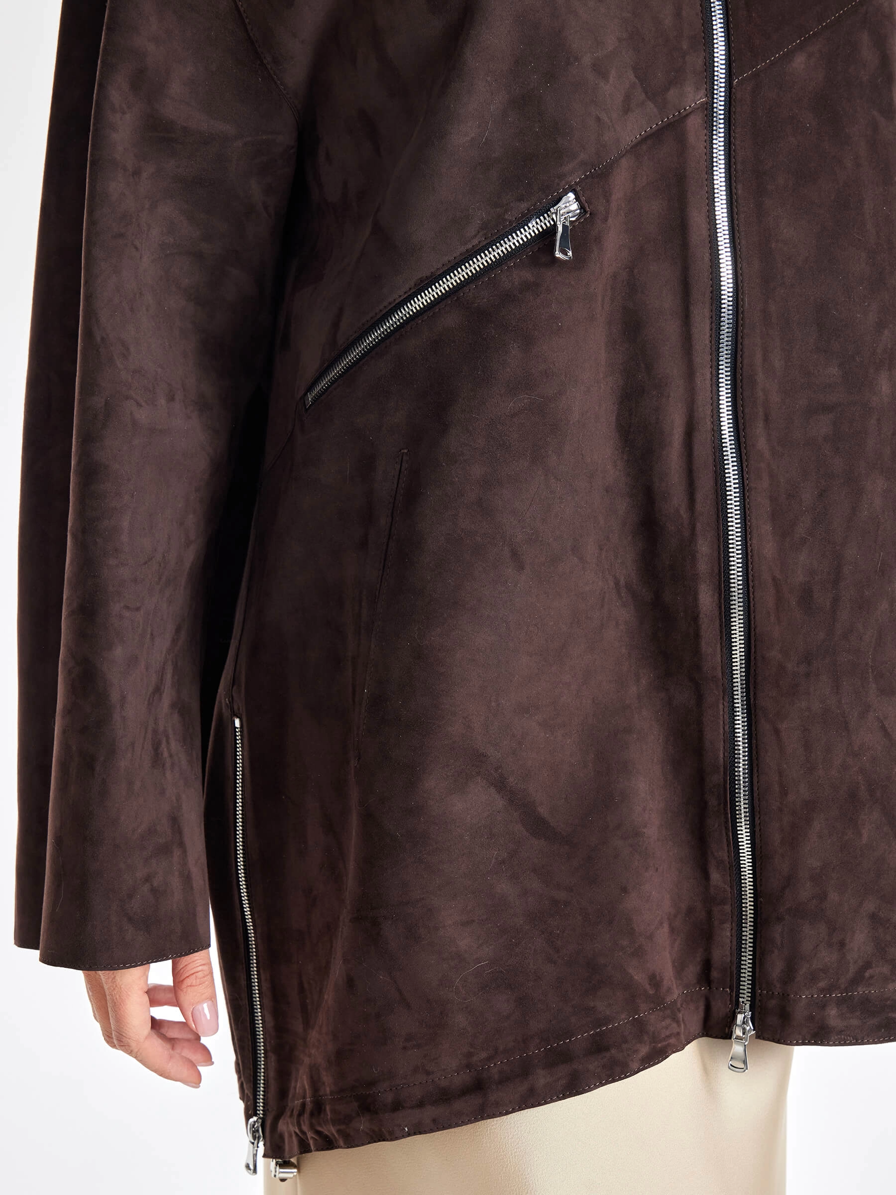 Этот стиль подойдет дамам любого возраста. Главная черта этой куртки комфорт и только комфорт! Для пошива модели с регулируемыми глубоким капюшоном и низом, мастера использовали нежную натуральную замшу премиум класса. Свободный крой, два врезных кармана, боковые разрезы как и сама модель застегиваются крупными молниями. Акцент сделали на асимметричный декоративный карман.
