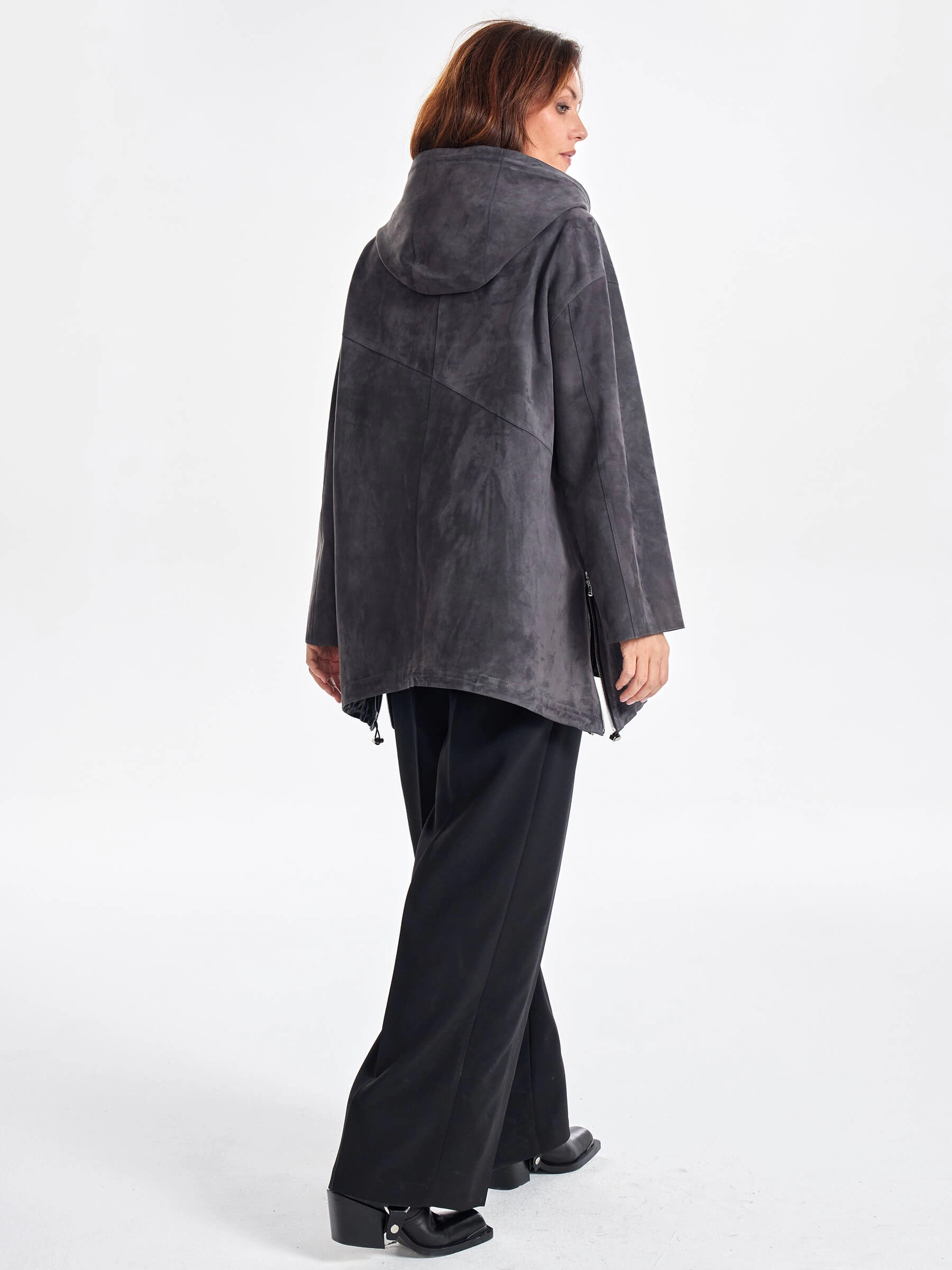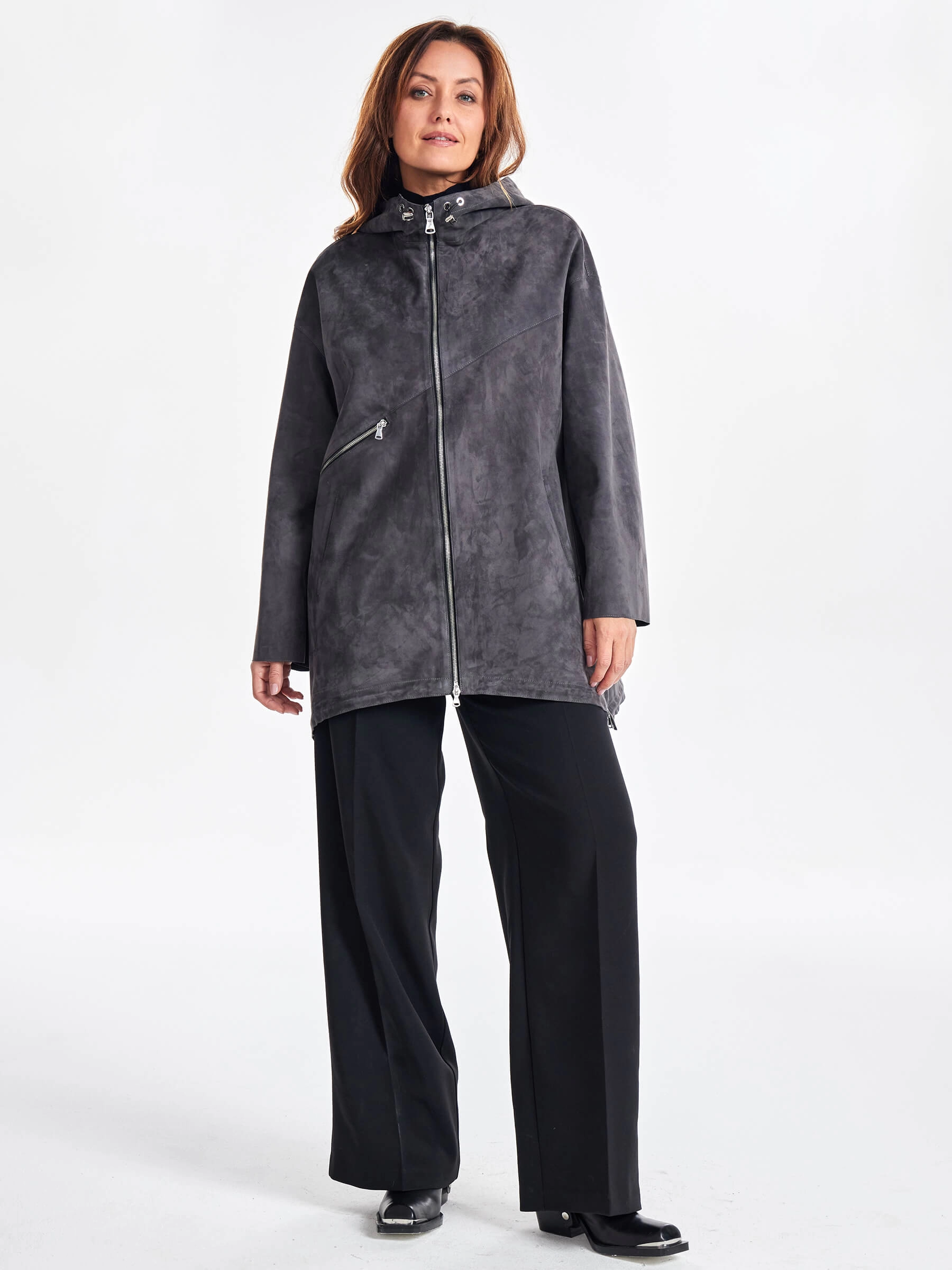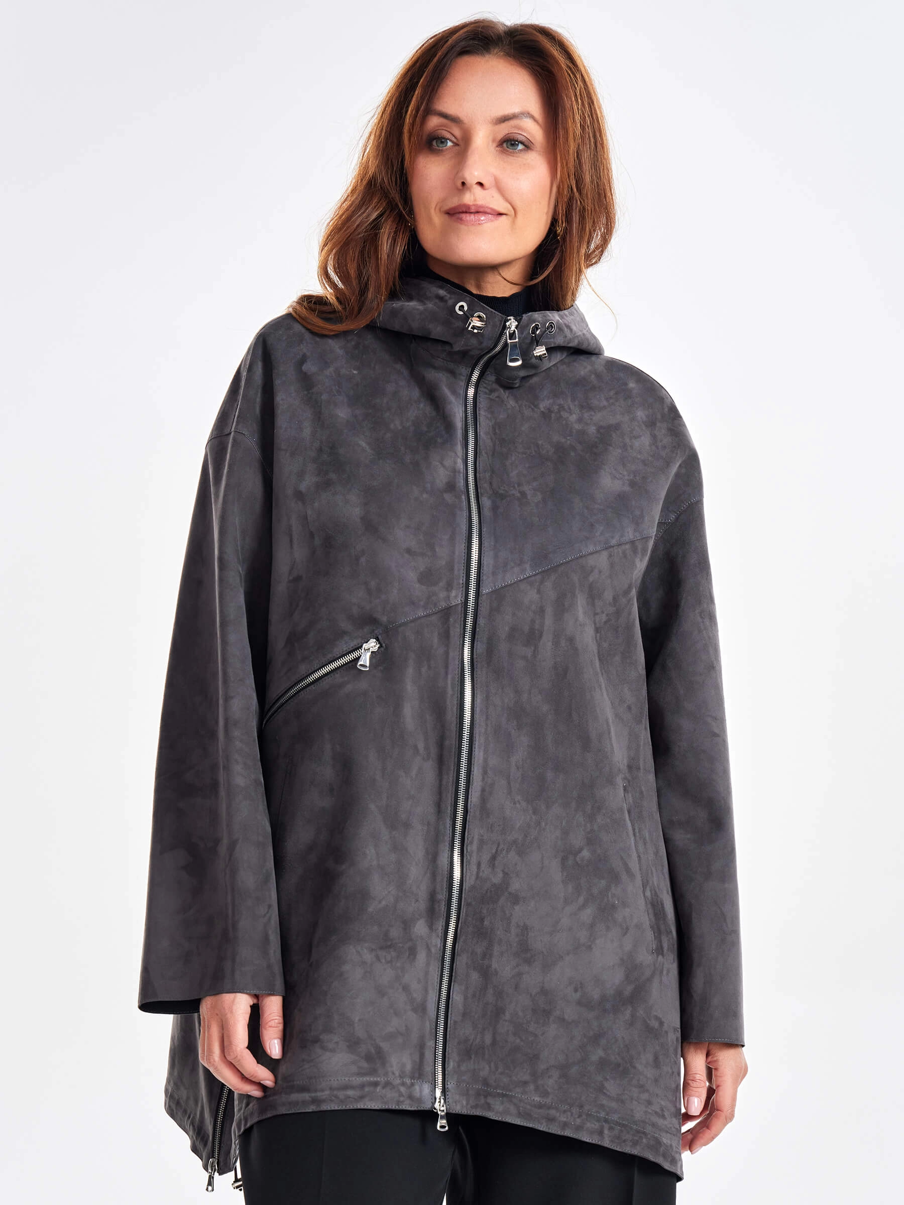 Замшевый женский плащ оверсайз на молнии с капюшоном премиум класса 3053з, темно-серый, размер 48, артикул 23480