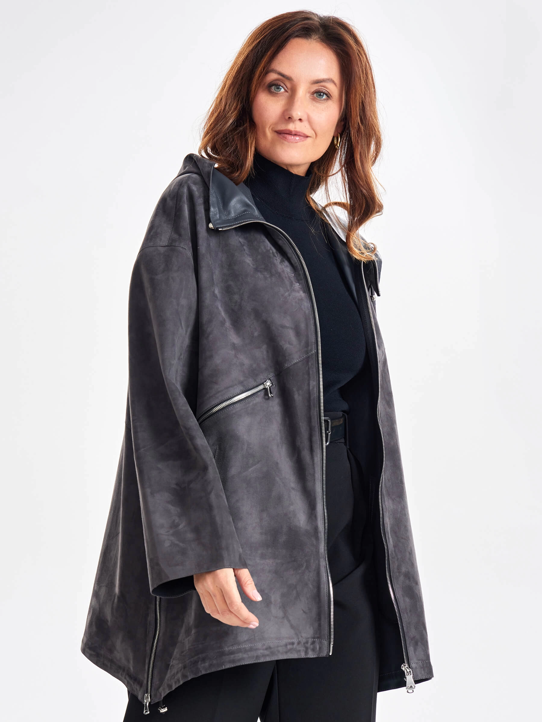 Товар замшевый женский плащ оверсайз на молнии с капюшоном премиум класса 3053з, темно-серый, размер 48, артикул 23480 выполнен из натуральной замши с застежкой молния. Рассчитан на сезон: весна-лето. Длина изделия 75 см, силуэт оверсайз.