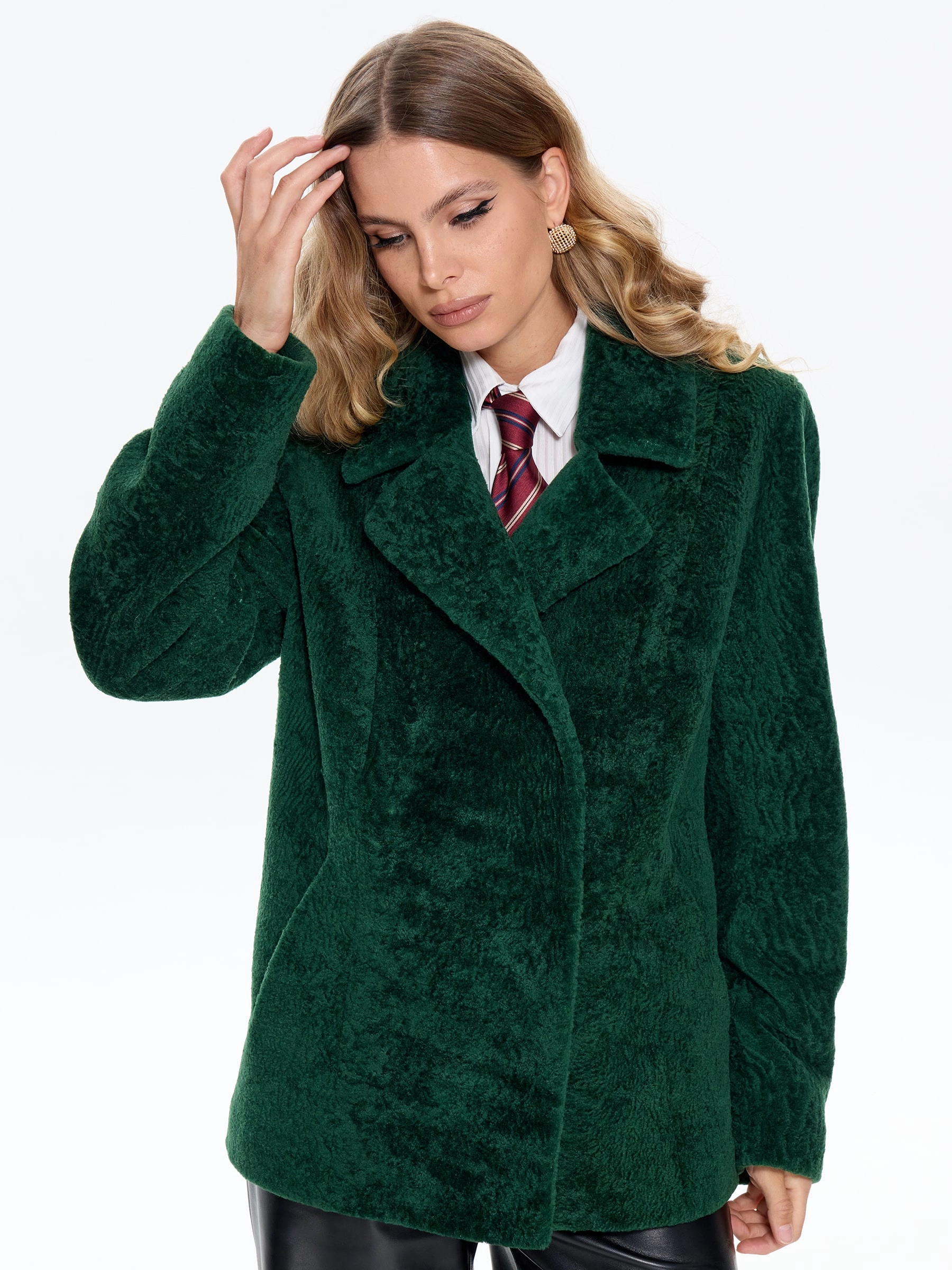 Товар зеленая дубленка из астрагана 58мех, размер 46, артикул 64760 выполнен из астраган с застежкой кнопки. Рассчитан на сезон: осень-зима. Длина изделия 70 см, силуэт прямой.