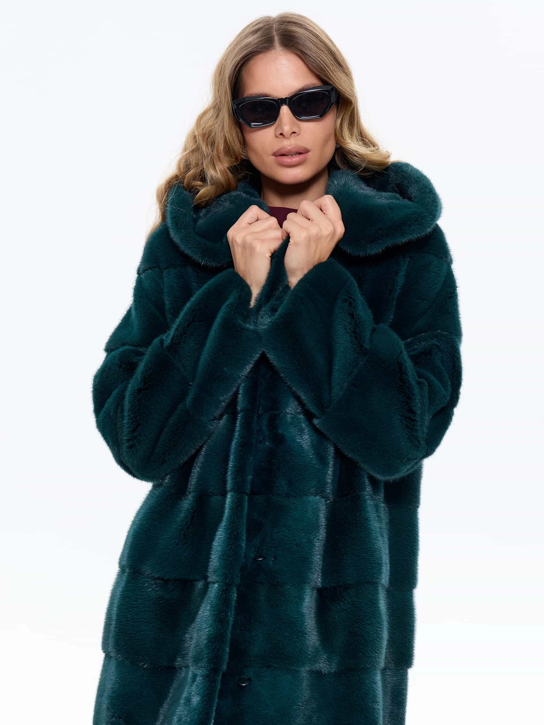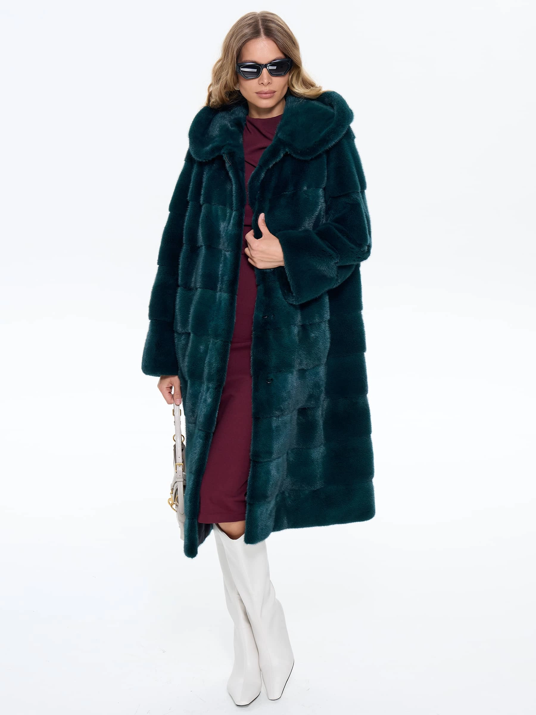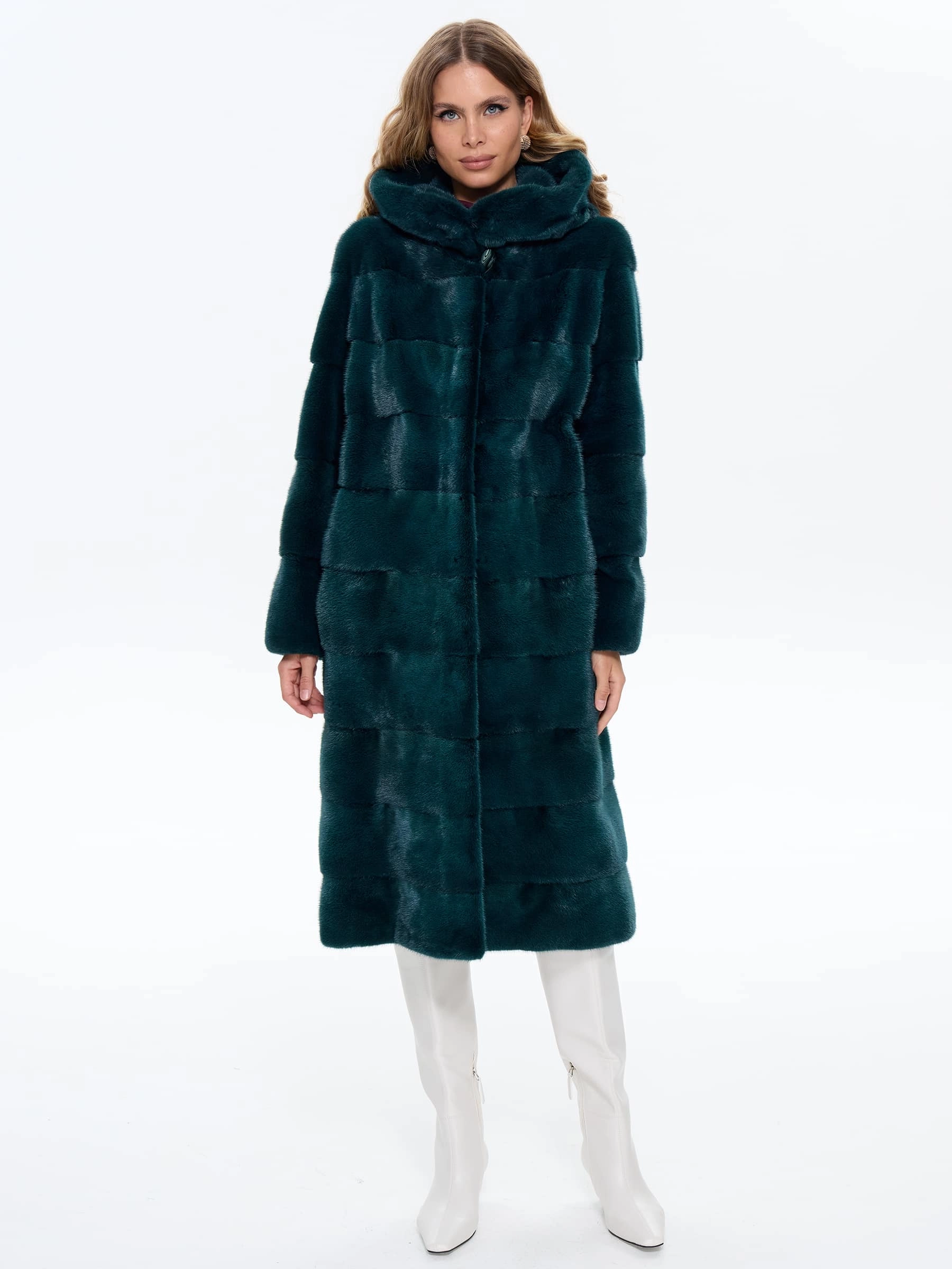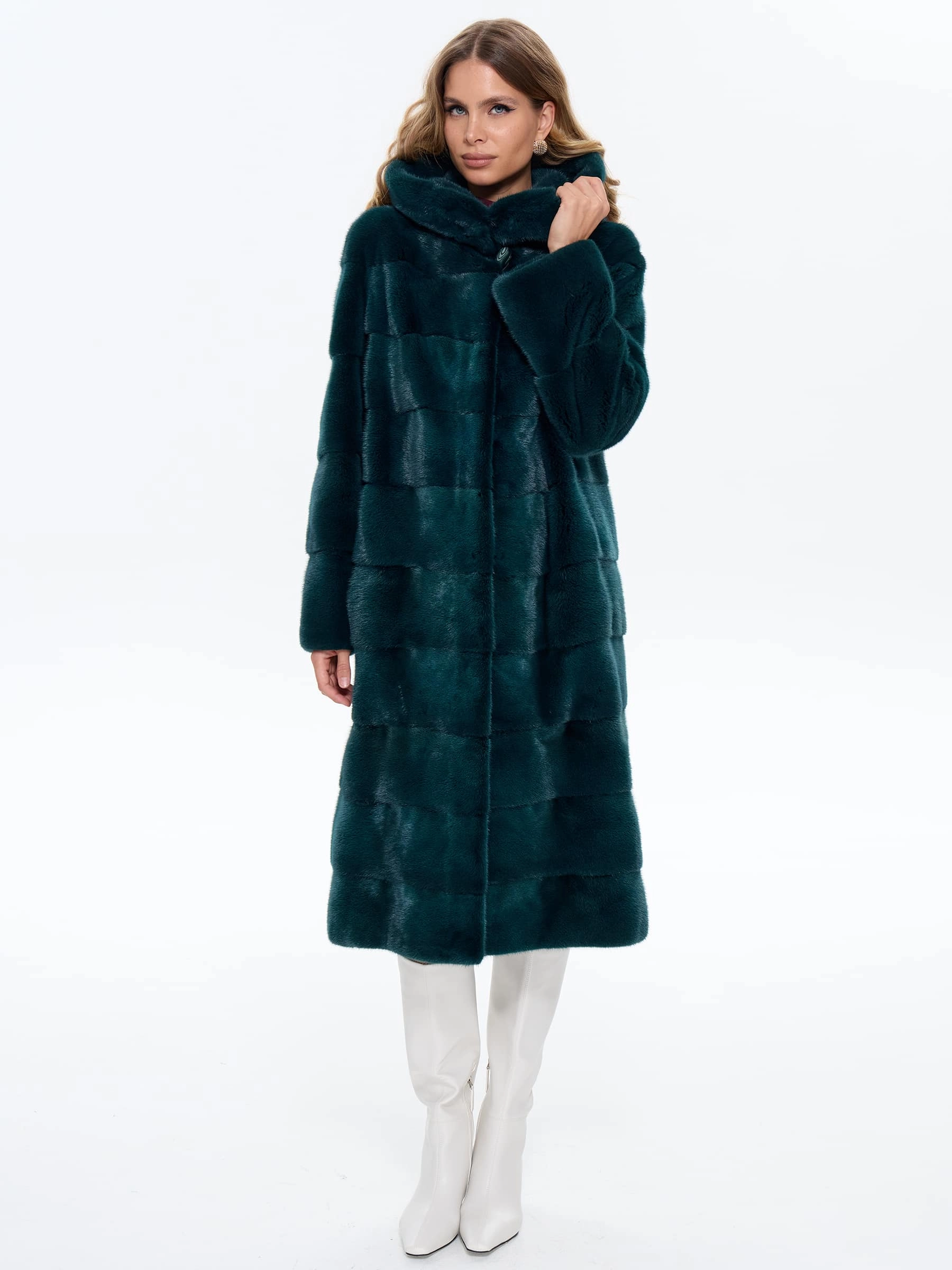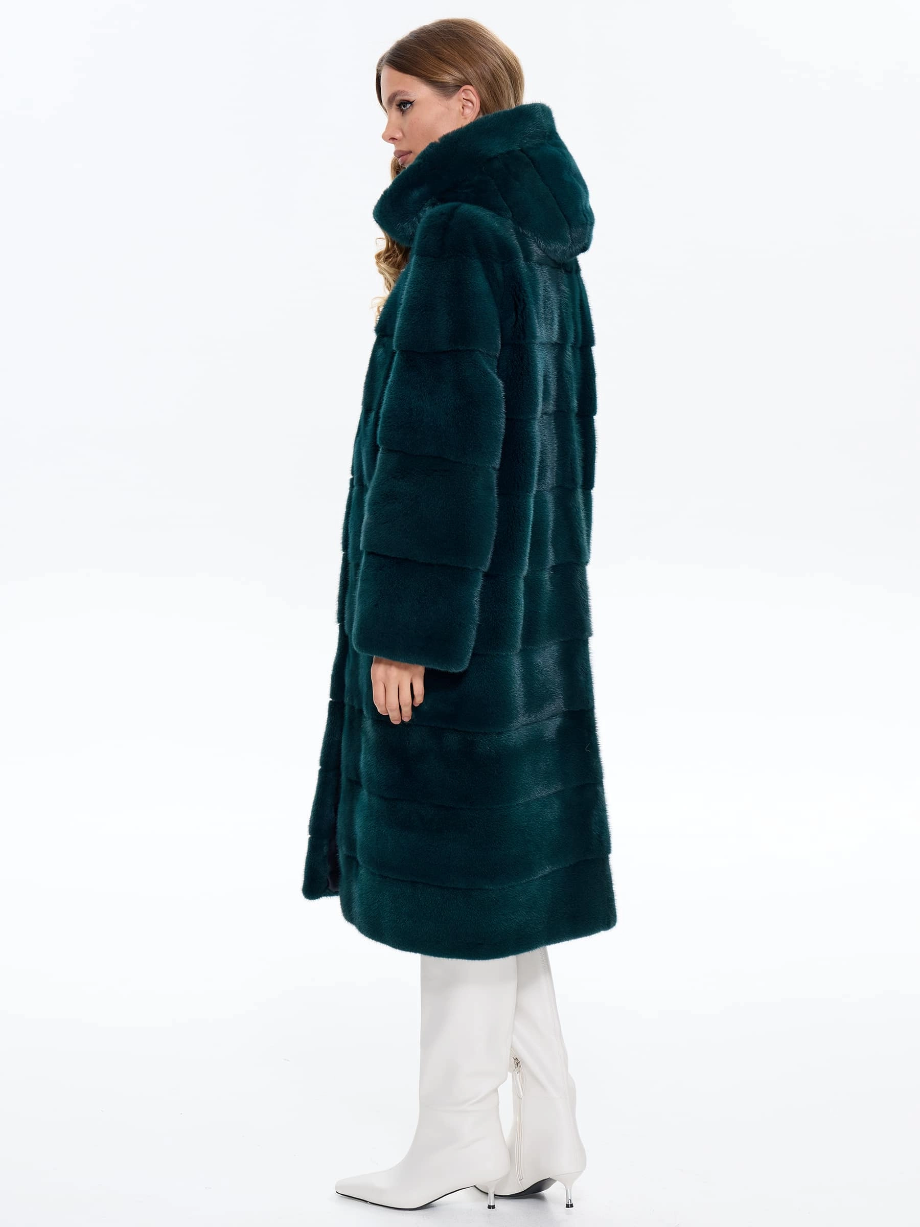 Длинная зеленая шуба из низковорсовой густой норки станет отличным решением для холодной зимы. Прямой крой, поперечная раскладка меха. Модель дополнили глубоким капюшоном. Изделие получилось теплым и легким.