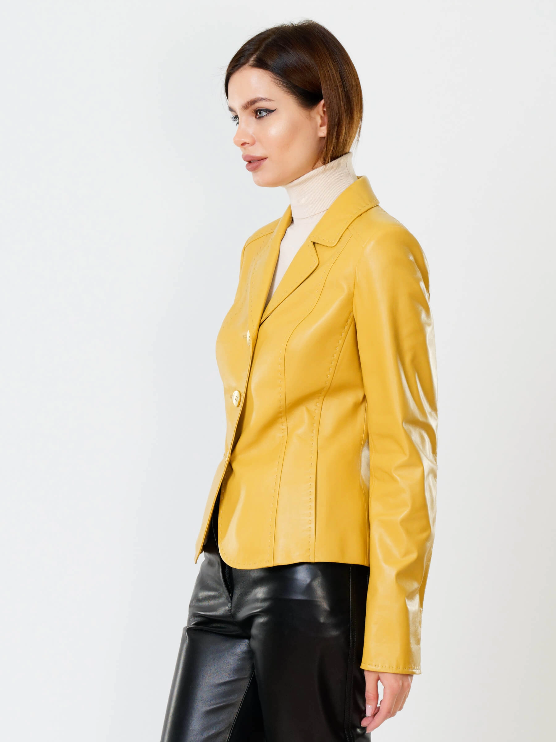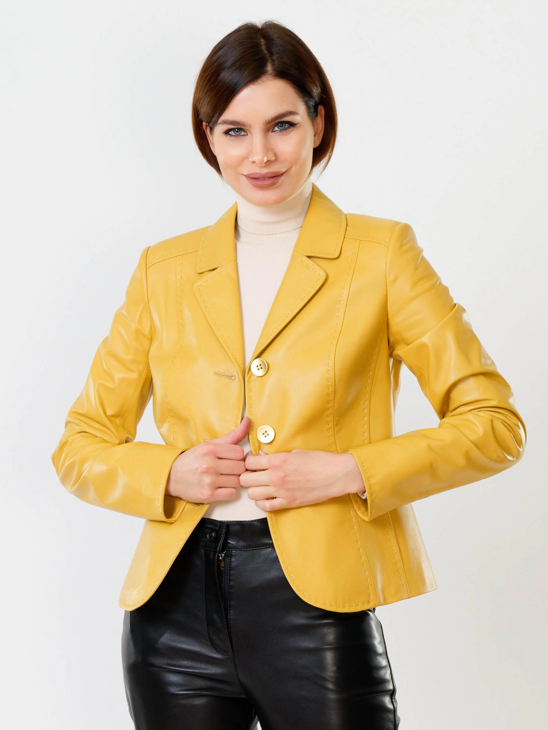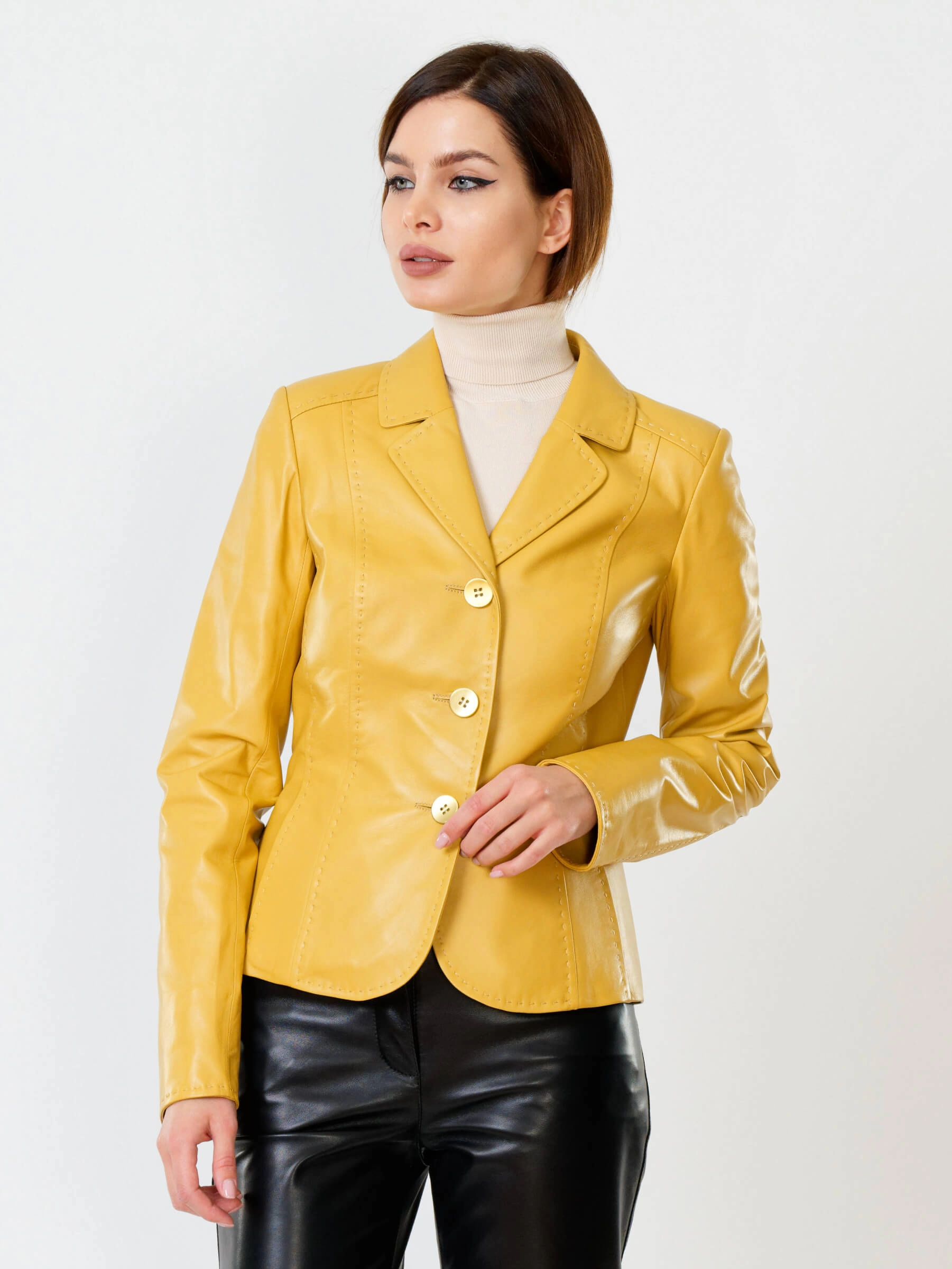 Товар желтый кожаный пиджак для женщин премиум класса 316рс, размер 44, артикул 90090 выполнен из натуральной кожи с застежкой пуговицы. Рассчитан на сезон: весна-лето. Длина изделия 60 см, силуэт приталенный .
