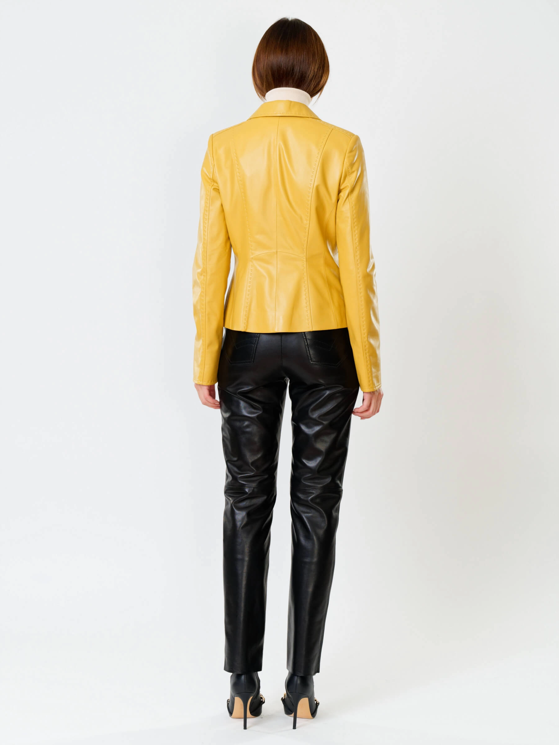 Изысканный желтый кожаный пиджак премиум-класса с полуприлегающим силуэтом длиной 50 см и классическим английским воротником — воплощение элегантности для весенне-летнего сезона. Роскошная натуральная кожа высочайшего качества с изящной ручной стежкой и врезными карманами создает безупречную посадку, а классическая застежка на пуговицы подчеркивает утонченный стиль модели. Подкладка выполнена из качественного материала (53% вискоза, 47% полиэстер). Этот универсальный пиджак станет основой вашего гардероба: носите его с кожаными брюками для эффектного монохромного образа, с шелковыми платьями для контраста текстур или с джинсами для безупречного стиля смарт-кэжуал.