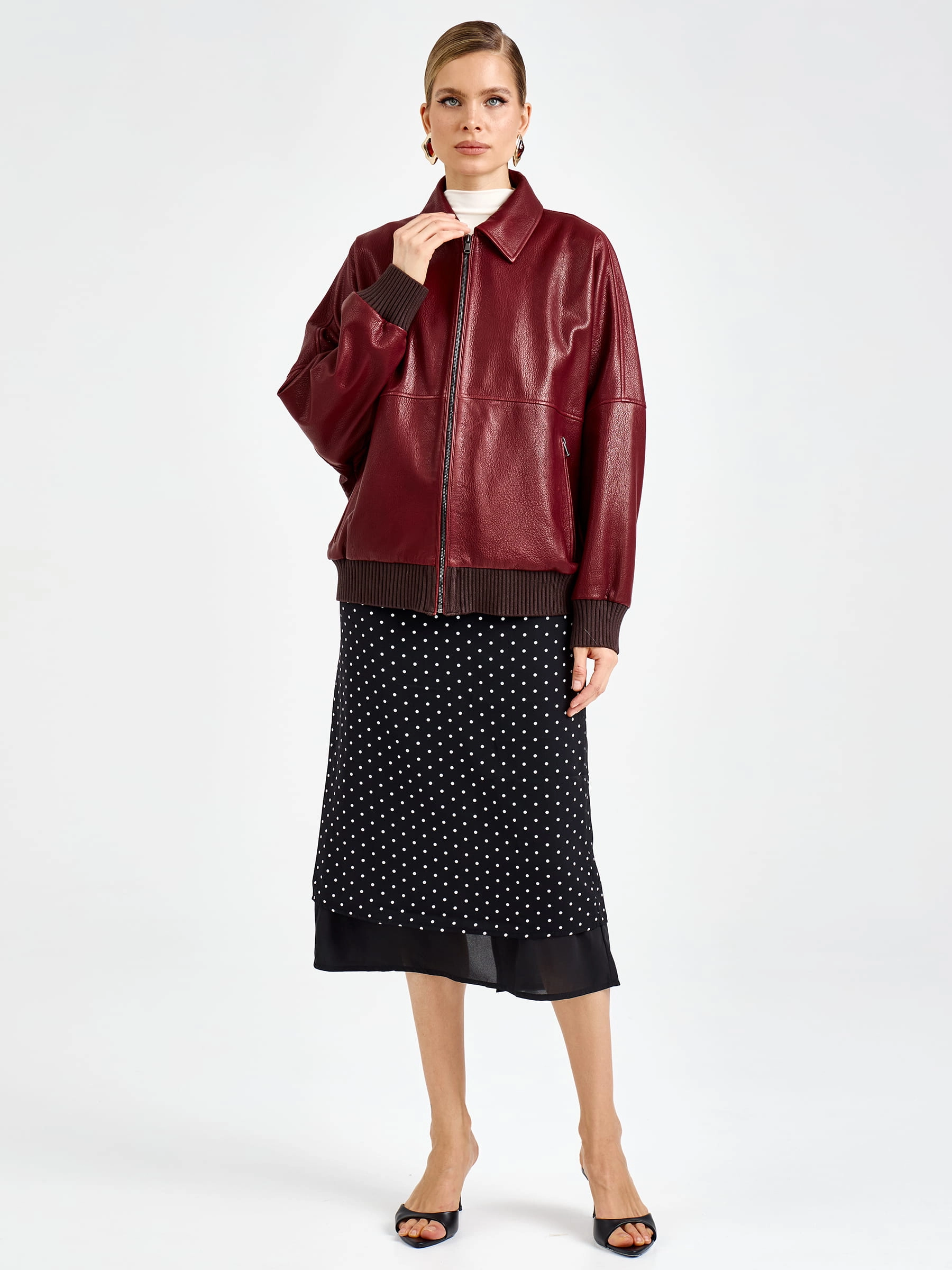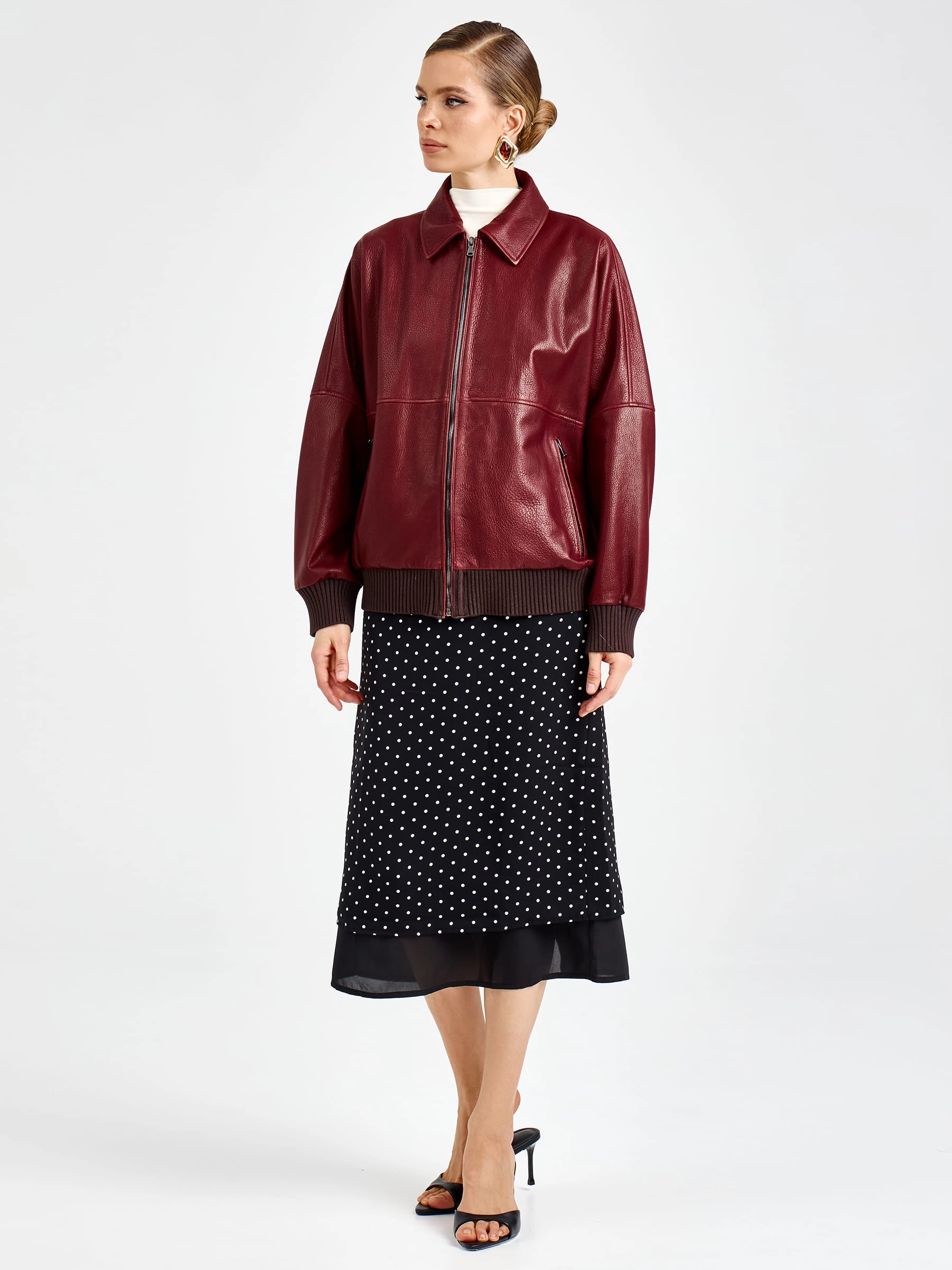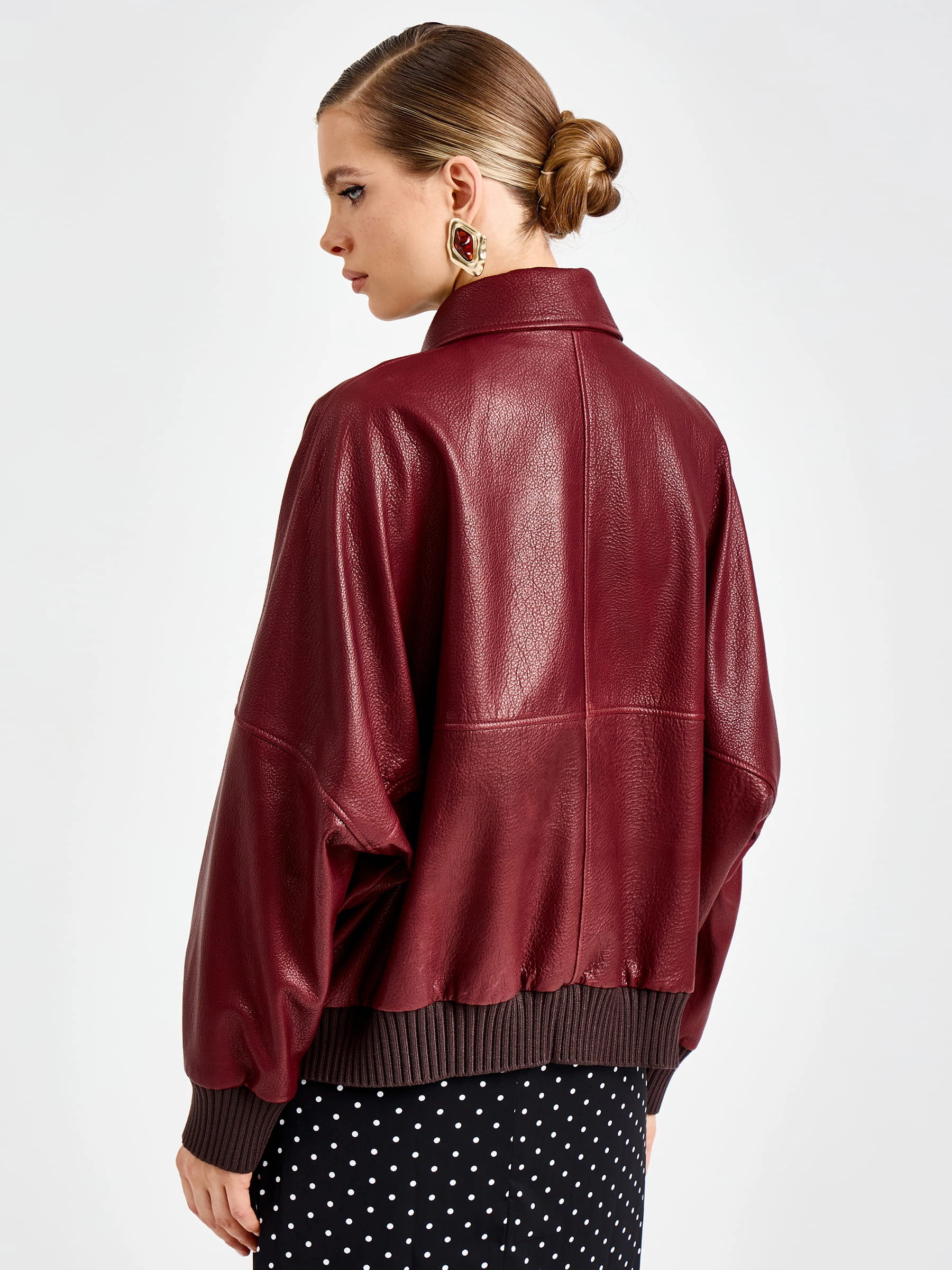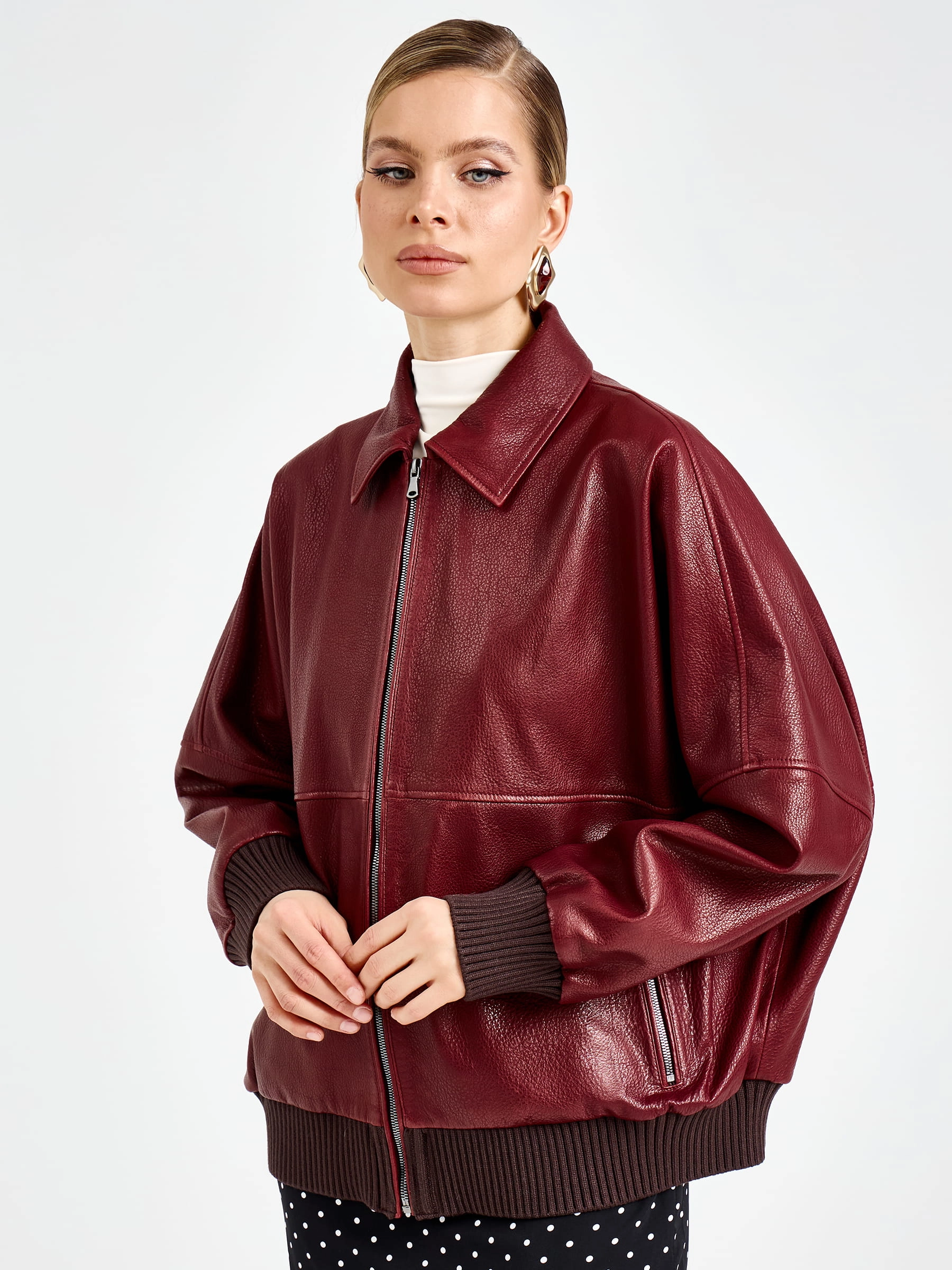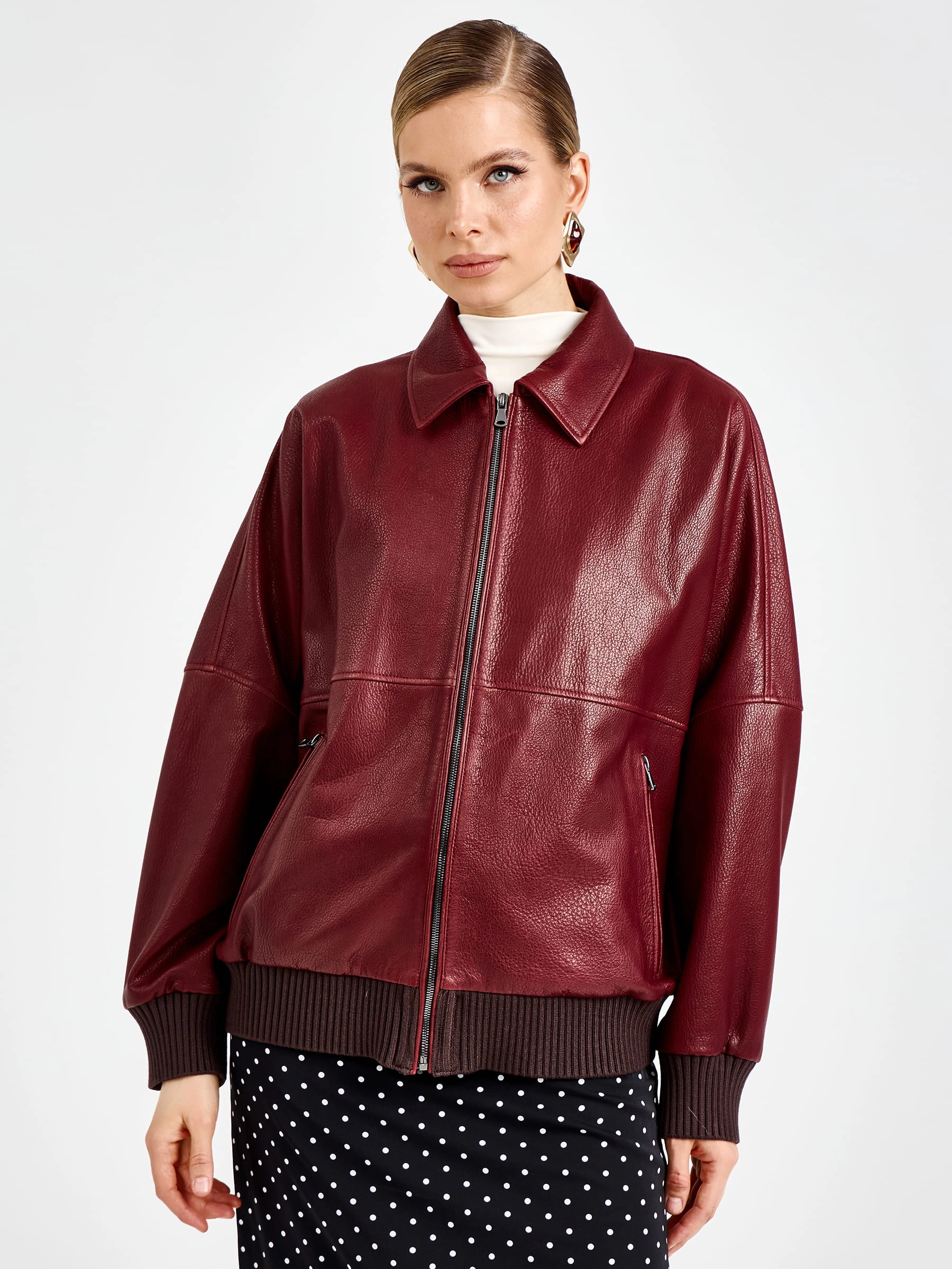 Товар женская бордовая кожаная куртка бомбер премиум класса 3106, размер 44, артикул 92170 выполнен из натуральной кожи с застежкой молния. Рассчитан на сезон: весна-лето. Длина изделия 60 см, силуэт свободный.