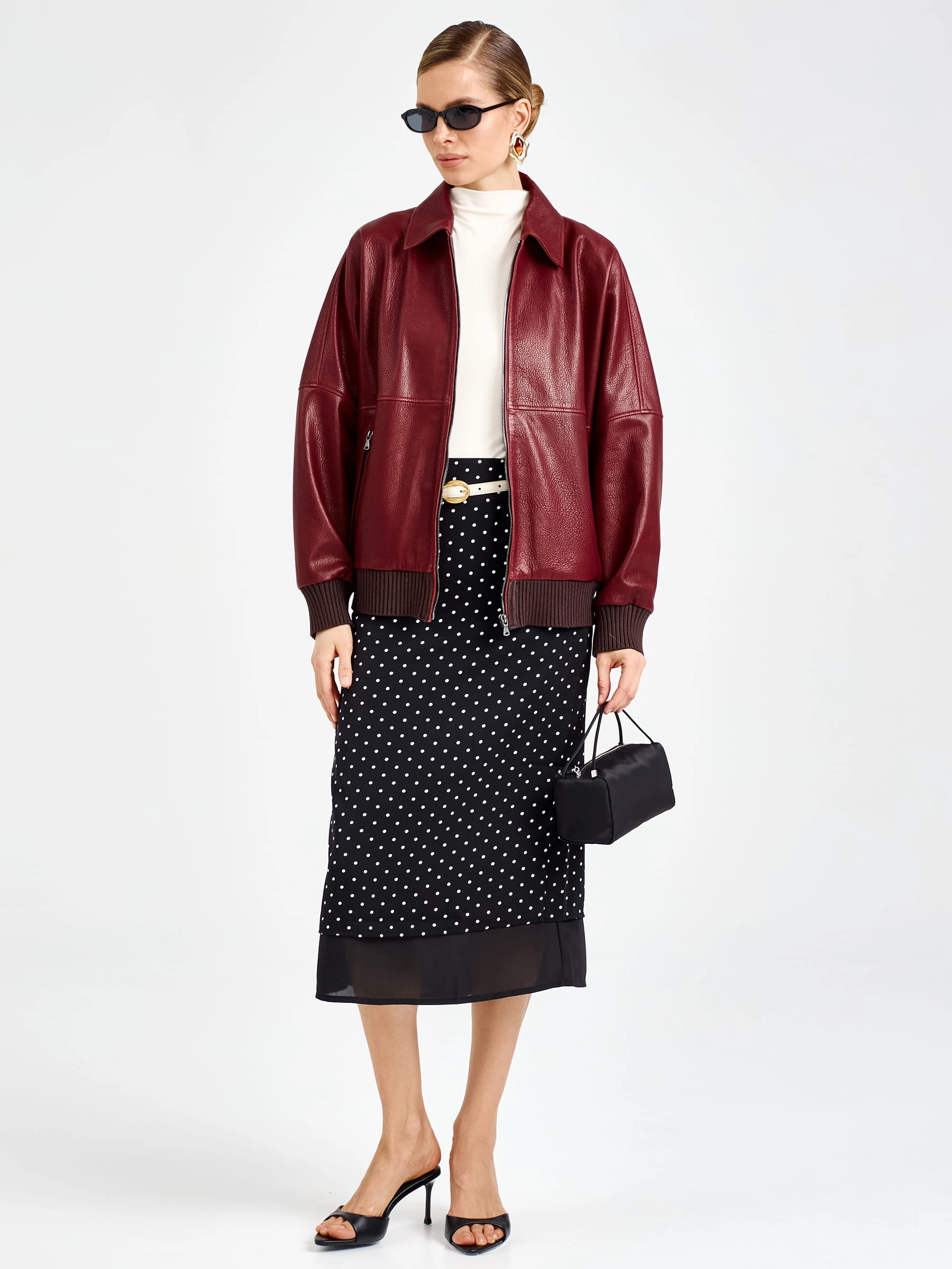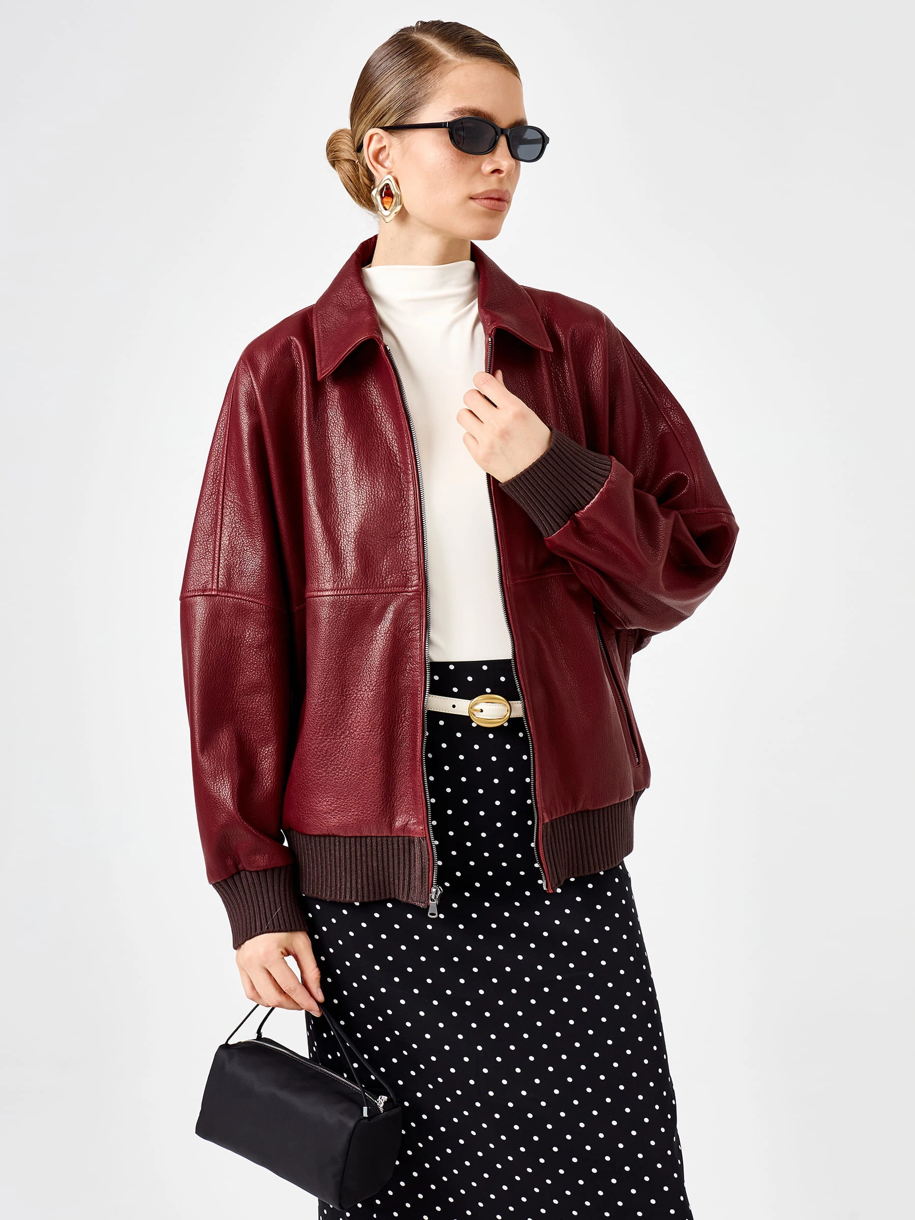 Стильный бомбер длиной 60 см из мягкой мелкозернистой кожи премиального качества: свободный силуэт со спущенным рукавом не сковывает движений, а отложной воротник и боковые карманы на молниях подчеркивают современный дизайн. Трикотажные резинки на манжетах и по низу обеспечивают идеальную посадку. Совет стилиста: носите с кожаными брюками и грубыми ботинками для дерзкого образа или с джинсами-скинни и кроссовками для повседневного комфорта — эта куртка станет вашим фаворитом благодаря универсальности и безупречному качеству кожи.