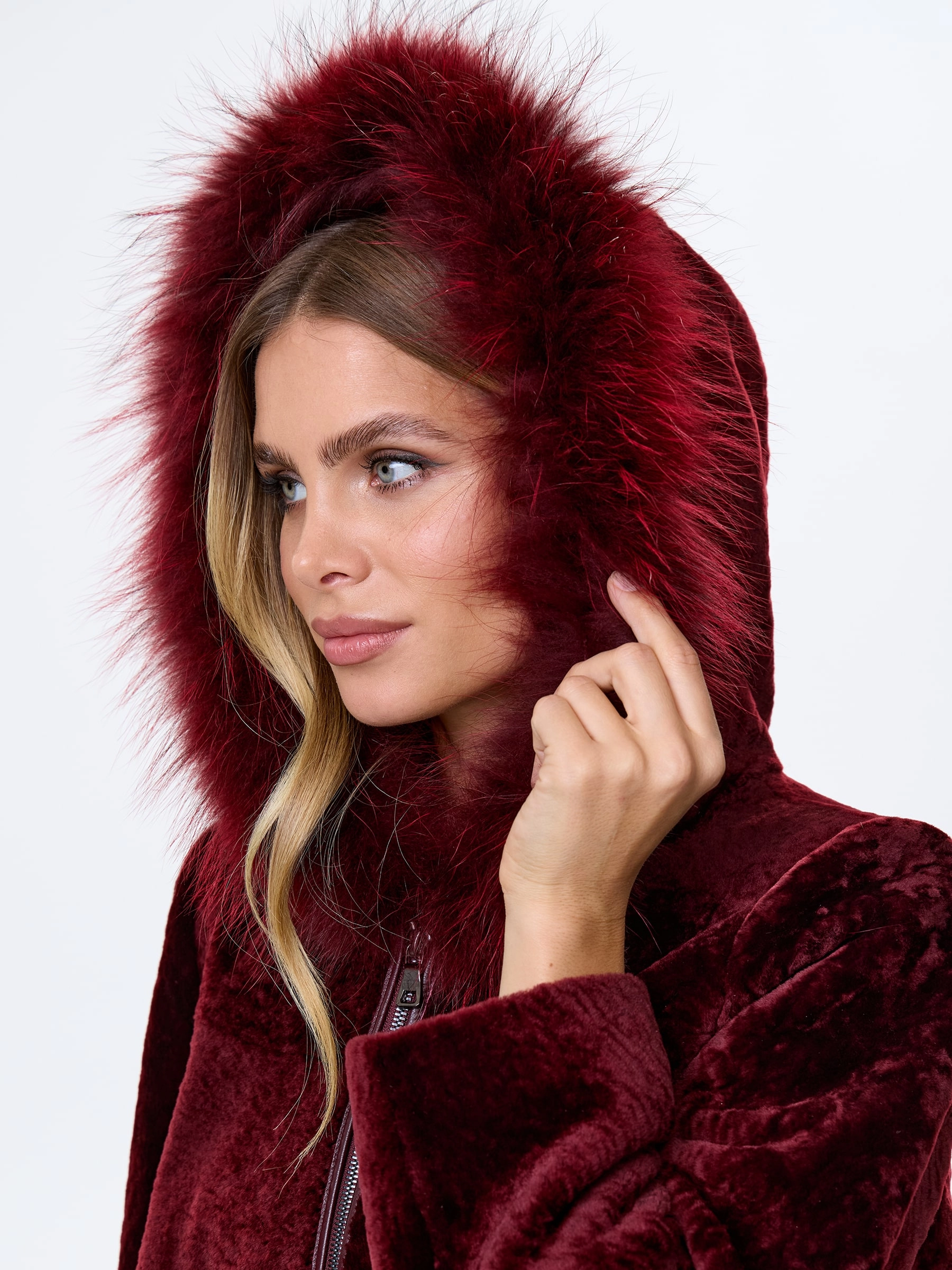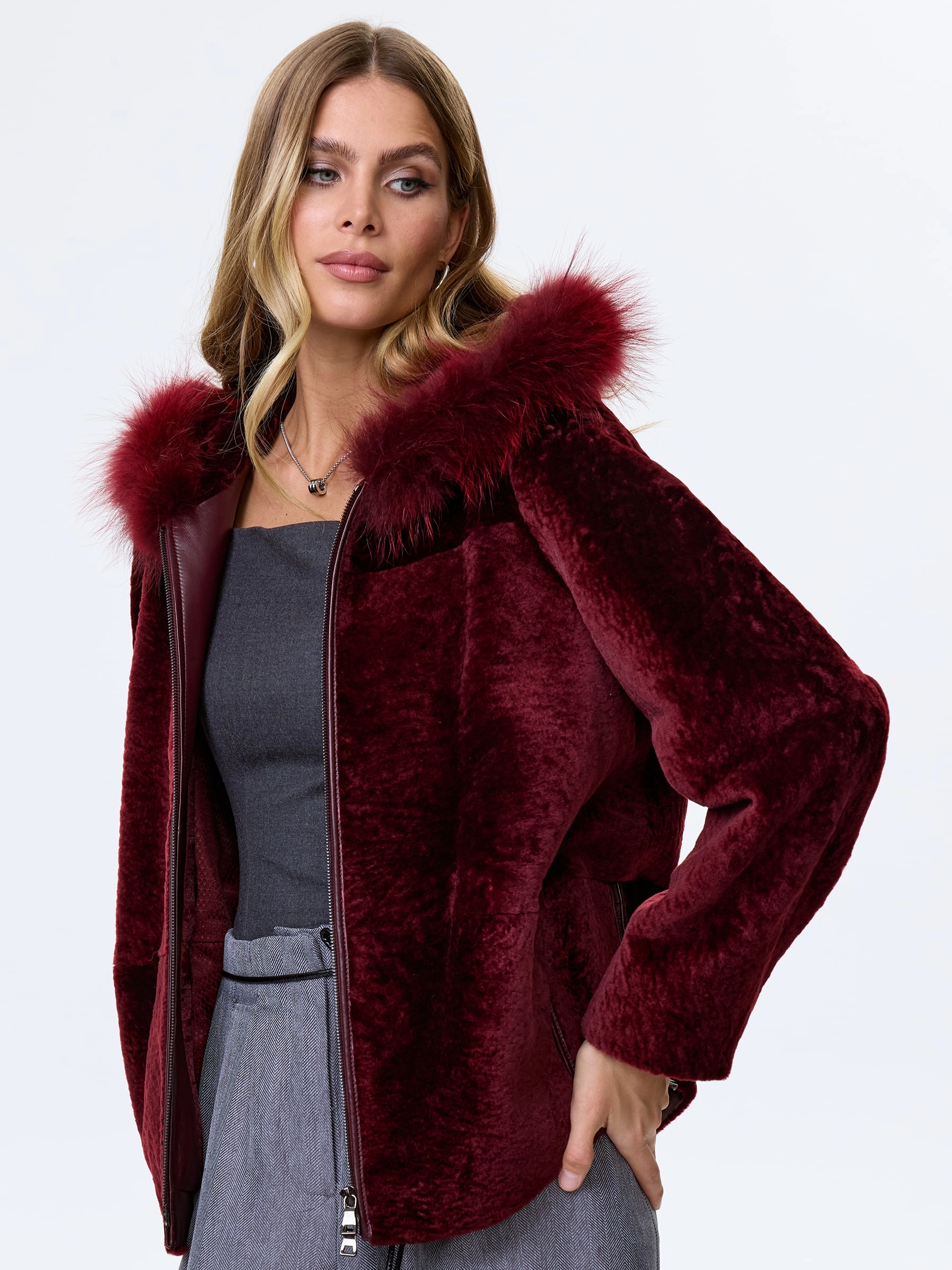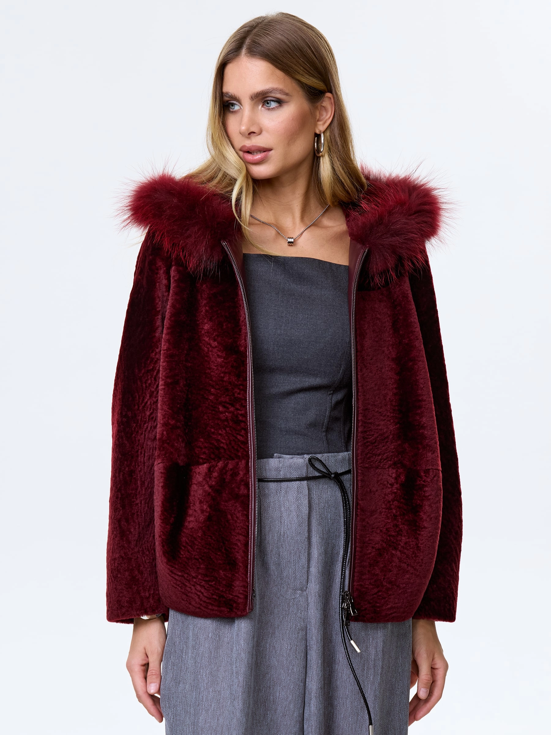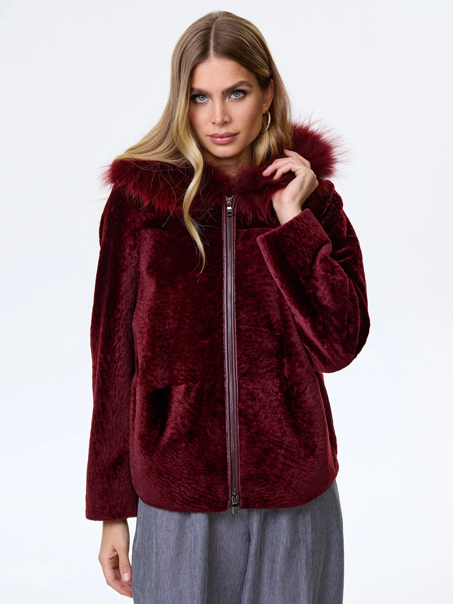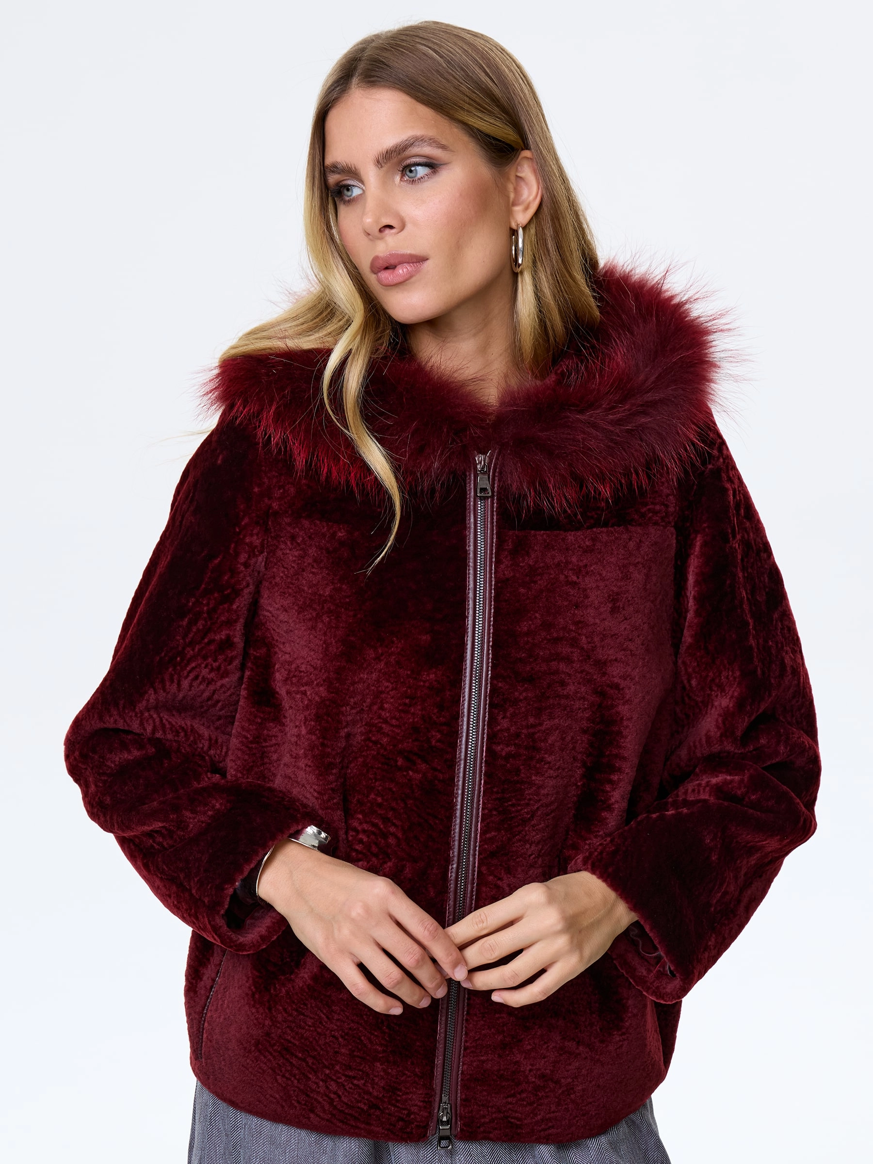 Бордовая короткая дубленка из нежнейшего меха астрагана. Свободный крой. Удобный глубокий капюшон, украшенный мехом песца. Современный шерстяной утеплитель шерстепон (внешне напоминает пуховой платок). Качественная подкладка. Комфортная посадка по фигуре. Прекрасная свобода движений. Изделие великолепно сочетается с любым образом.