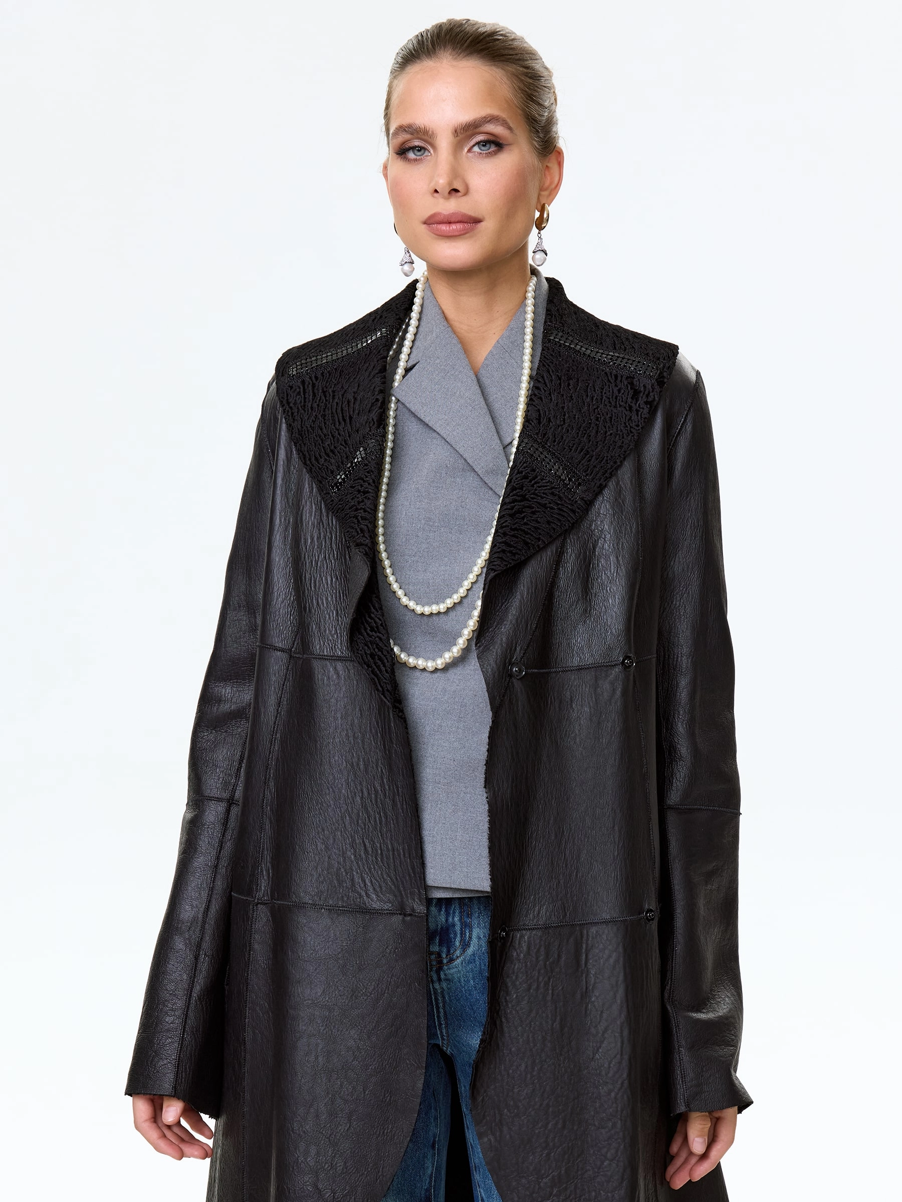 Для создания двухсторонней дубленки мастера использовали нежнейший мех новозеландского ягненка, близкого по восприятию к каракульче. Элегантное изделие с шалевидным воротником можно носить как гладкой, так и фактурной стороной наружу. Модель имеет два врезных кармана , застегивается внутренними кнопками.
