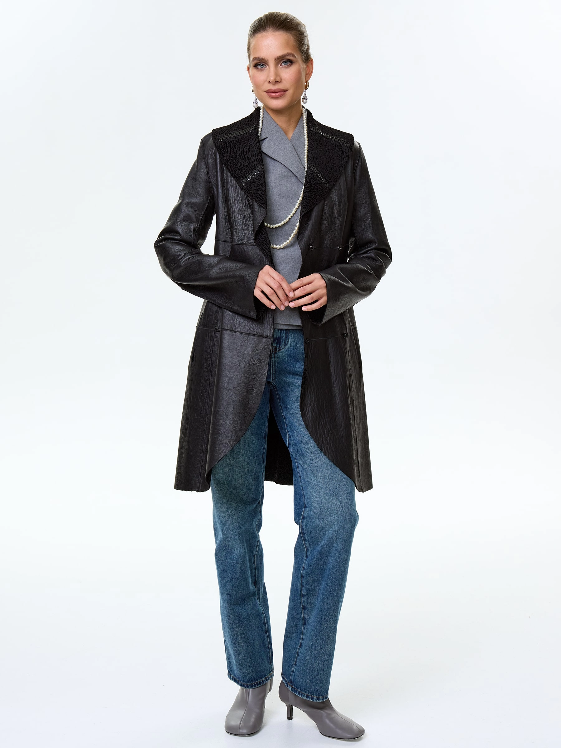 Товар женская дубленка из новозеландского астрагана 246, черная, размер 46, артикул 64610 выполнен из астраган с застежкой кнопки. Рассчитан на сезон: весна-осень. Длина изделия 95 см, силуэт приталенный .
