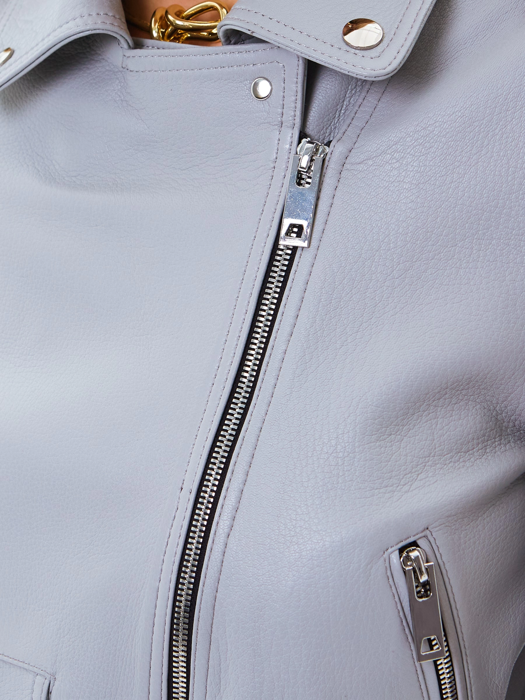 Укороченную косуху с широкими лацканами выполнили из тонкой тесненой кожи премиум класса. Куртку прямого силуэта с погонами дополнили съемным ремнем с пряжкой.Сама модель, манжеты и два кармана застегиваются крупными молниями.