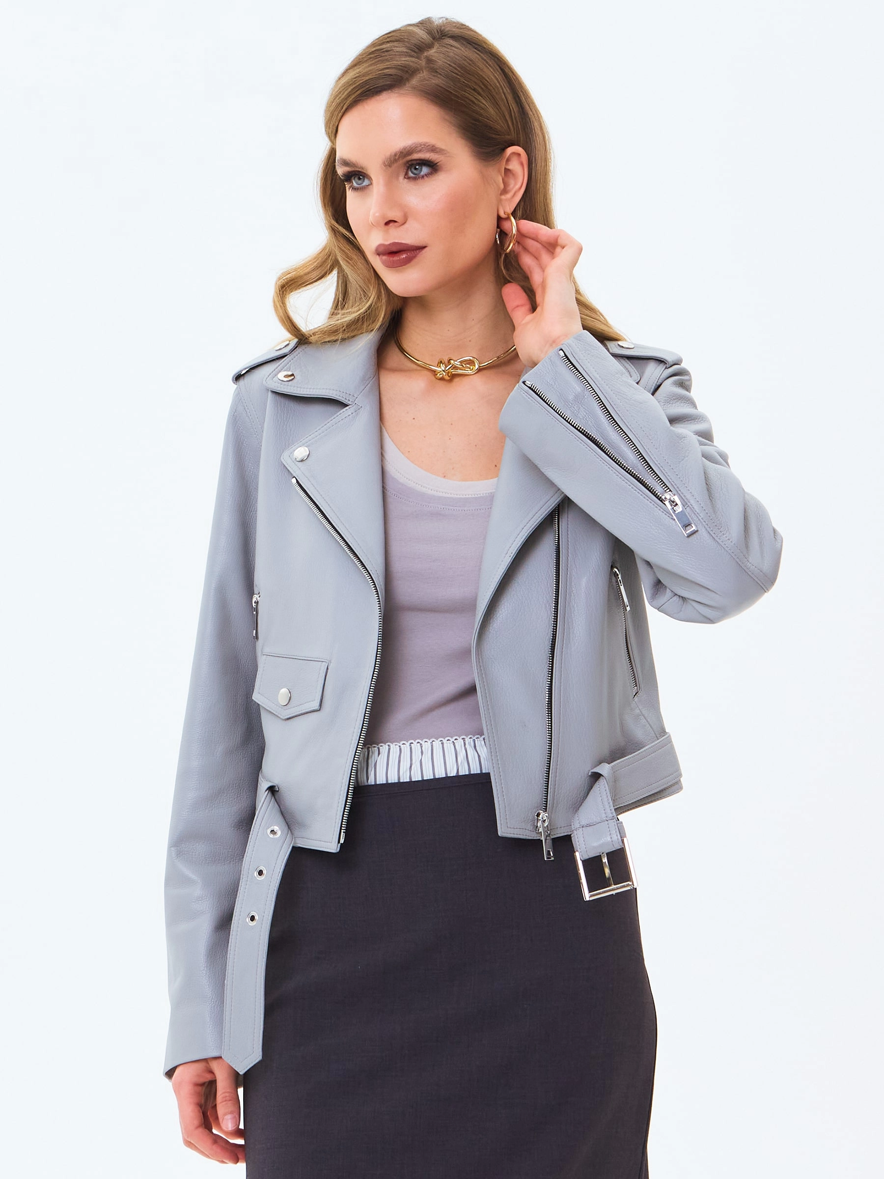 Товар женская кожаная куртка косуха с поясом премиум класса 3080, серая, размер 42, артикул 24530 выполнен из натуральной кожи с застежкой молния. Рассчитан на сезон: весна-лето. Длина изделия 46 см, силуэт прямой.