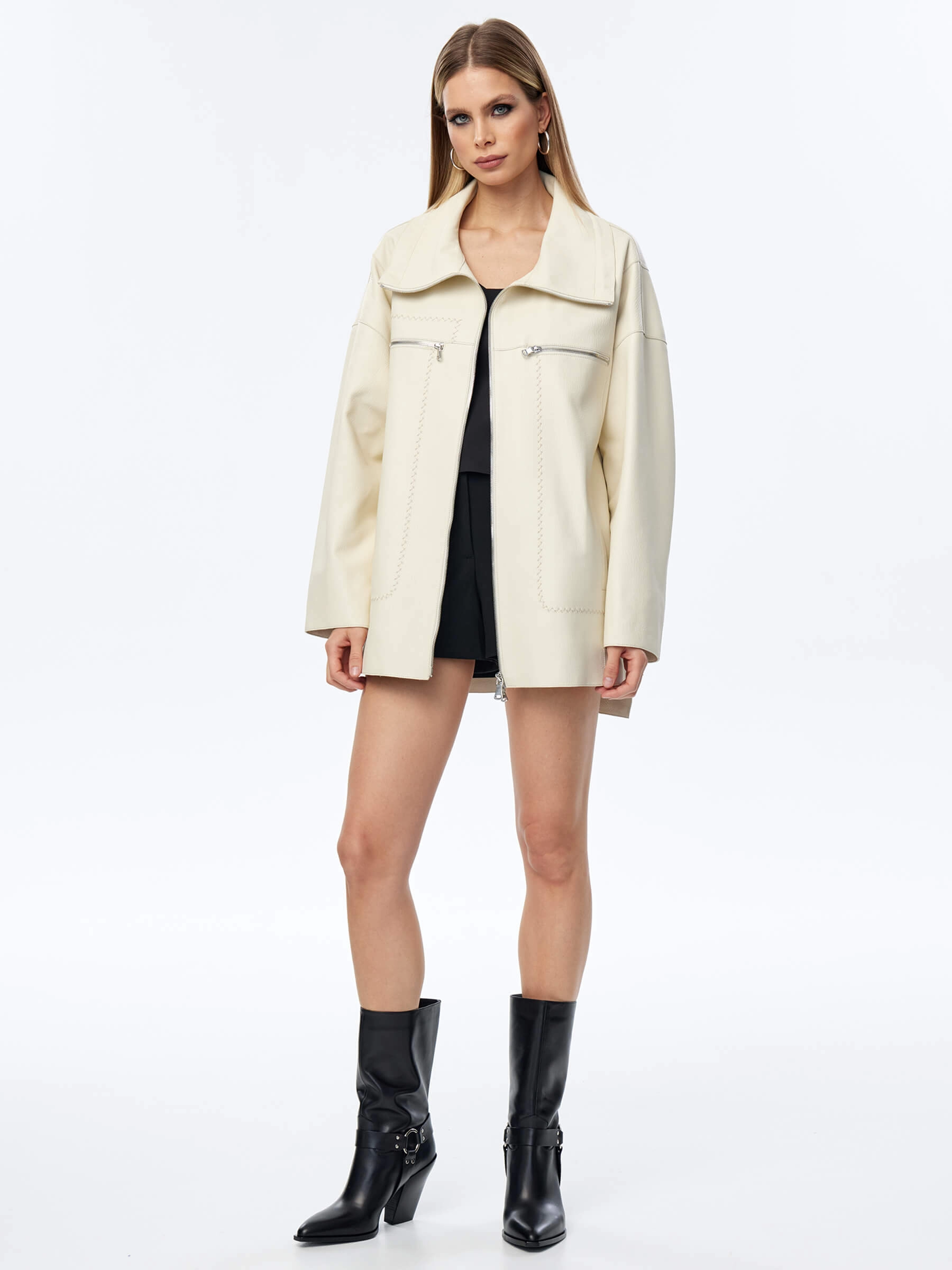 Удлиненная куртка силуэта оверсайз застегивающиеся встречной крупной молнией, выполнена из мягкой фактурной кожи премиум класса. Спущенная линия плеч. Воротник-стойку можно трансформировать в отложной. Великолепная свобода движений. Детали модели подчеркнули двумя нагрудными карманами и зигзагообразной строчкой.