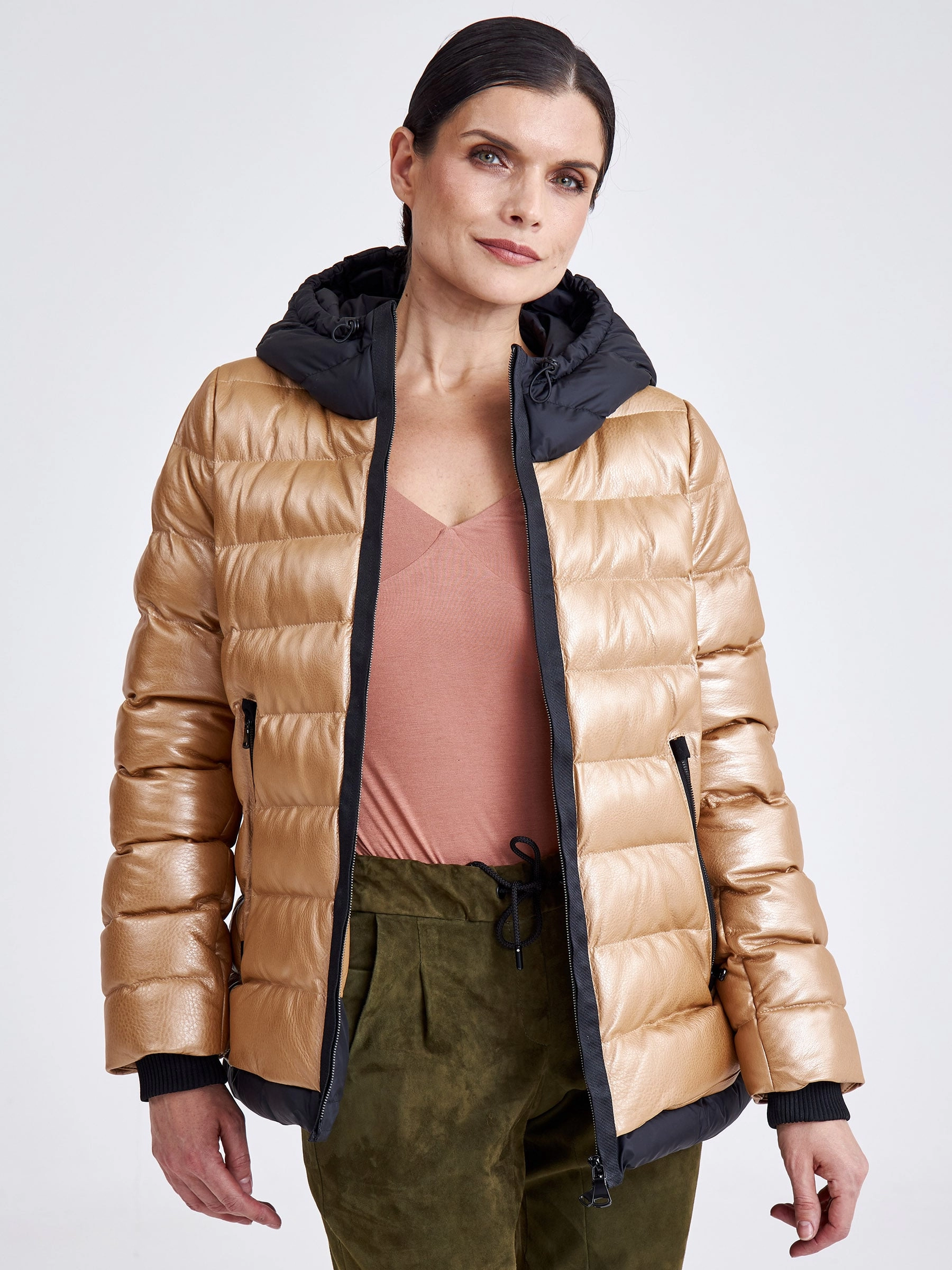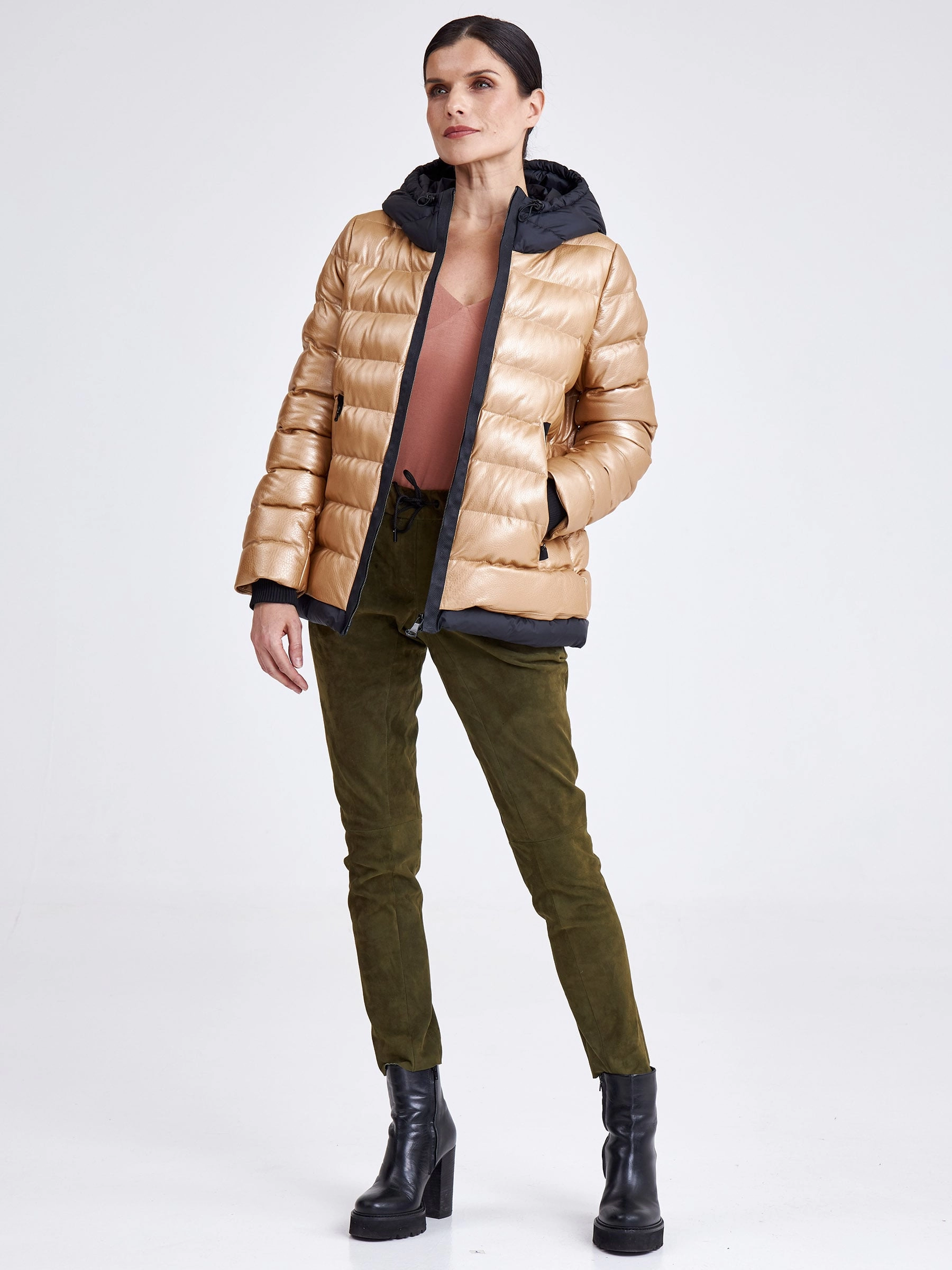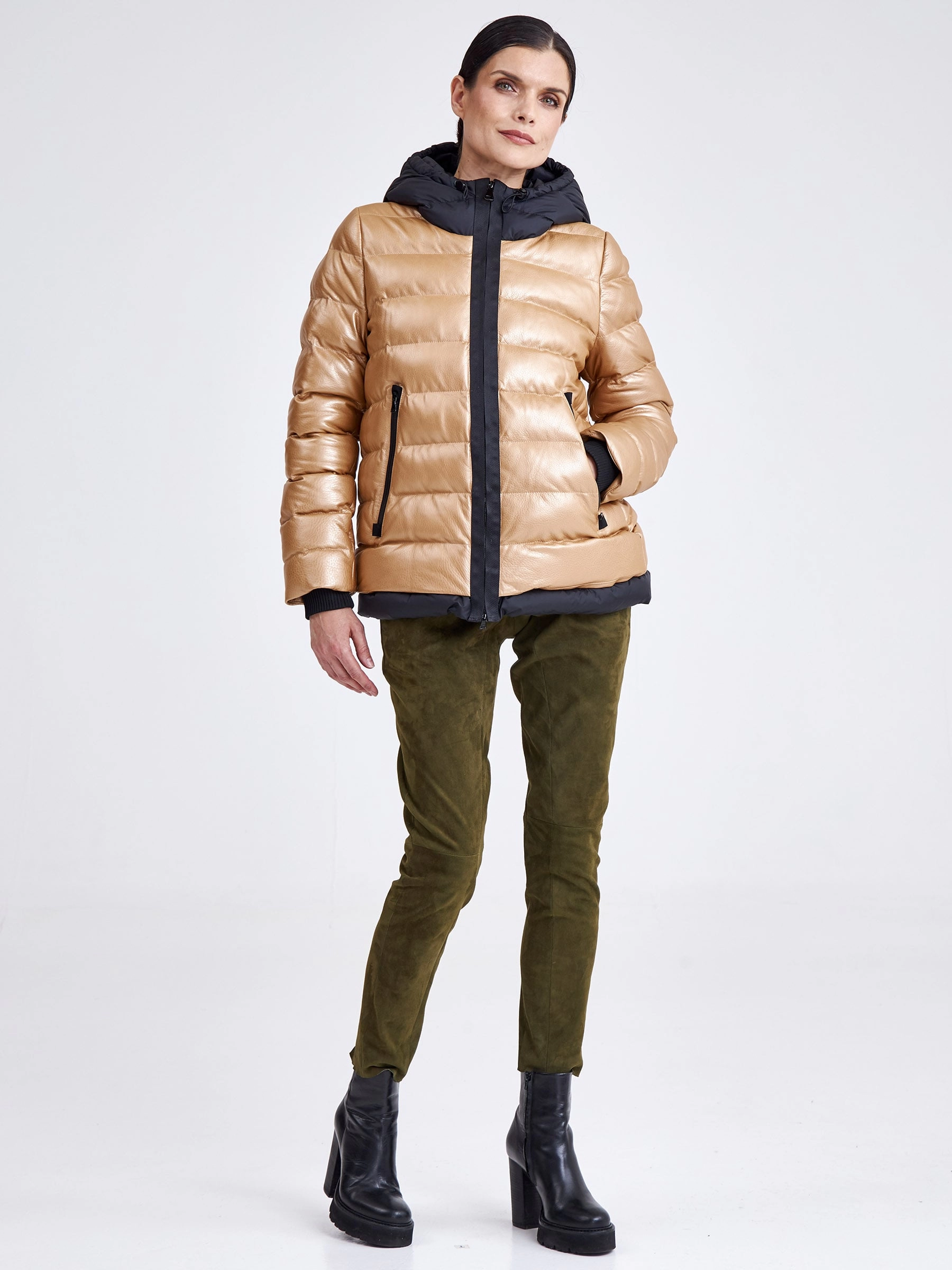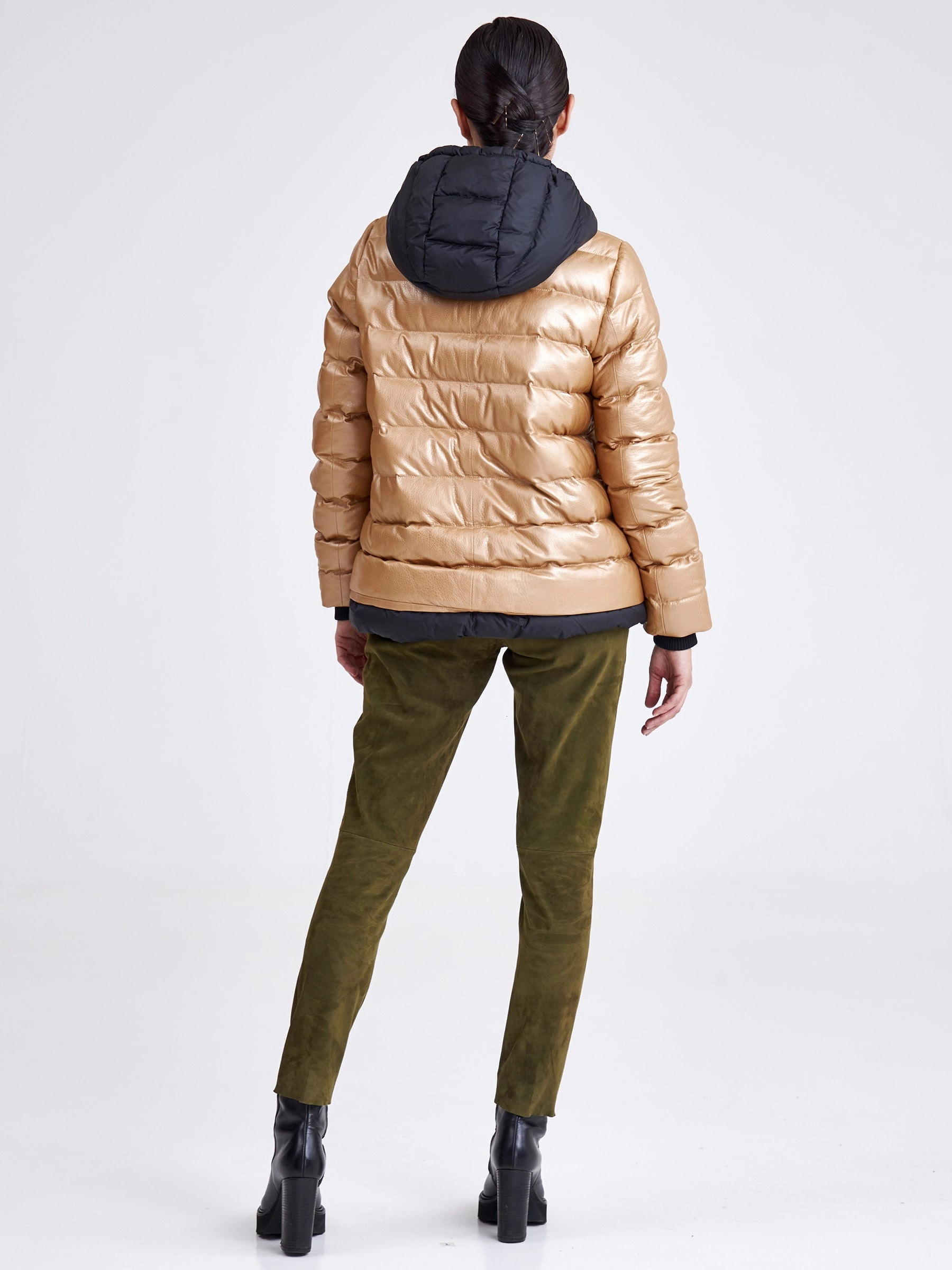 Короткий пуховик свободного кроя выполнен в тёплом бежевом оттенке из натуральной кожи, дополненной чёрной водоотталкивающей тканью, из которой сделан и объёмный капюшон. Универсальная длина до середины бедра (51–74 см) и свободный крой обеспечивают комфорт и не сковывают движения, а глубокий капюшон защитит от непогоды. Удобная подкладка из 100% полиэстера и застёжка-молния дополняют практичность модели. В качестве утеплителя используется немецкий синтепон Freudenberg, который гарантирует отличную теплоизоляцию, воздухопроницаемость и простой уход в демисезонный период. Совет стилиста: Эта куртка в нейтральной цветовой гамме станет идеальным компаньоном для расслабленных городских образов: сочетайте её с джинсами-бойфрендами и ботинками для стиля utility или наденьте поверх платья-свитера и ботильонов, чтобы подчеркнуть лёгкость силуэта.