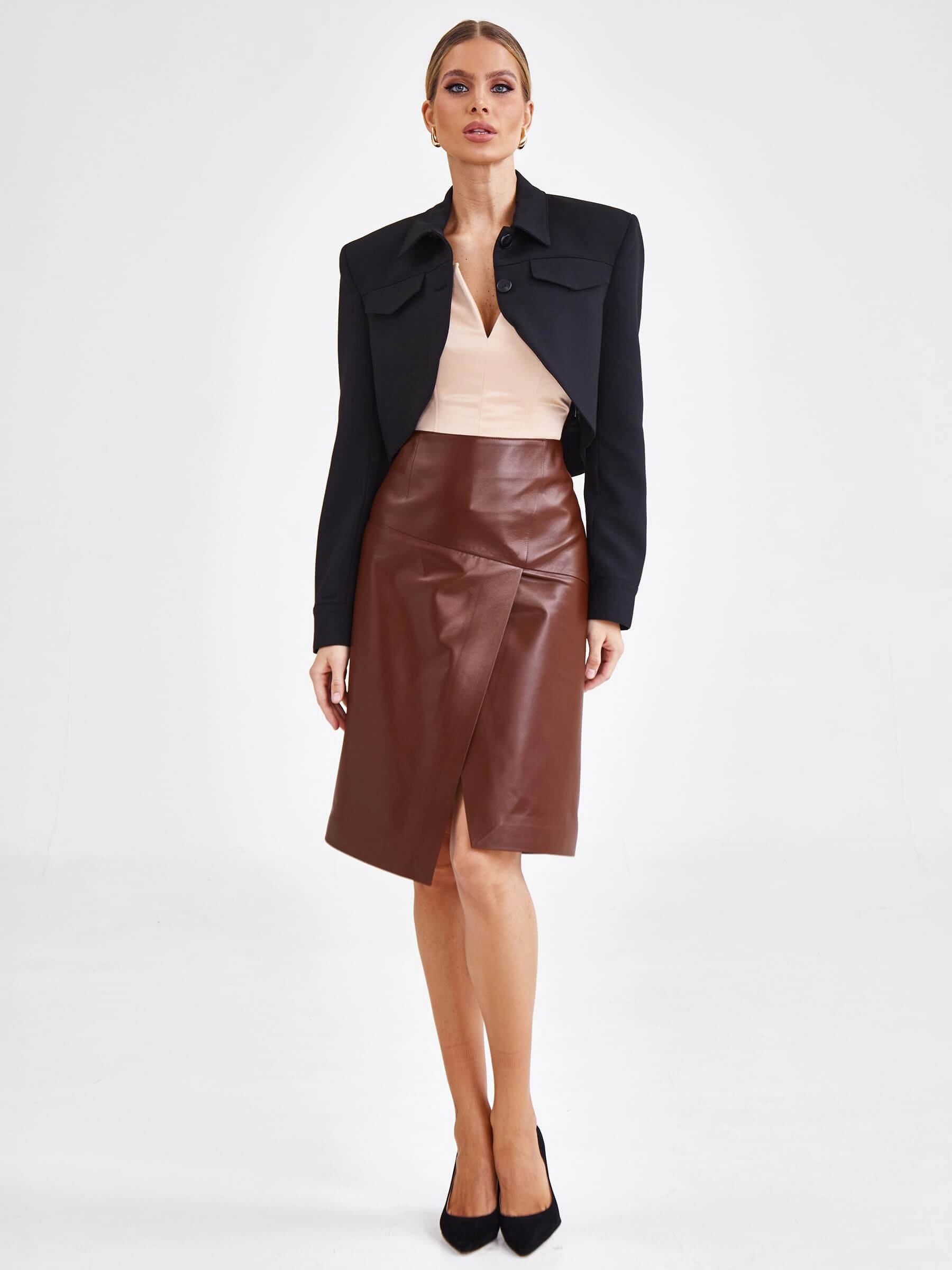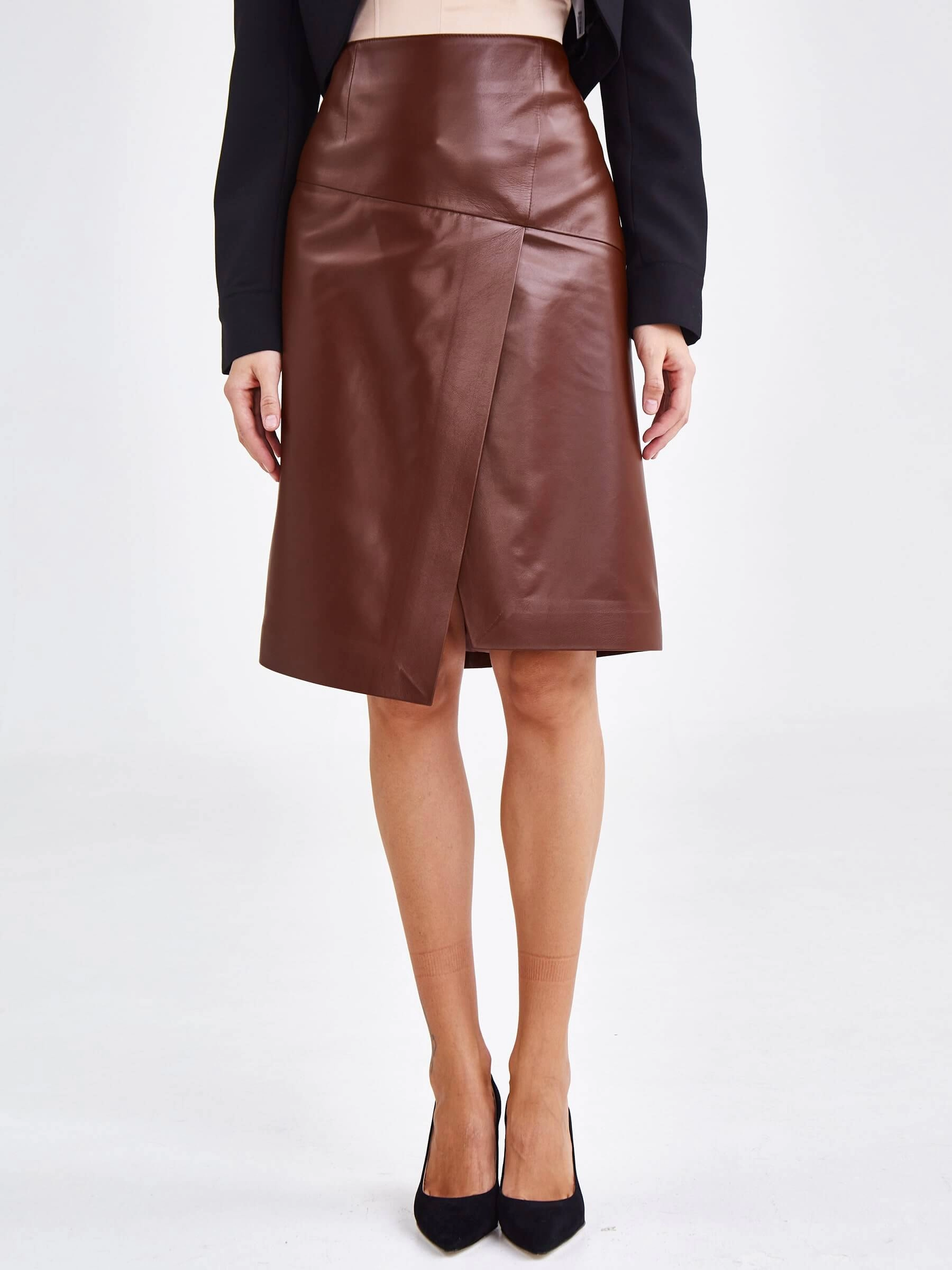 Товар юбка миди из натуральной кожи 15, табачная, размер 44, артикул 85890 выполнен из натуральной кожи с застежкой молния. Рассчитан на сезон: весна-осень. Длина изделия 62 см, силуэт прямой.