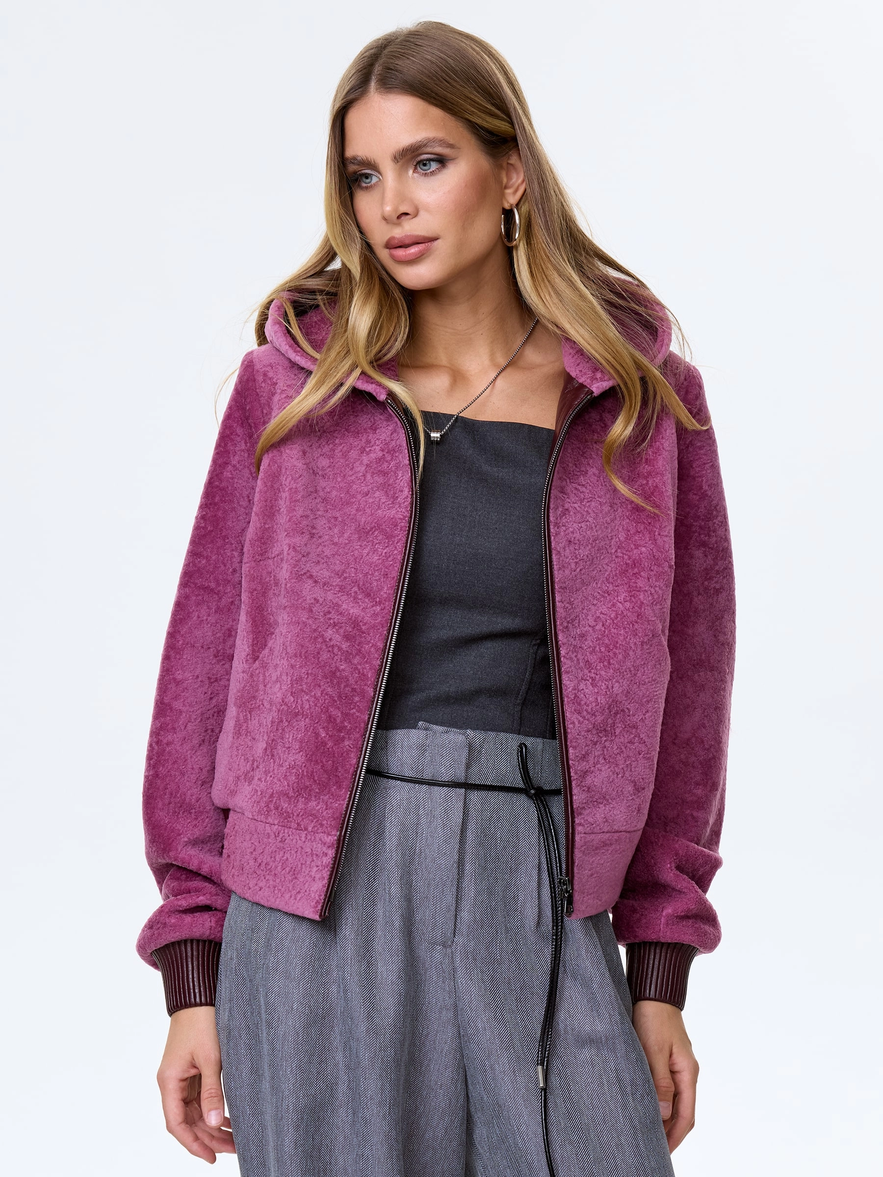 Товар женская куртка из меховой овчины с капюшоном премиум класса 57мех, сиреневая, размер 44, артикул 64460 выполнен из астраган с застежкой молния. Рассчитан на сезон: осень-зима. Длина изделия 51 см, силуэт свободный.