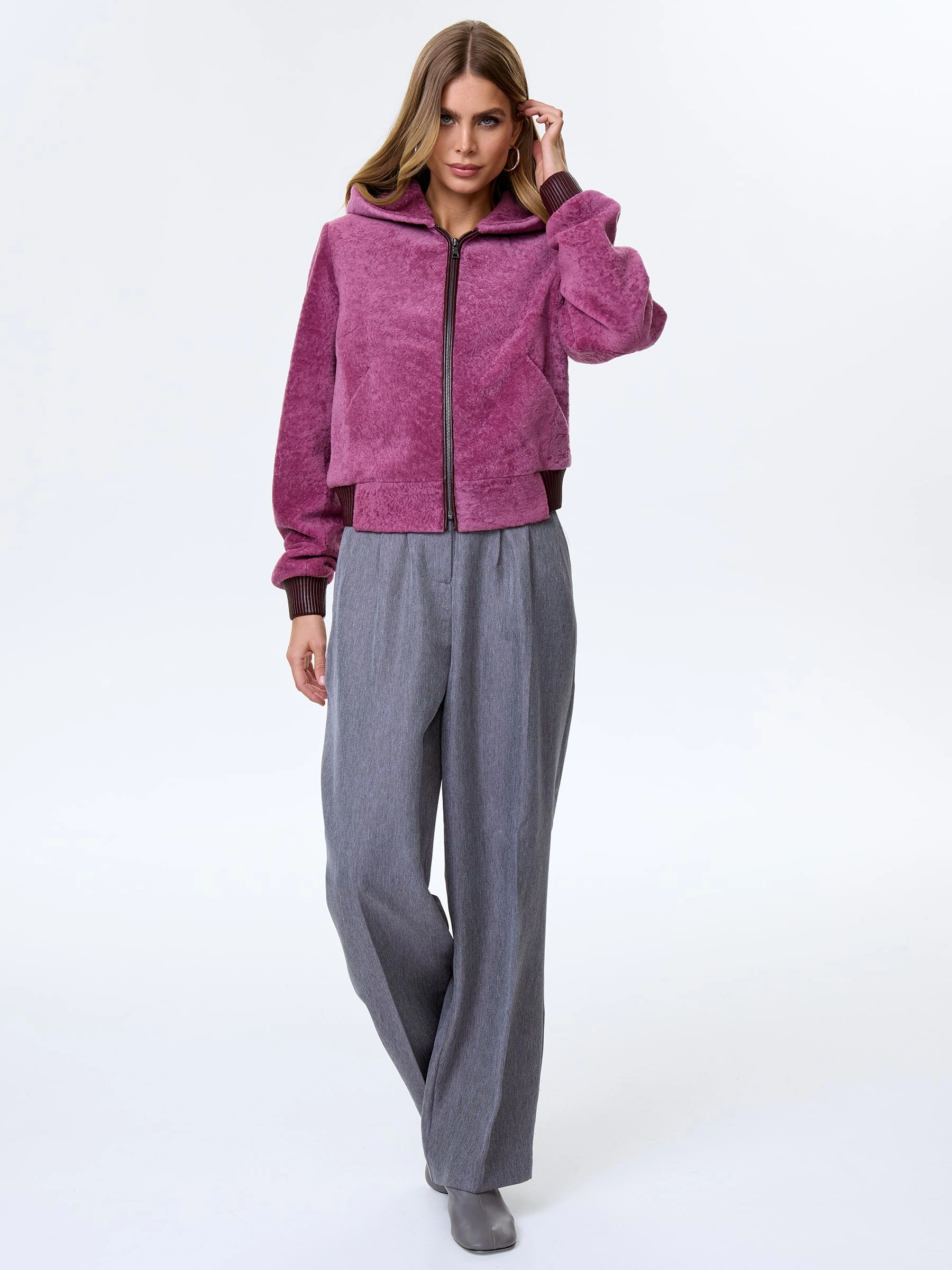 Женская куртка из меховой овчины с капюшоном премиум класса 57мех, сиреневая, размер 44, артикул 64460