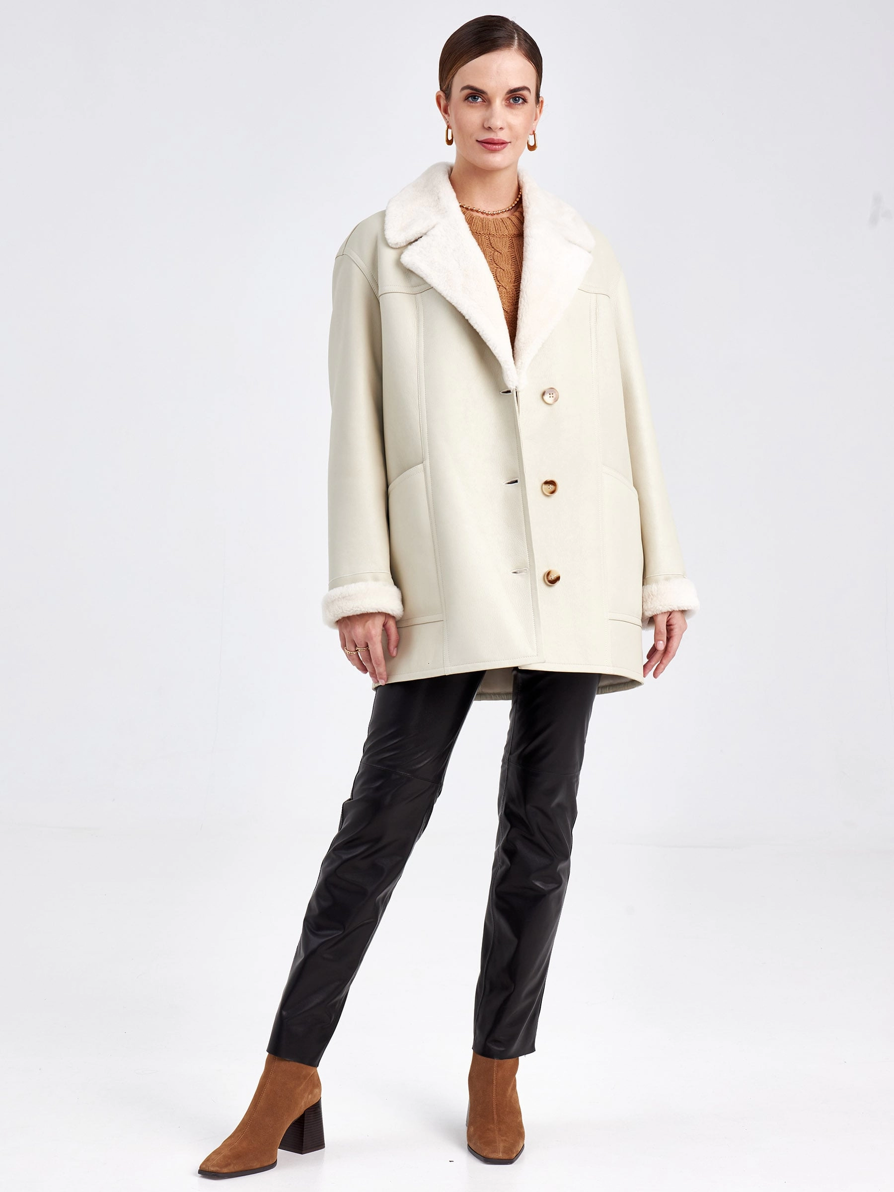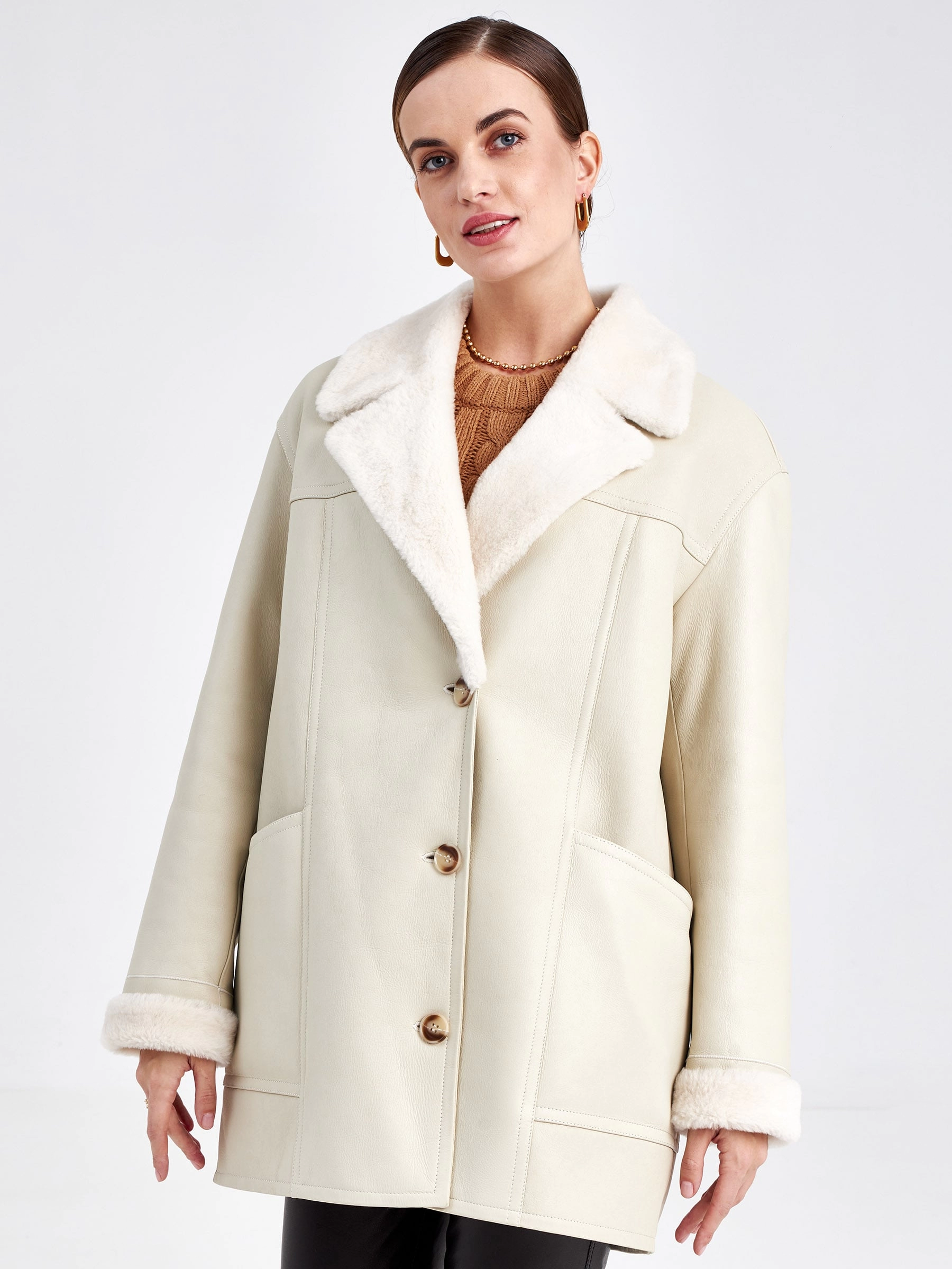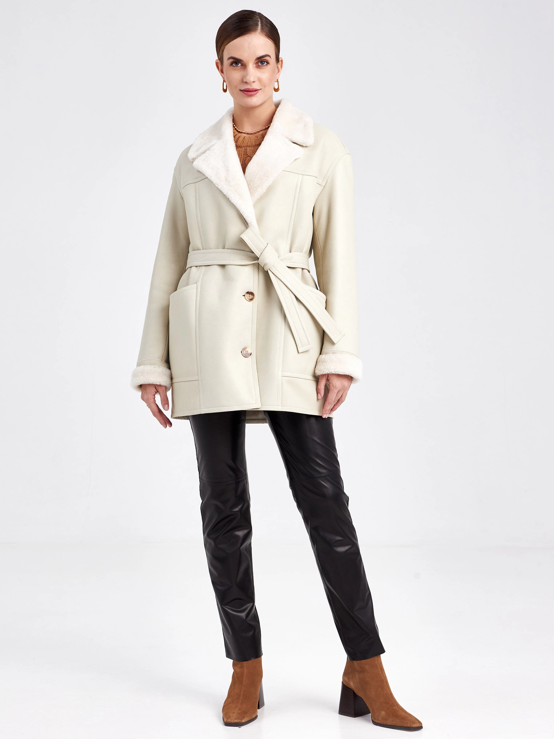 Эта модель куртки-пиджака из меховой овчины воплощает в себе современную утилитарность и классическую элегантность. Её прямой силуэт со спущенной линией плеч и аккуратным английским воротником создаёт идеальную основу для умного повседневного образа. Застёжка на пуговицы и отсутствие капюшона подчёркивают лаконичный дизайн, а длина до середины бедра (около 75–90 см) обеспечивает универсальность носки в межсезонье и мягкую зиму. Практичные детали — два вместительных кармана и съёмный широкий пояс — позволяют варьировать стиль от строгого до расслабленного. Совет от стилиста: сочетайте эту куртку с плотными шерстяными брюками и грубыми ботинками для смарт-кэжуал лука или набросьте поверх тонкого платья с сапогами, чтобы создать контраст текстур и добавить образу лёгкую богемную ноту.