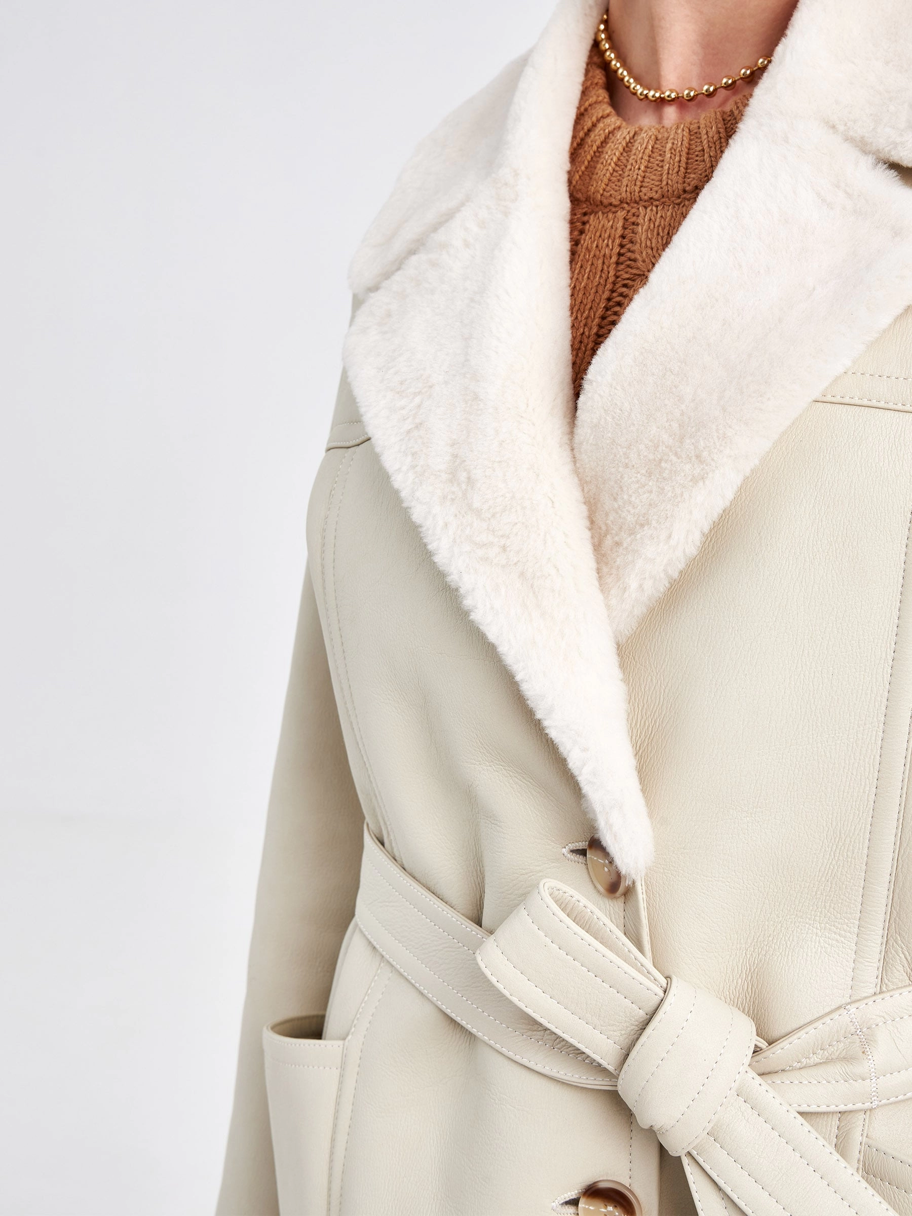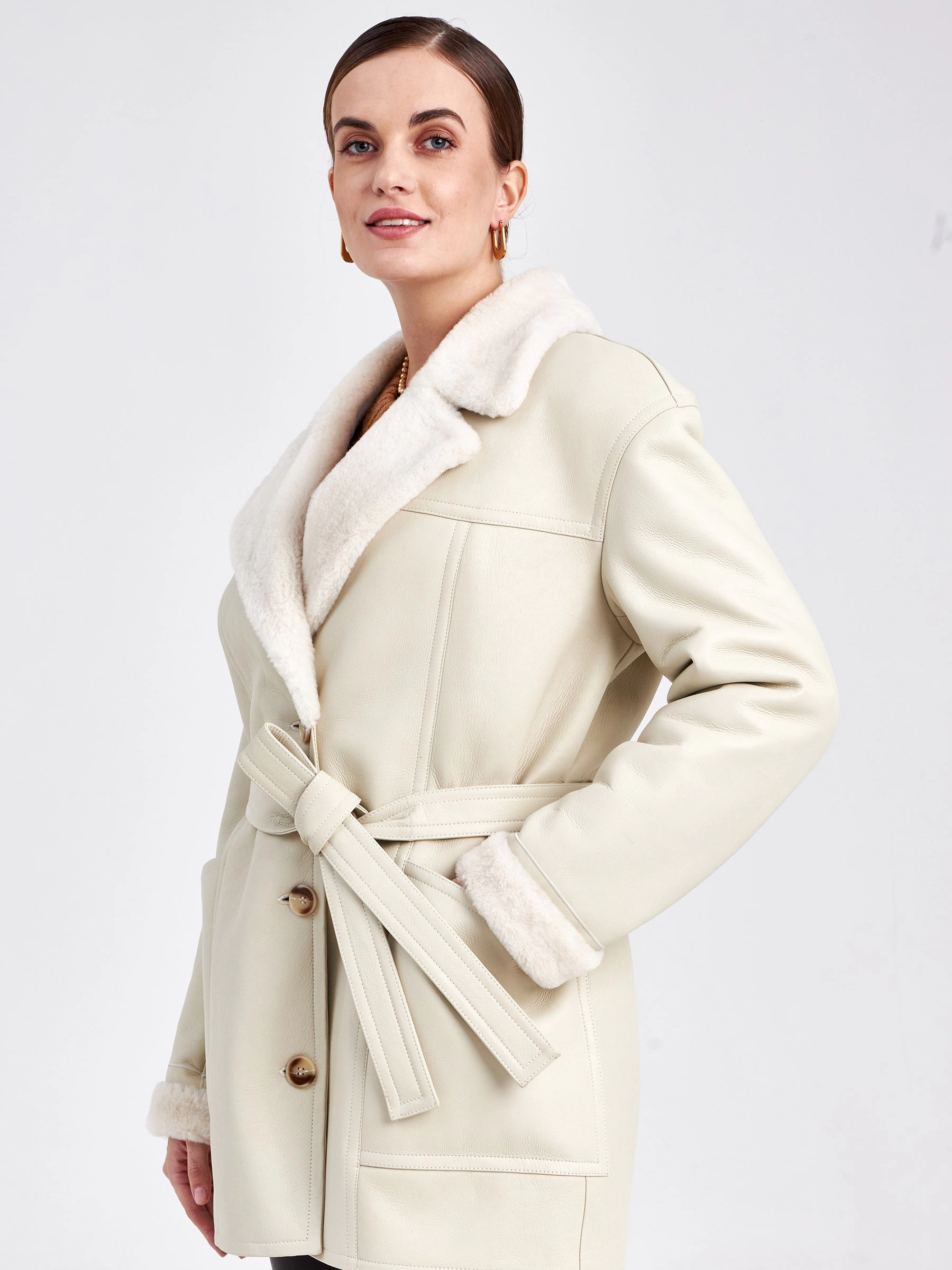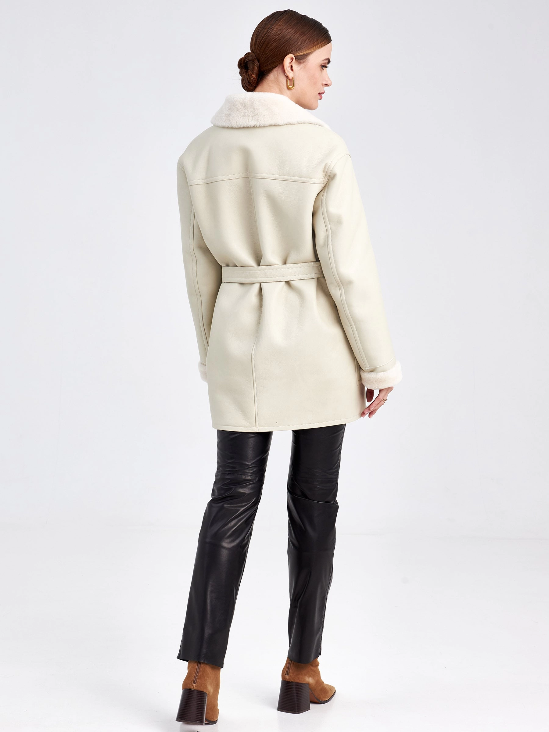Эта модель куртки-пиджака из меховой овчины воплощает в себе современную утилитарность и классическую элегантность. Её прямой силуэт со спущенной линией плеч и аккуратным английским воротником создаёт идеальную основу для умного повседневного образа. Застёжка на пуговицы и отсутствие капюшона подчёркивают лаконичный дизайн, а длина до середины бедра (около 75–90 см) обеспечивает универсальность носки в межсезонье и мягкую зиму. Практичные детали — два вместительных кармана и съёмный широкий пояс — позволяют варьировать стиль от строгого до расслабленного. Совет от стилиста: сочетайте эту куртку с плотными шерстяными брюками и грубыми ботинками для смарт-кэжуал лука или набросьте поверх тонкого платья с сапогами, чтобы создать контраст текстур и добавить образу лёгкую богемную ноту.