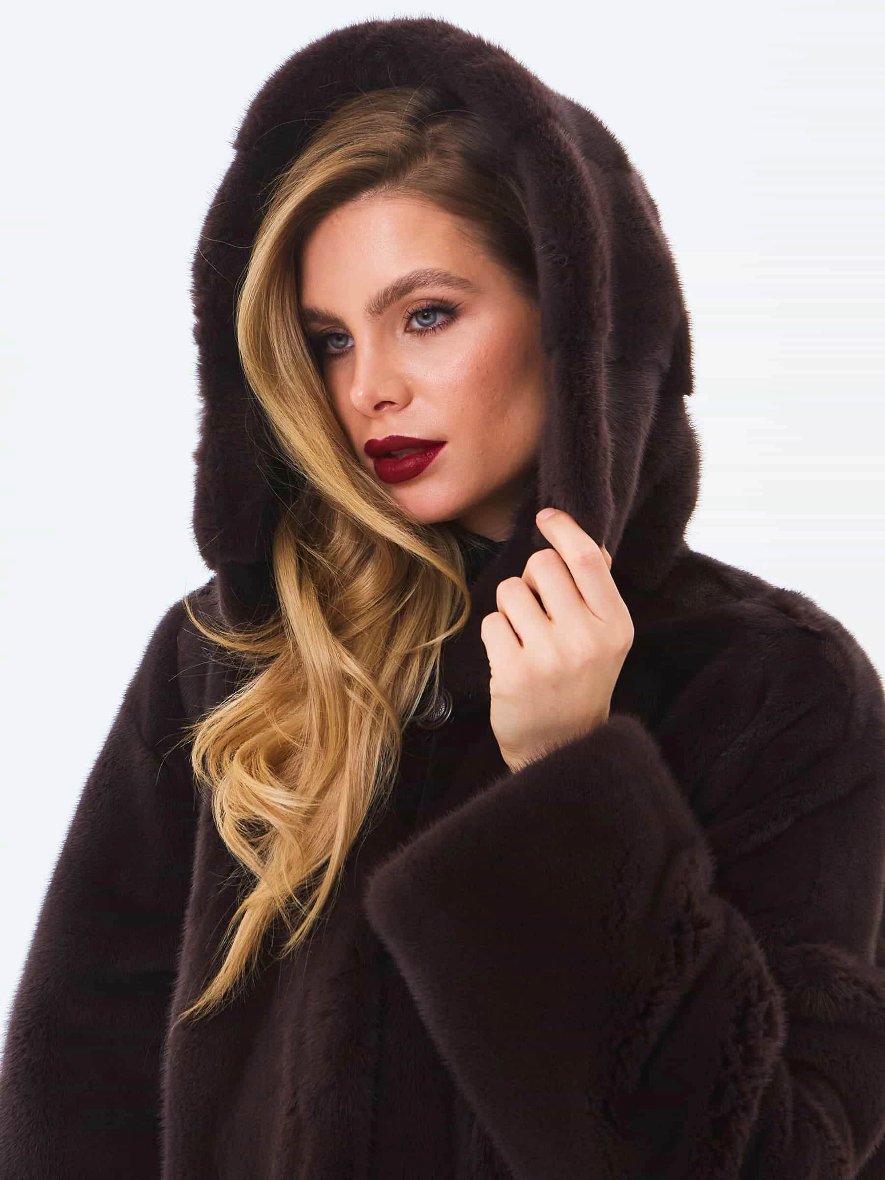 Женская норковая шуба с капюшоном премиум класса Жанета(к), коричневая, размер 58, артикул 34230