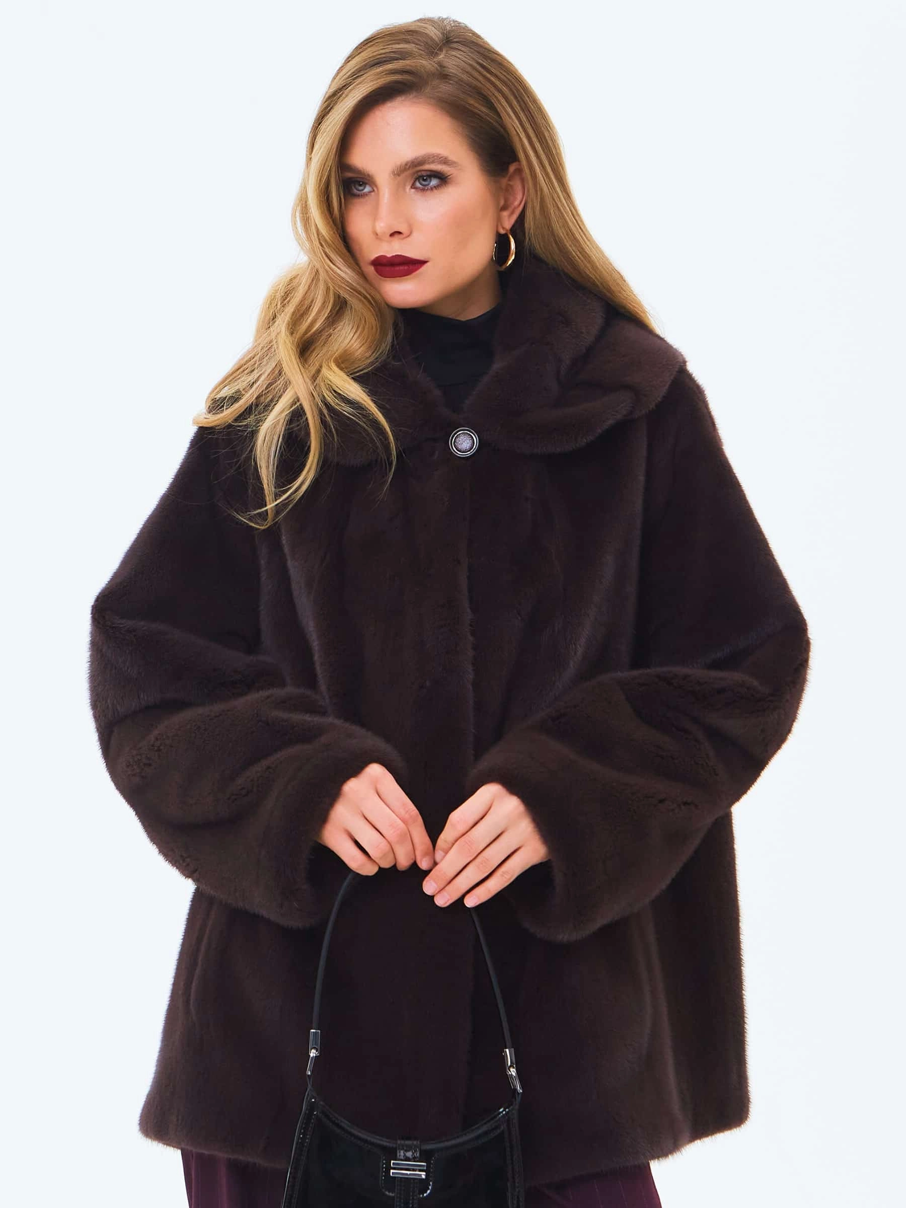 Для пошива короткой шубы с глубоким капюшоном и спущенной линией плеча использовали густой нежный мех норки. Свободная модель с двумя врезными боковыми карманами застегивается металлическими клипсами.