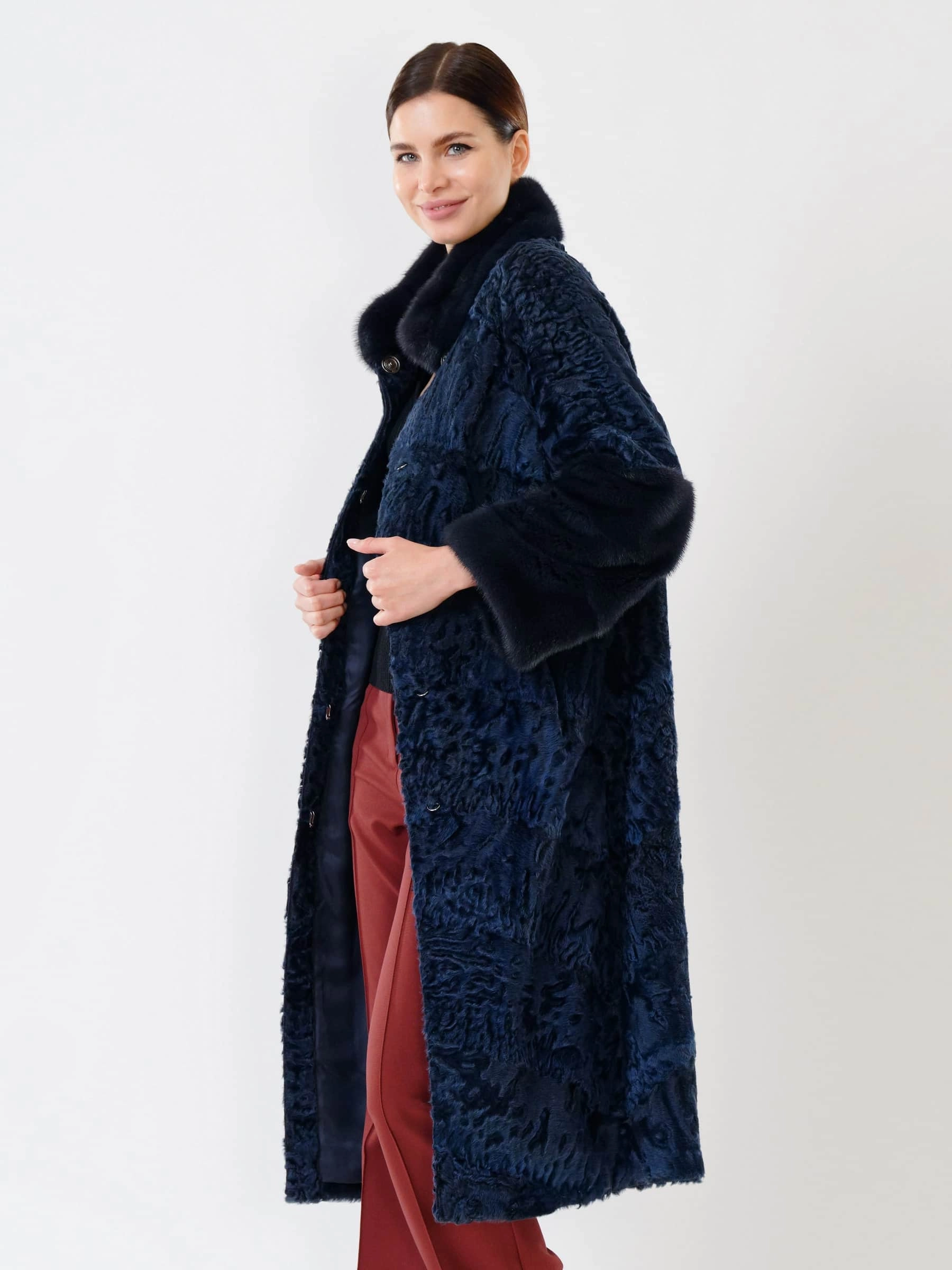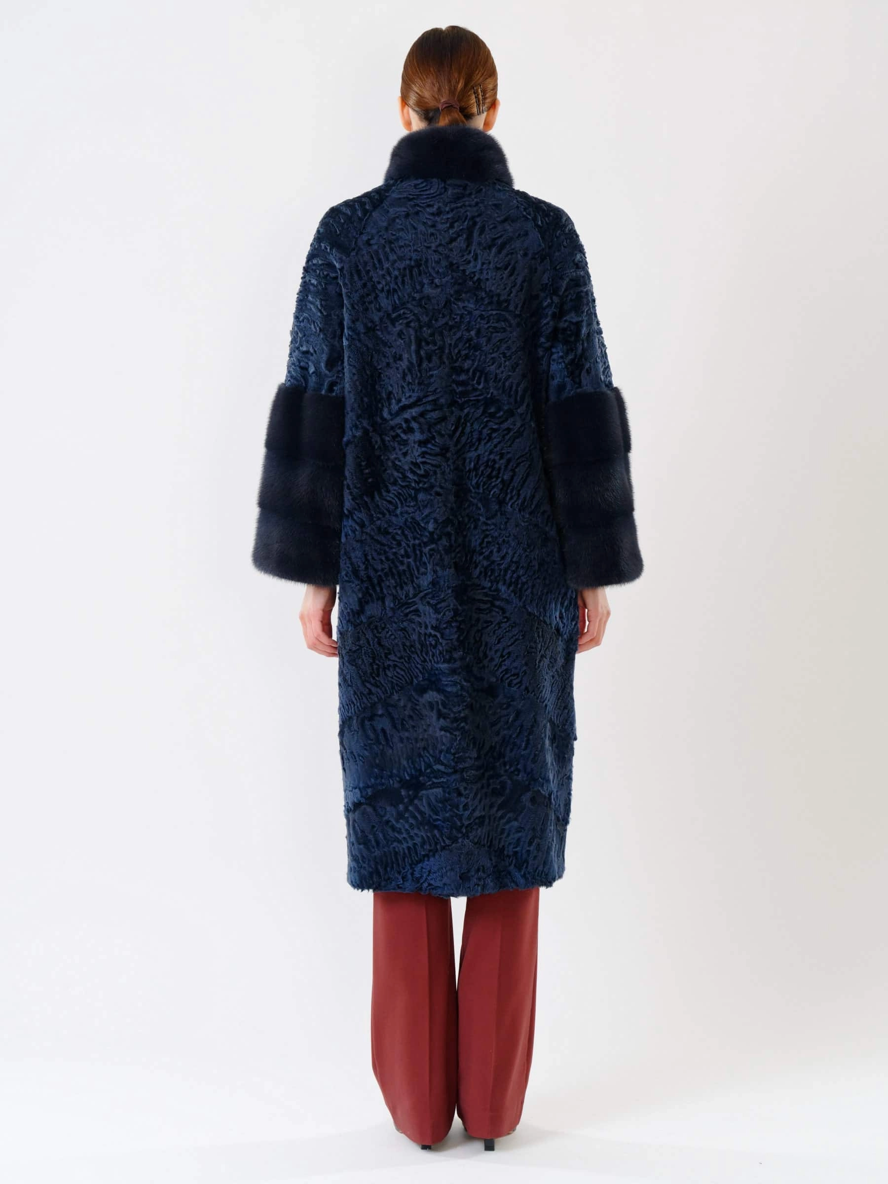 Элегантное пальто длиной свыше 105 см из афганского каракуля, дополненное воротником-стойкой и отделкой рукавов из норки датской селекции, воплощает премиальный уровень качества и безупречный вкус. Модель отличается чёткой, идеальной посадкой по фигуре, а её лаконичный силуэт подчёркнут удобными карманами. Каждая деталь свидетельствует о высочайшем мастерстве: от ювелирного подбора шкурок по оттенку и структуре волоса до аккуратной работы портных. Это вневременная инвестиция в гардероб, создающая образ сдержанной роскоши.