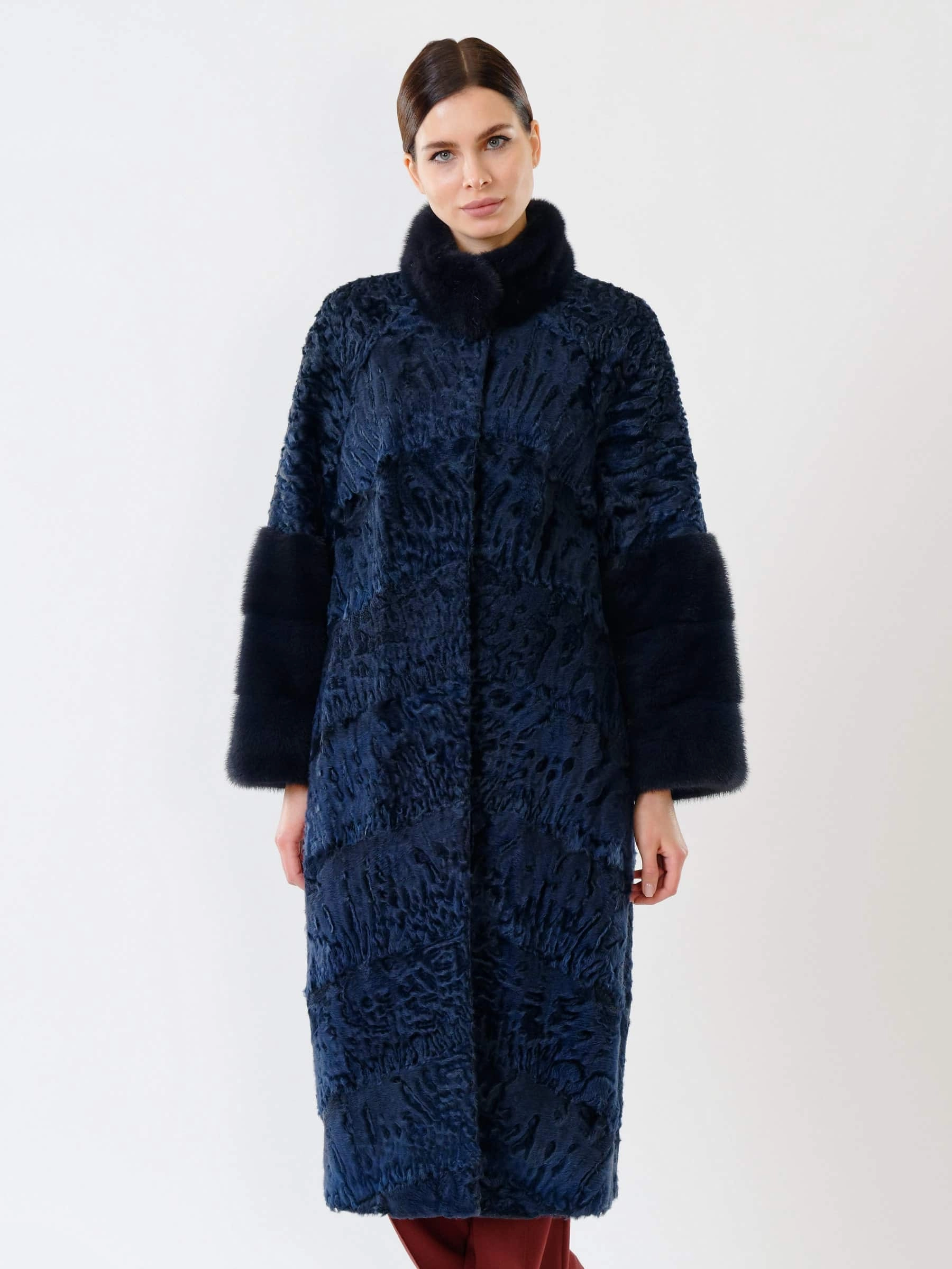 Товар женская шуба из меха каракуля с мехом норки 17101д(сн), синяя, размер 44, артикул 22580 выполнен из мех каракуля с застежкой клипсы. Рассчитан на сезон: осень-зима. Длина изделия свыше 90 см, силуэт прямой.