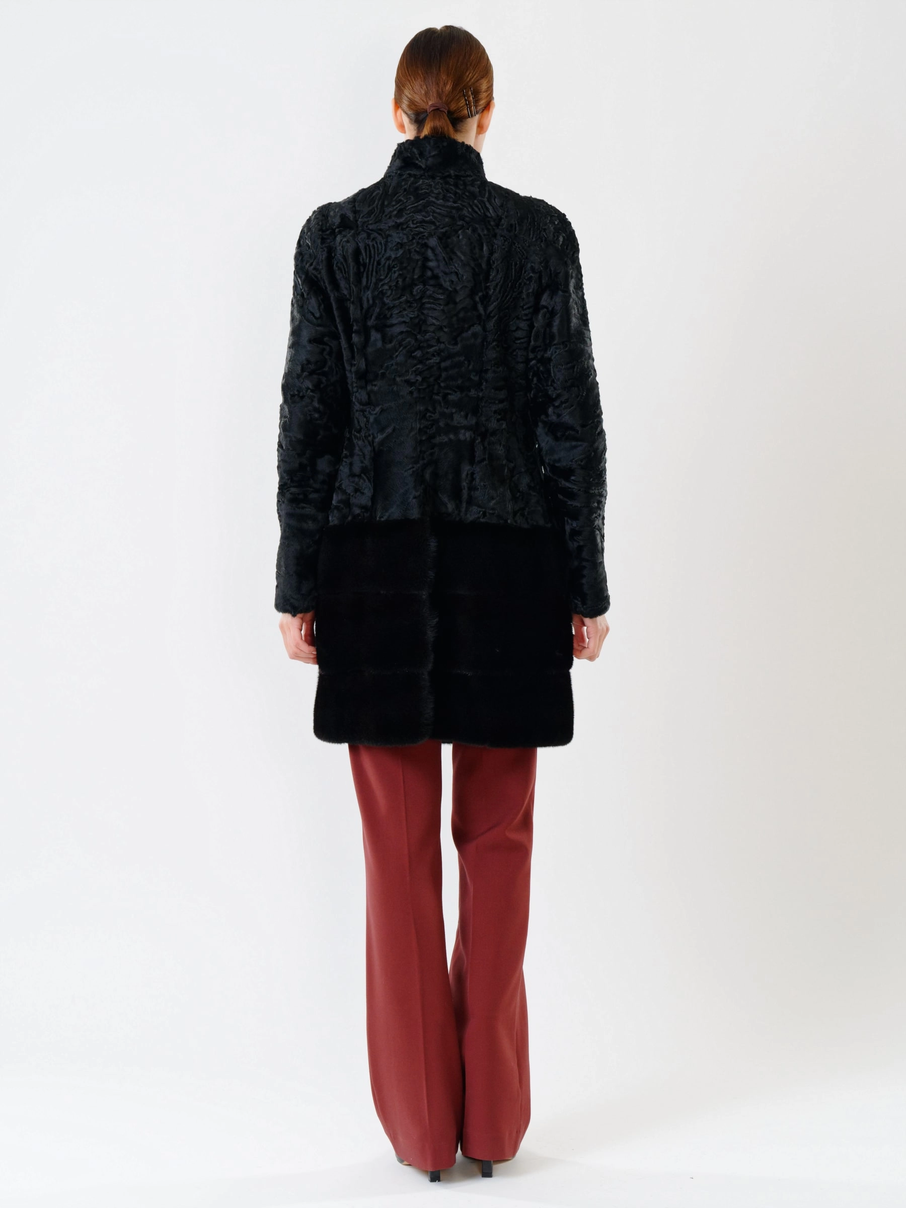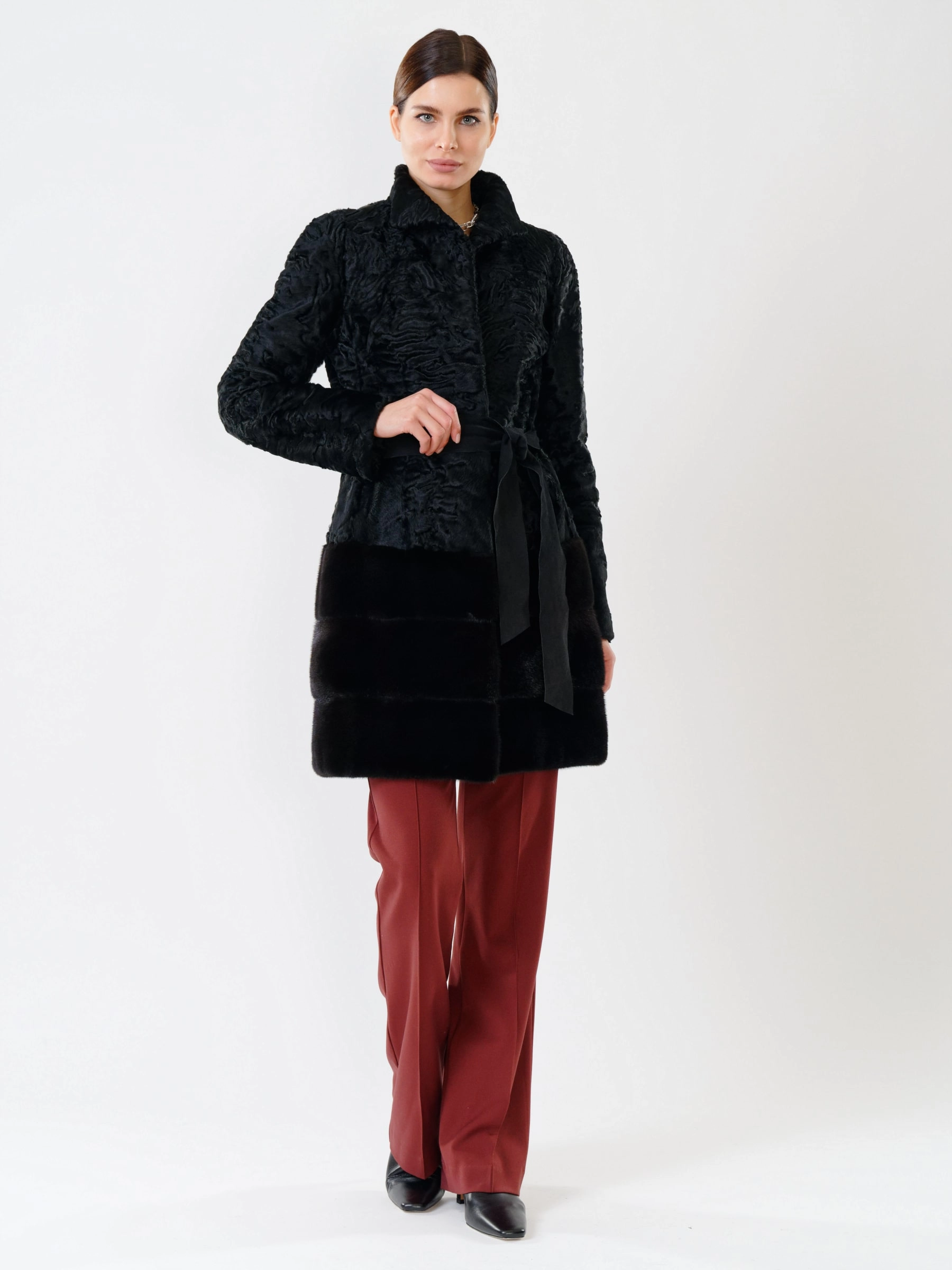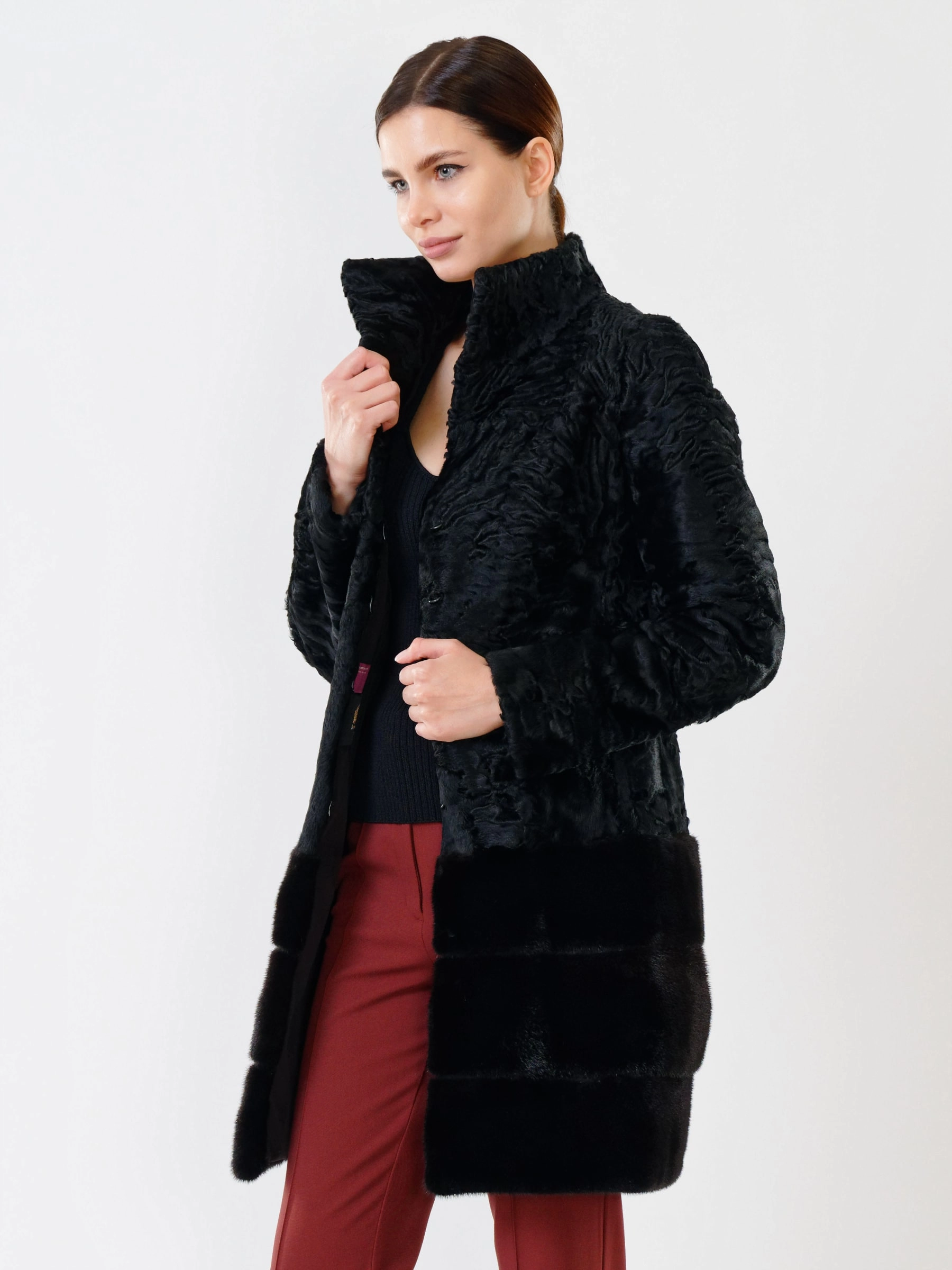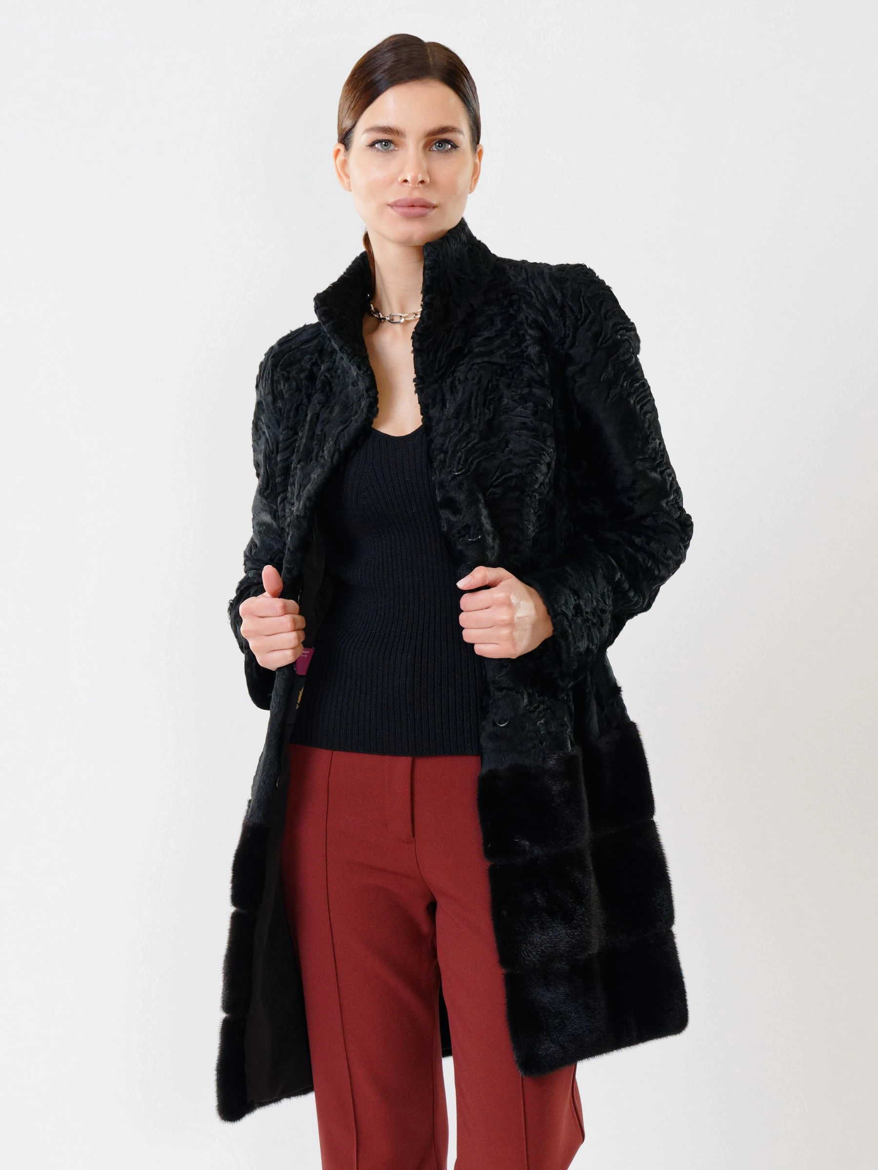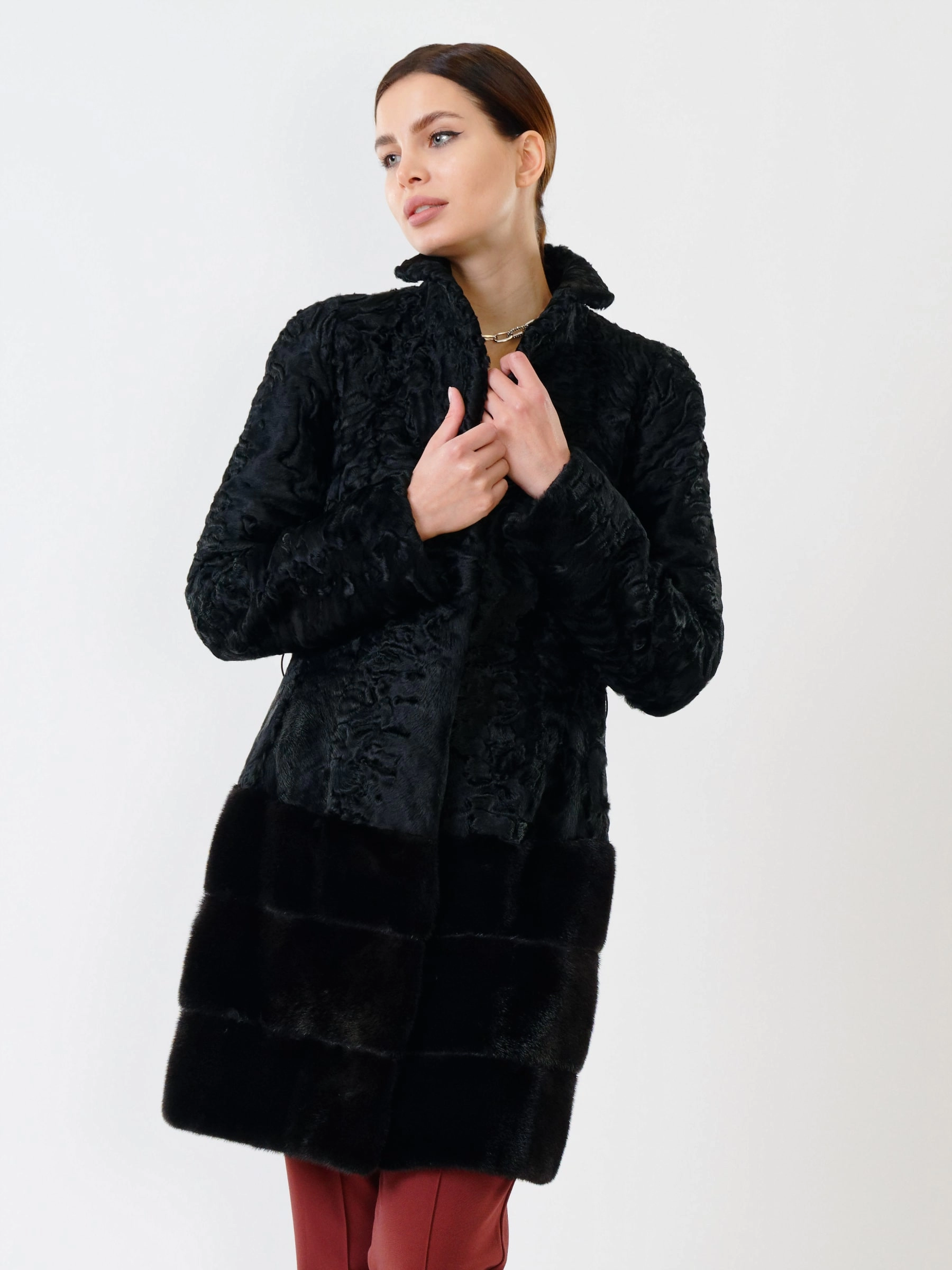 Роскошная шуба из меха каракуля без капюшона с элегантным воротником-стойкой из норки. Полуприлегающий силуэт и втачной рукав подчеркивают фигуру, создавая утонченный образ. Стилисты рекомендуют носить ее с платьем-чехлом и туфлями-лодочками для вечернего выхода или с узкими джинсами и сапогами на каблуке для повседневного образа. Эта модель — воплощение изысканности и безупречного вкуса, где каждая деталь выверена до мелочей.