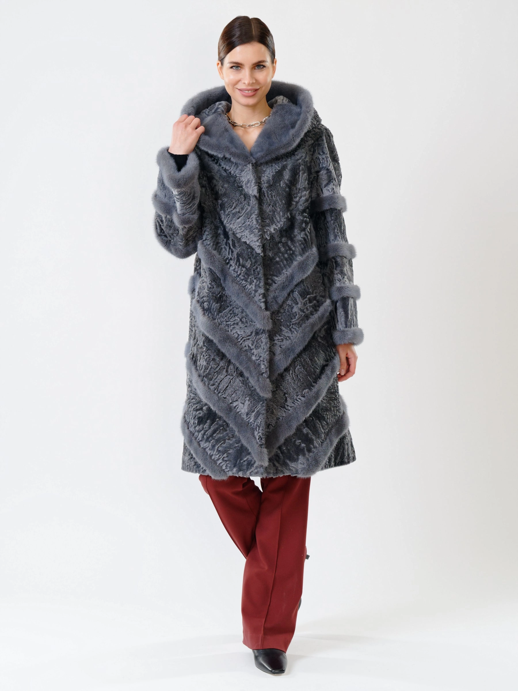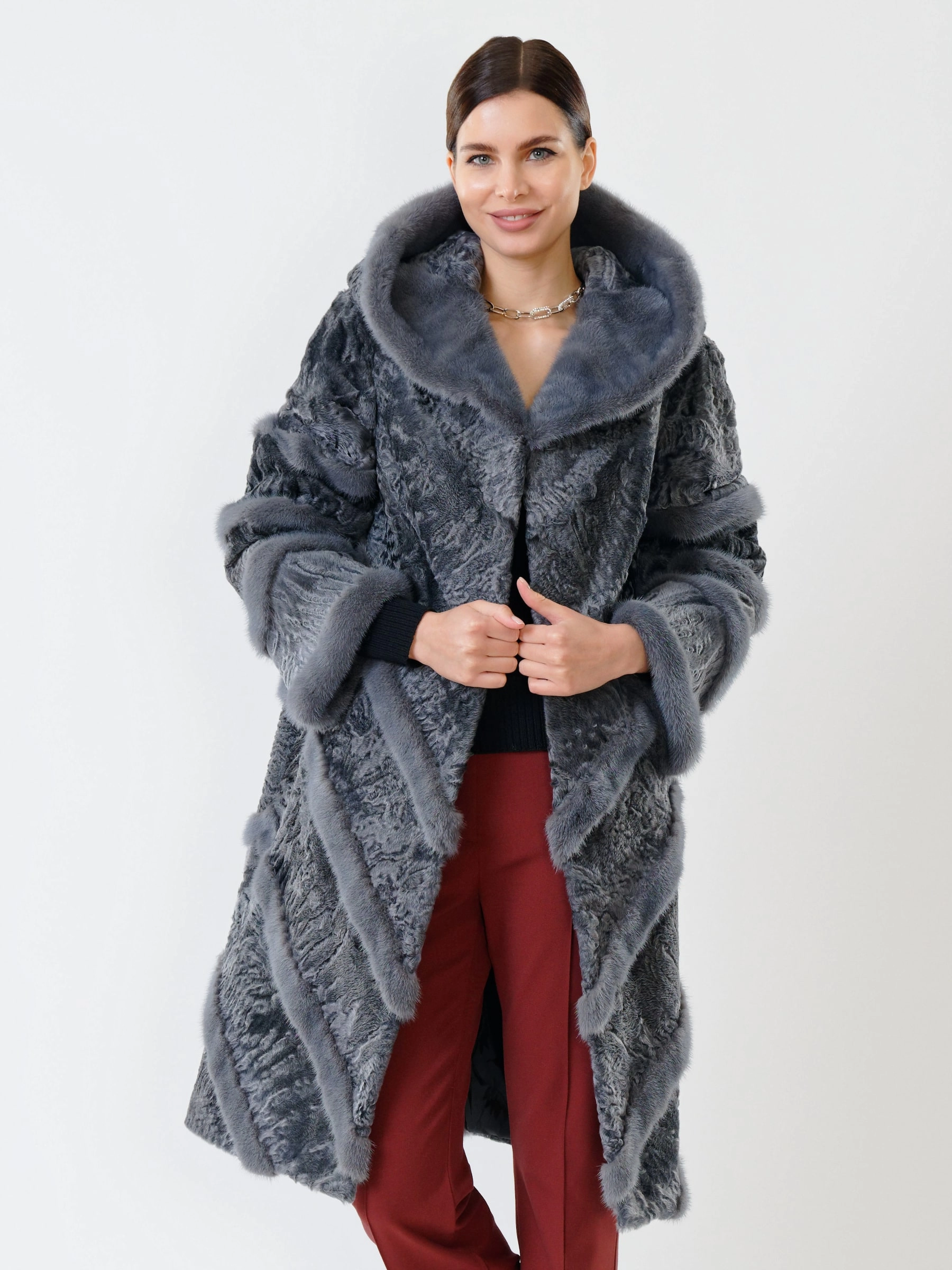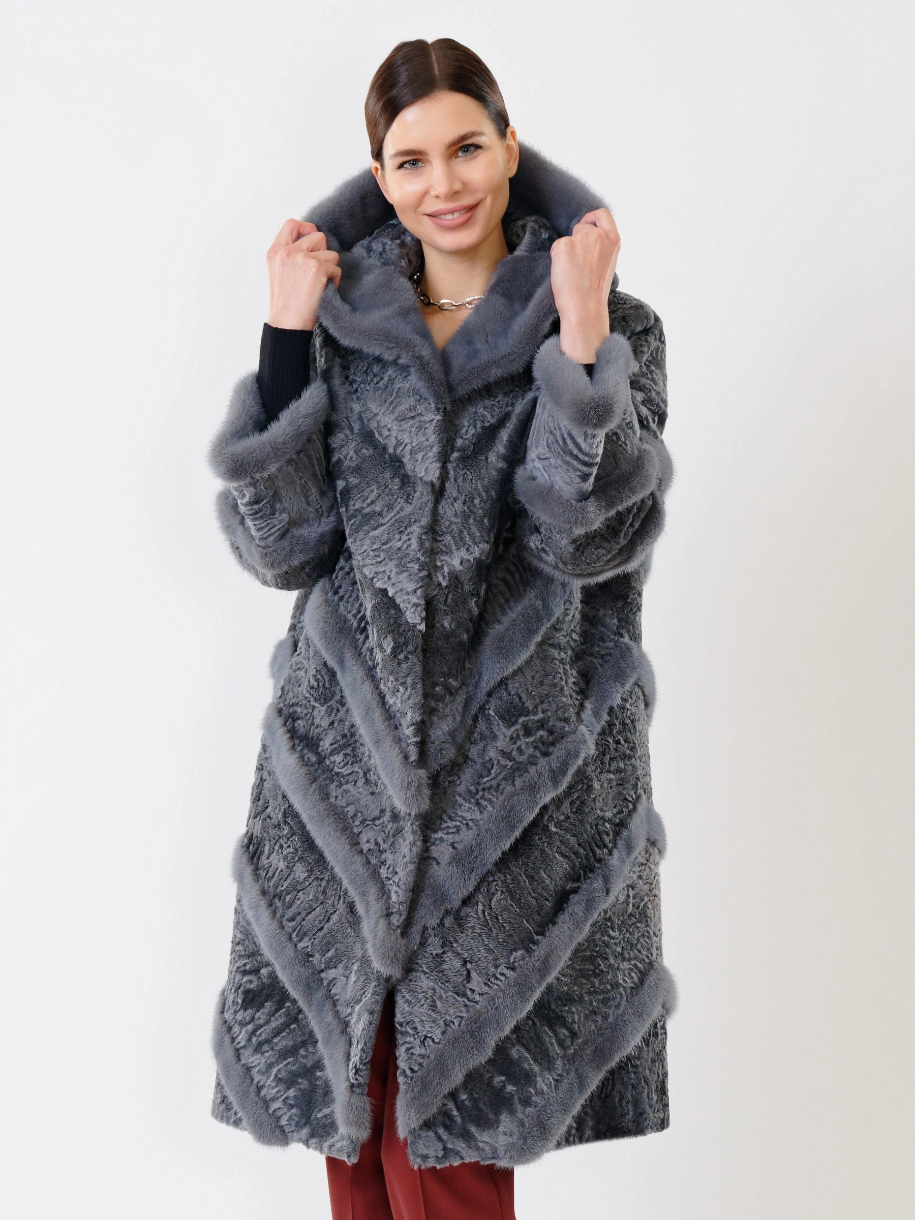 Каракулевая женская шуба с капюшоном и мехом норки 336(кн), серая, размер 48, артикул 22520