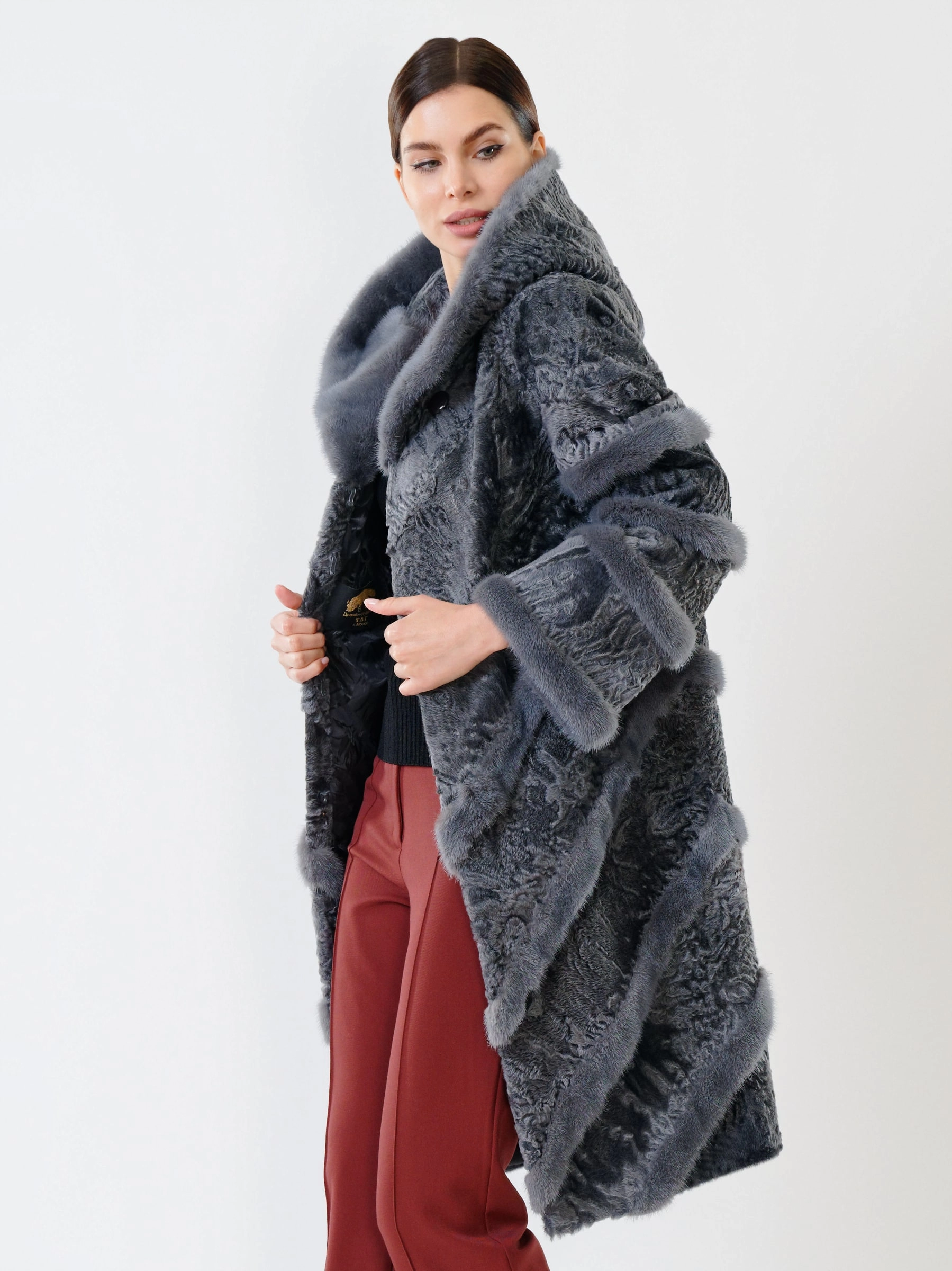 Товар каракулевая женская шуба с капюшоном и мехом норки 336(кн), серая, размер 48, артикул 22520 выполнен из мех каракуля с застежкой клипсы. Рассчитан на сезон: осень-зима. Длина изделия свыше 90 см, силуэт прямой.