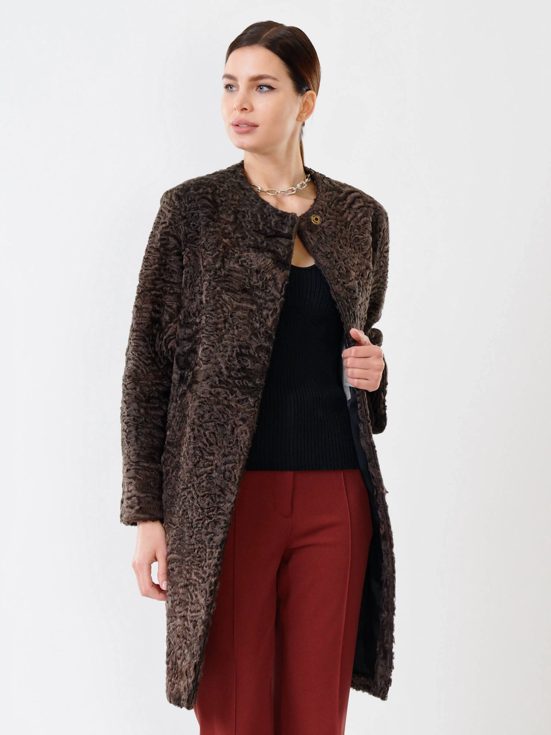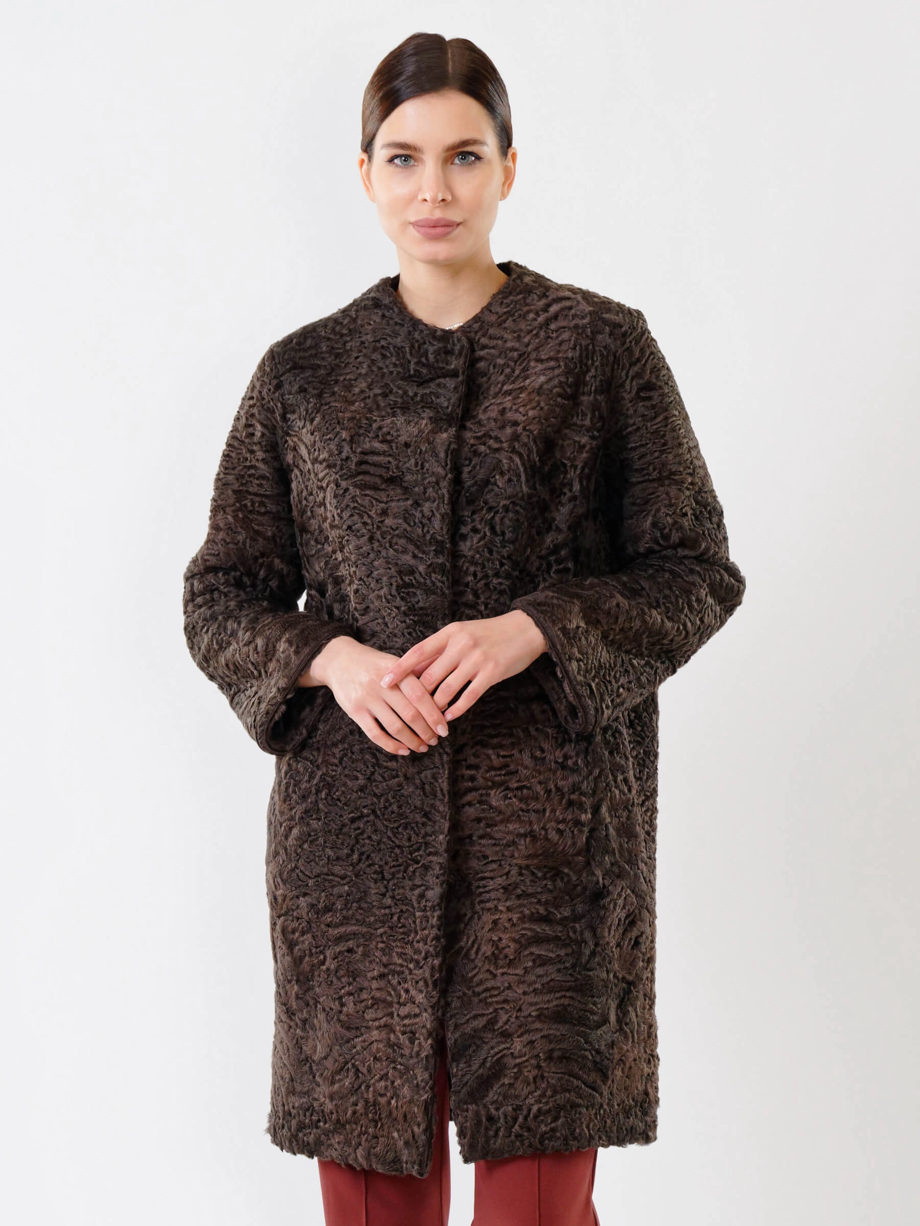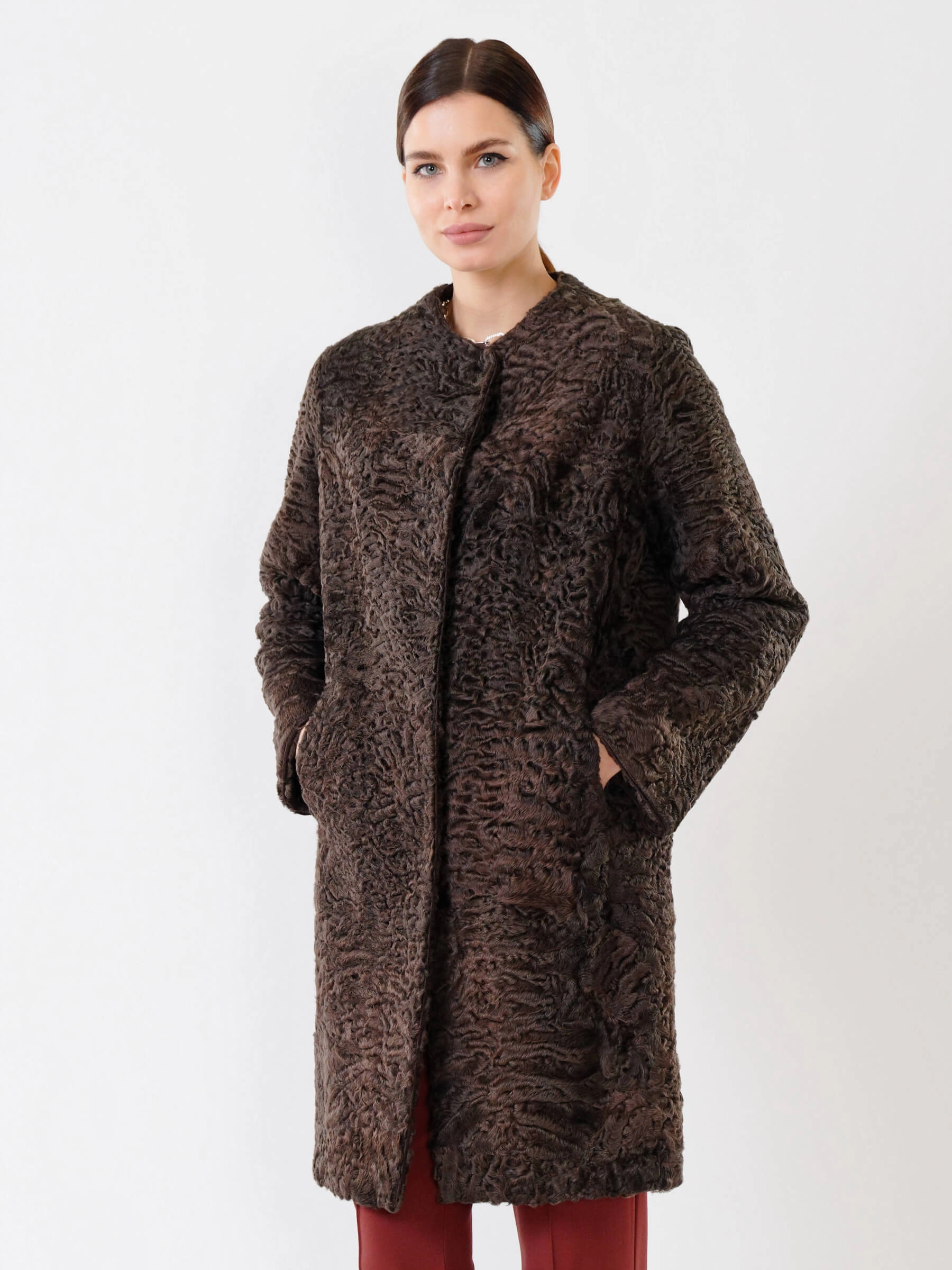 Полуприлегающее пальто длиной от 90 см из каракуля с тугой плоской завивкой сочетает застёжку на клипсах и аккуратные карманы, создающие лаконичный силуэт, а ювелирный подбор шкурок по оттенку гарантирует безупречную посадку — совет стилиста: сочетайте его с кожаными брюками и лаковыми сапогами для вечернего выхода или с джинсами-скинни и кашемировым свитером для повседневной элегантности, и эта вещь премиум-уровня подчеркнёт ваш утончённый вкус.