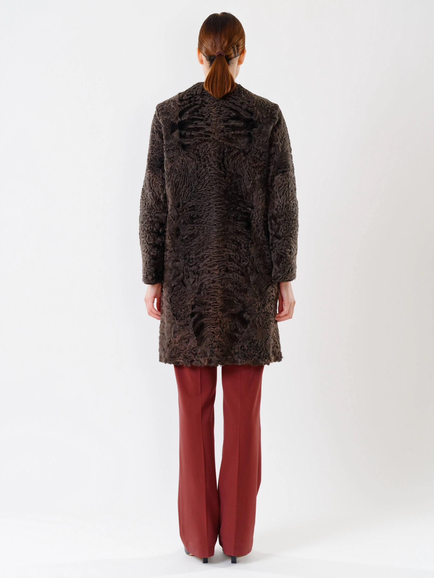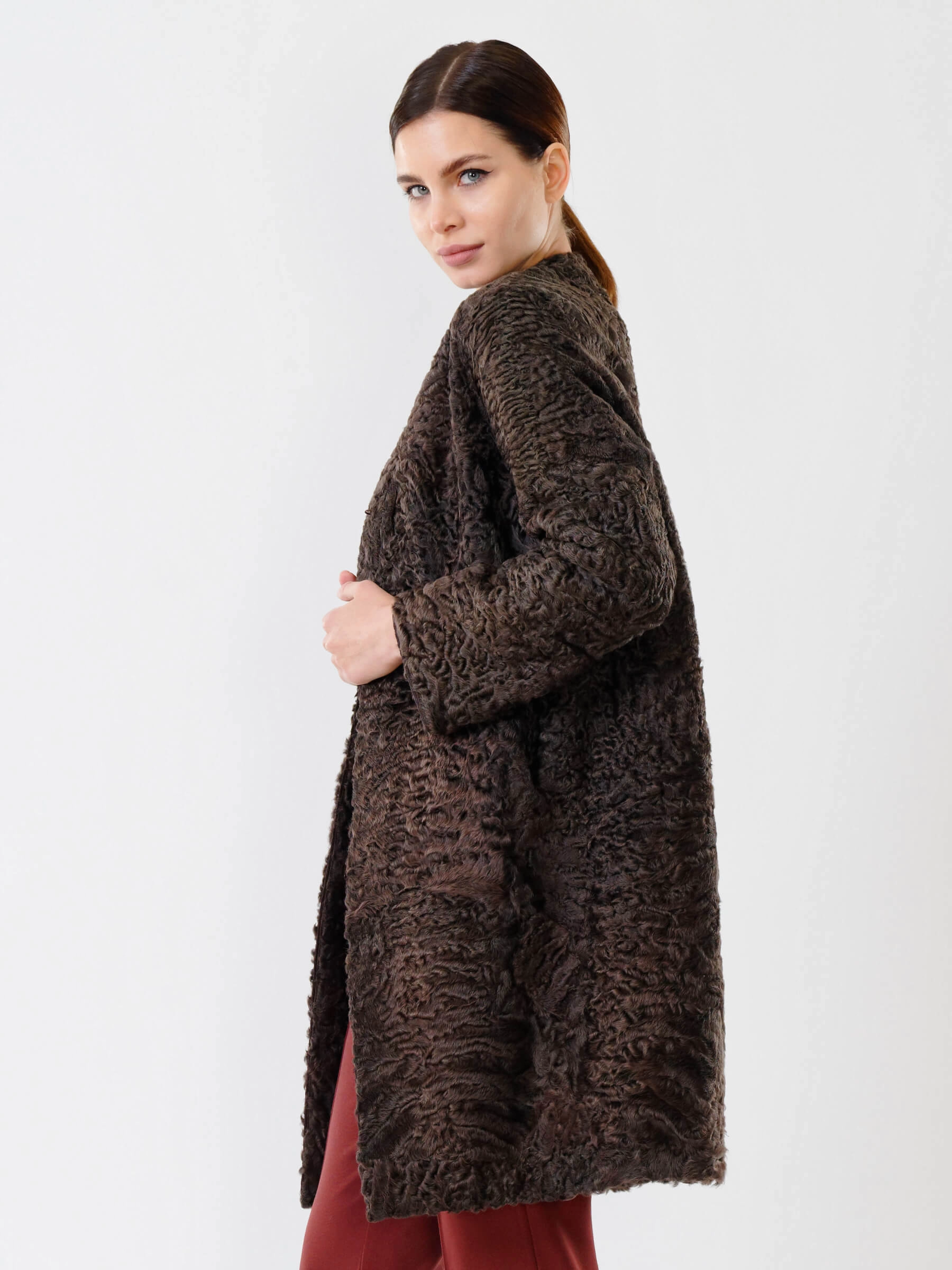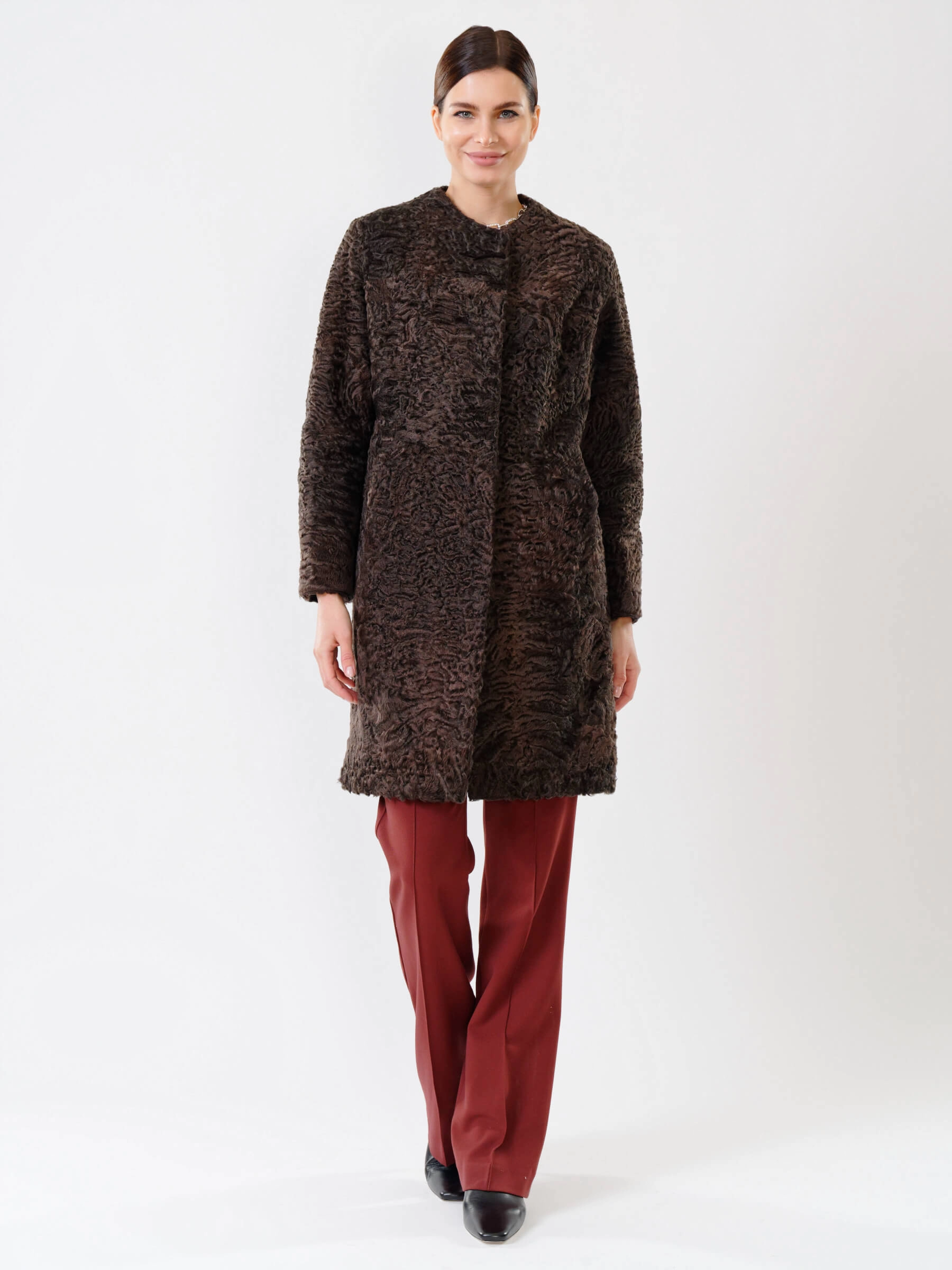 Полуприлегающее пальто длиной от 90 см из каракуля с тугой плоской завивкой сочетает застёжку на клипсах и аккуратные карманы, создающие лаконичный силуэт, а ювелирный подбор шкурок по оттенку гарантирует безупречную посадку — совет стилиста: сочетайте его с кожаными брюками и лаковыми сапогами для вечернего выхода или с джинсами-скинни и кашемировым свитером для повседневной элегантности, и эта вещь премиум-уровня подчеркнёт ваш утончённый вкус.