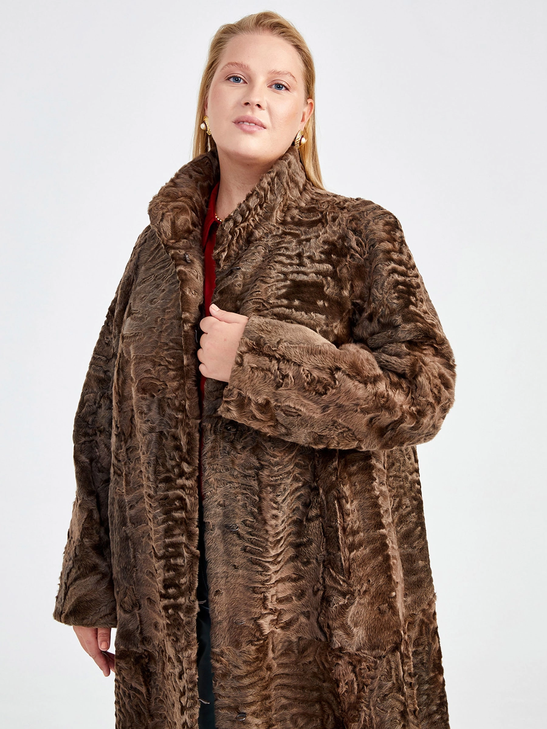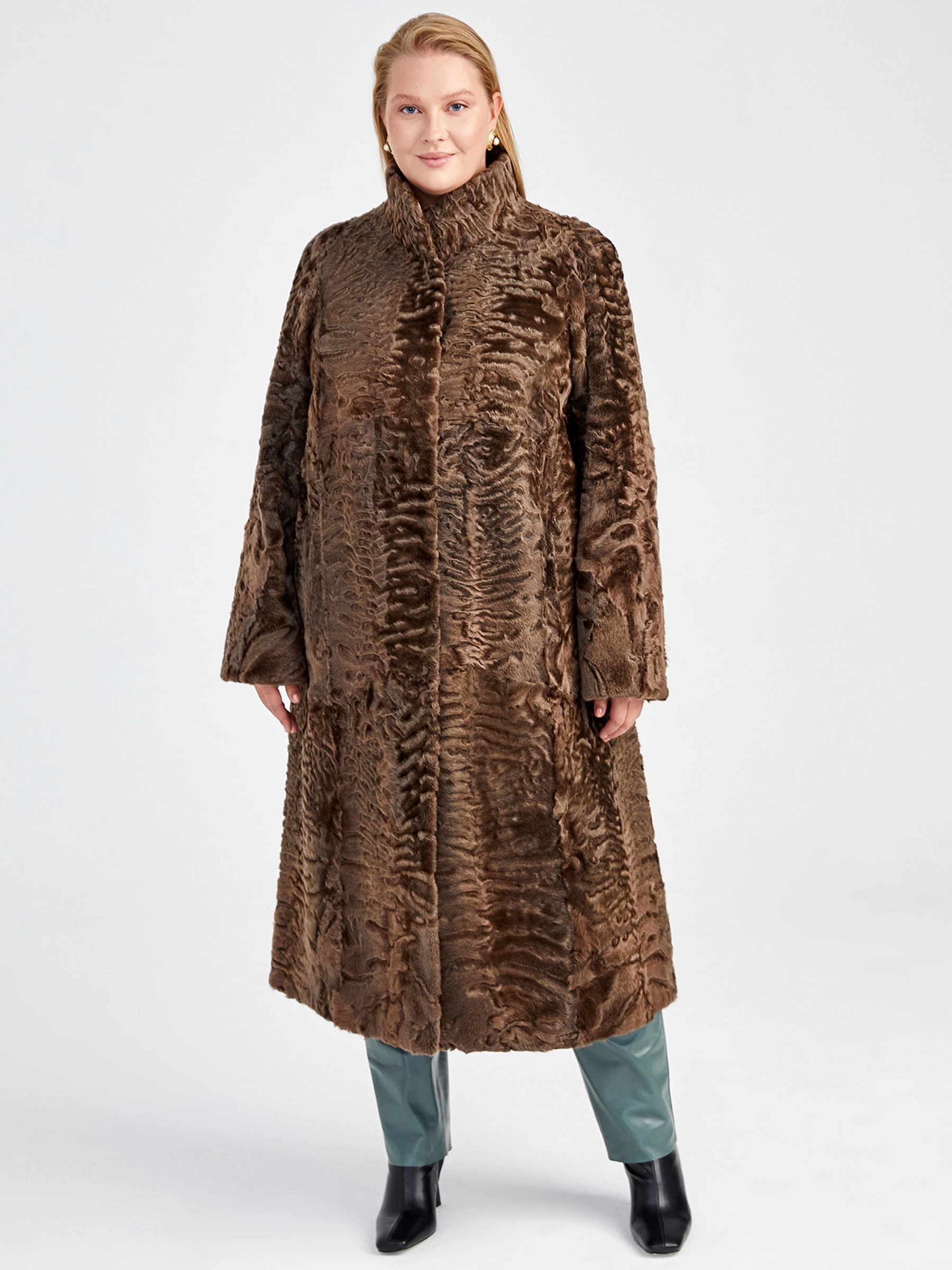 Элегантная модель силуэта трапеция длиной 115 см из шелковистого каракуля с упругими завитками и благородным блеском: воротник-стойка подчеркивает классический стиль, а два врезных кармана и застёжка на клипсах добавляют практичности. Совет стилиста: сочетайте с кожаными брюками и лаковыми сапогами для вечернего выхода или с платьем-миди и ботильонами для дневного элегантного образа — эта шуба подчеркнёт ваш статус и любовь к исключительным вещам.