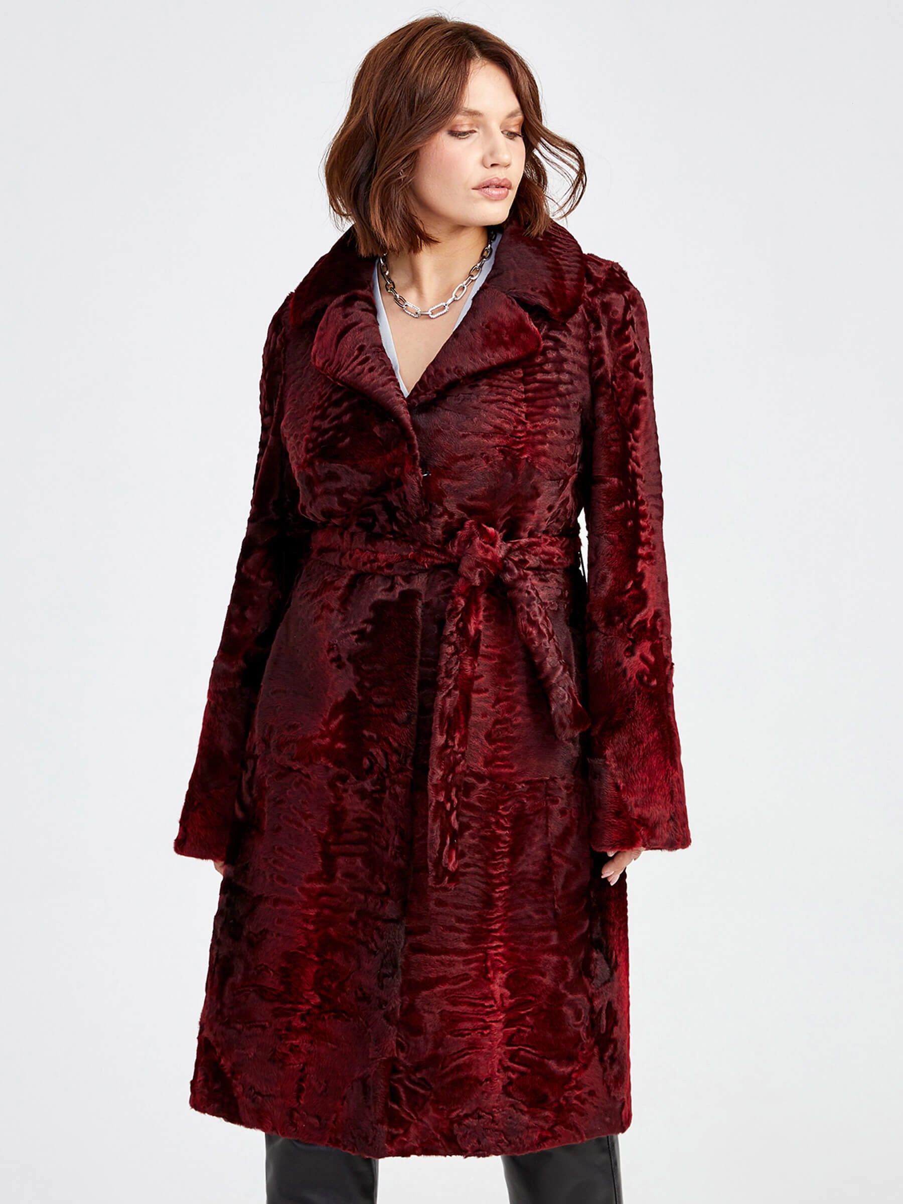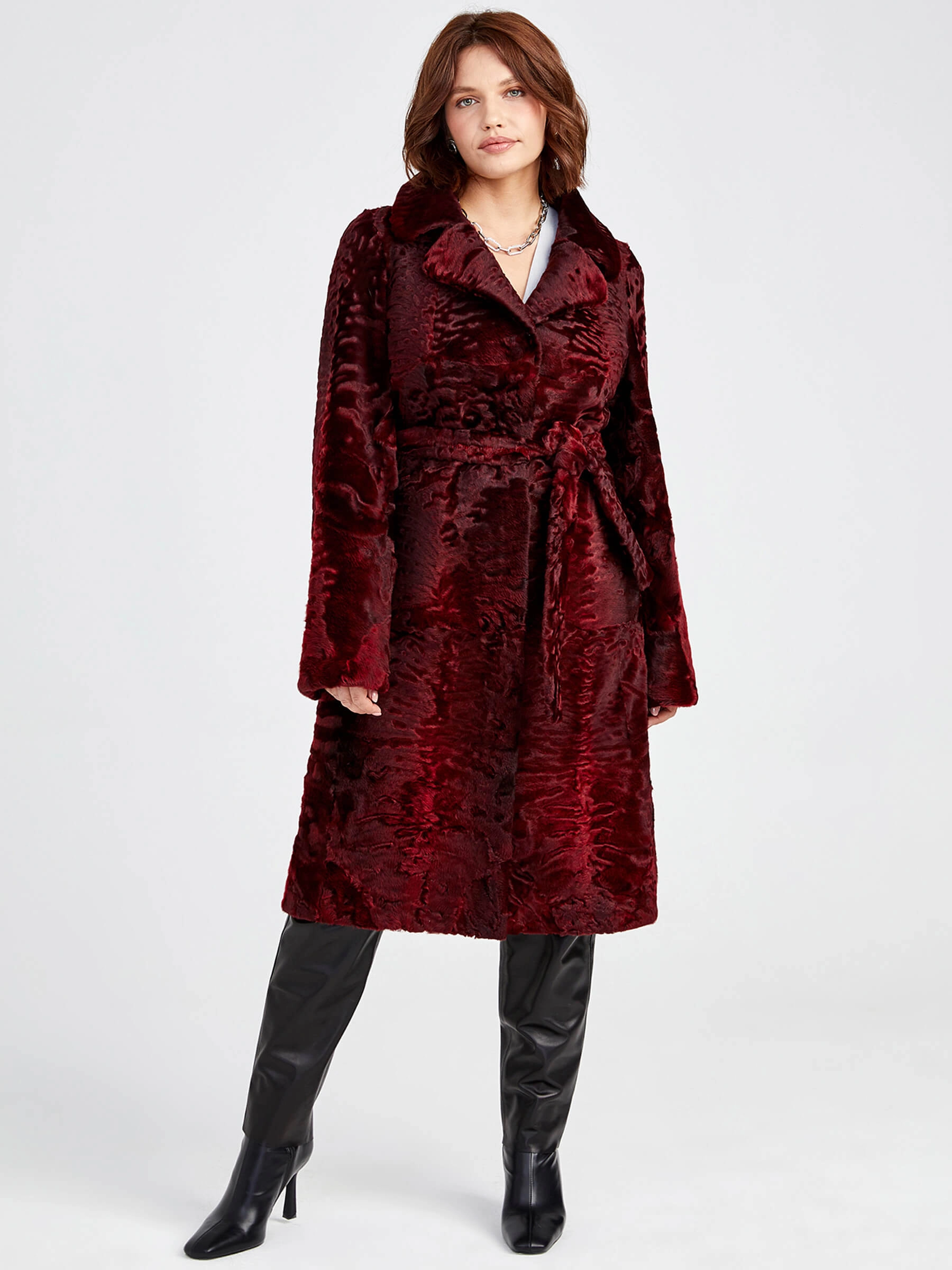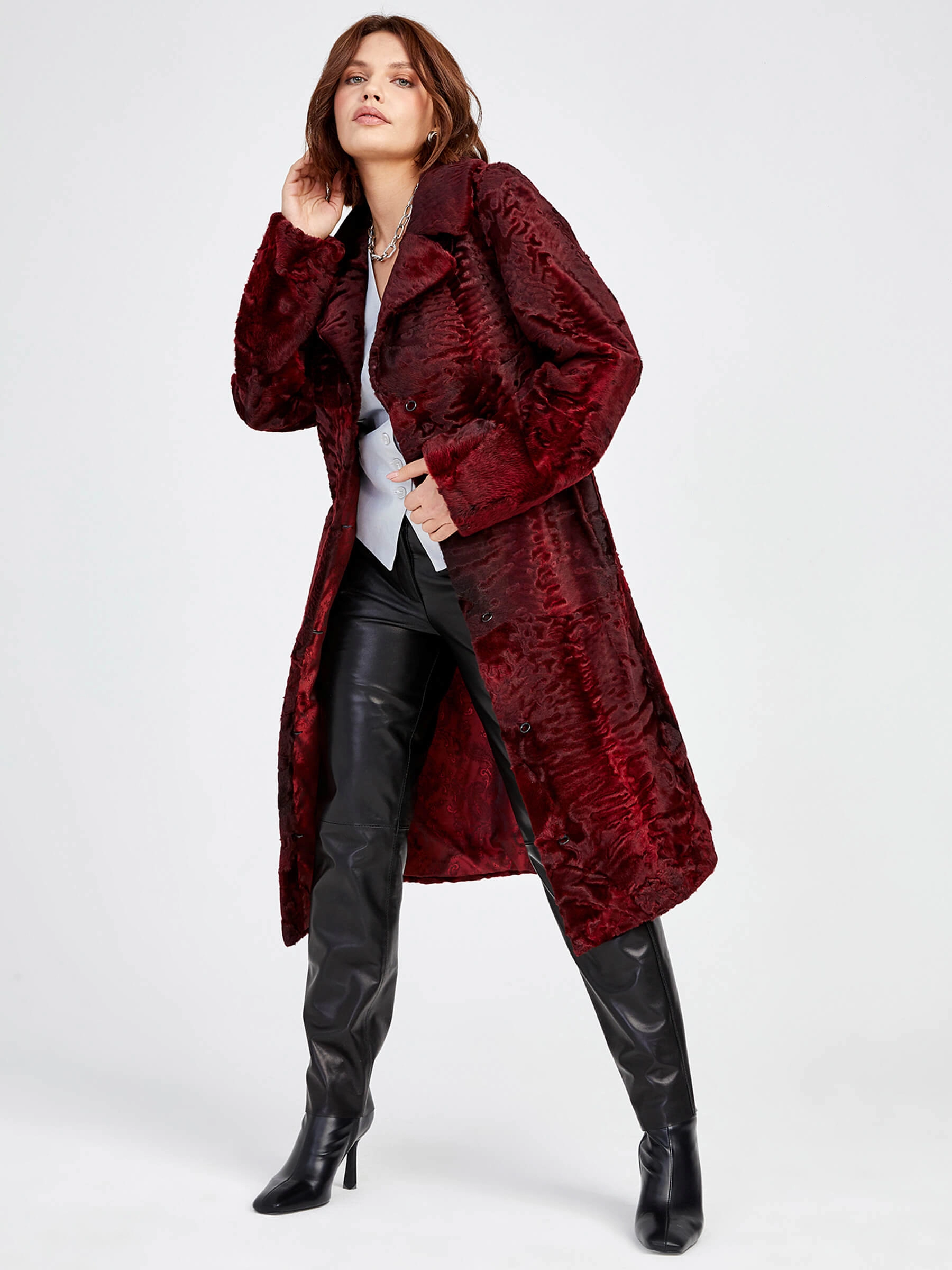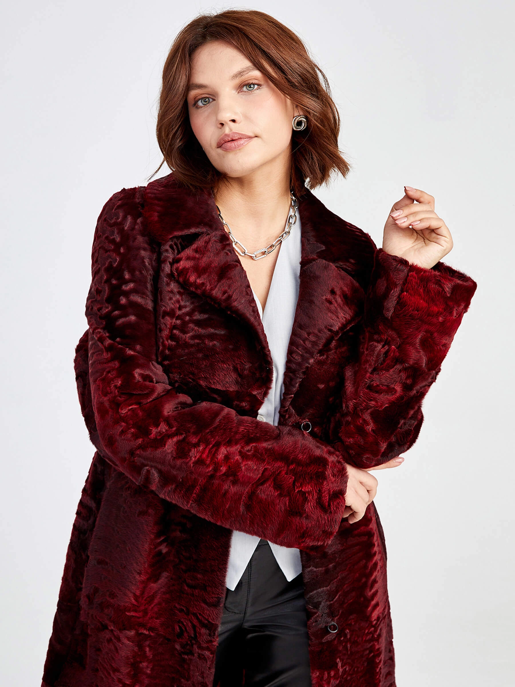 Товар шуба из меха каракуля для женщин лола(в) _2, бордовая, размер 48, артикул 22780 выполнен из мех каракуля с застежкой клипсы. Рассчитан на сезон: осень-зима. Длина изделия свыше 90 см, силуэт прямой.