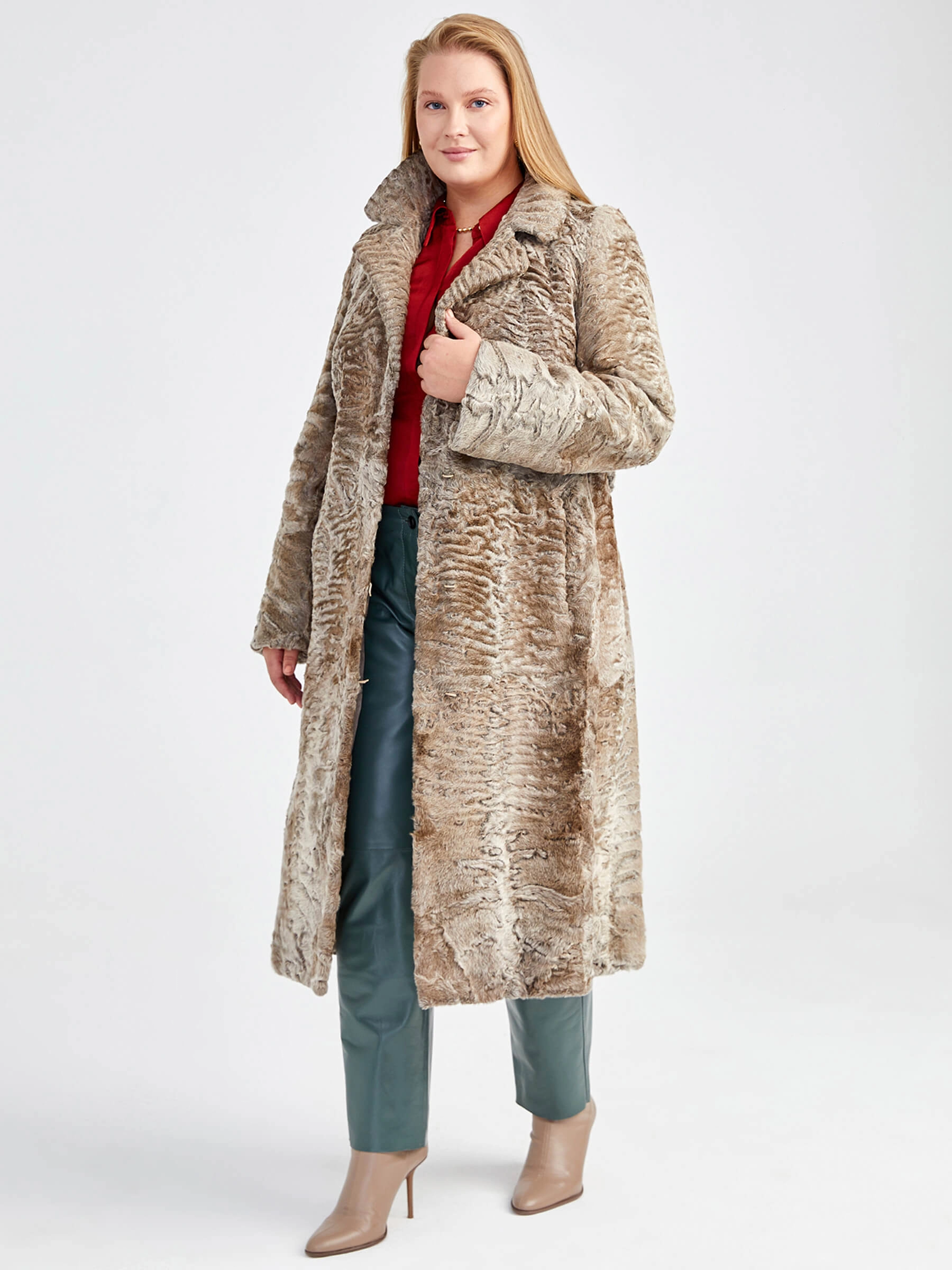 Элегантное пальто прямого кроя длиной 115 см из каракульчи с безупречным подбором шкурок по оттенку и уникальным рисунком завитков: английский воротник и застёжка на клипсах создают элегантный силуэт, а два врезных кармана и шлица сзади обеспечивают комфорт движения. Рекомендация стилиста: сочетайте с кожаными брюками и лаковыми сапогами для вечернего выхода в свет или с платьем-миди и бархатными ботильонами для романтичного образа — эта шуба подчеркнёт ваш безупречный вкус и любовь к вечной классике.