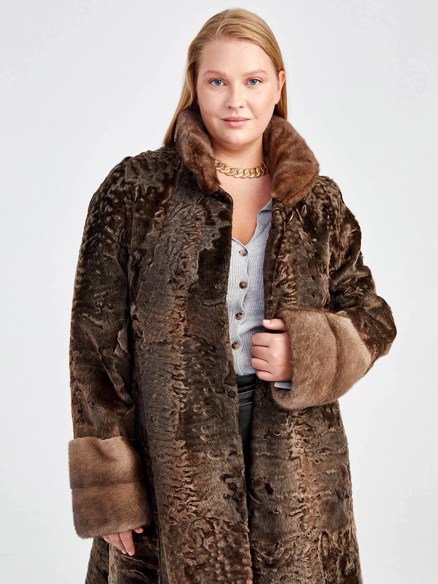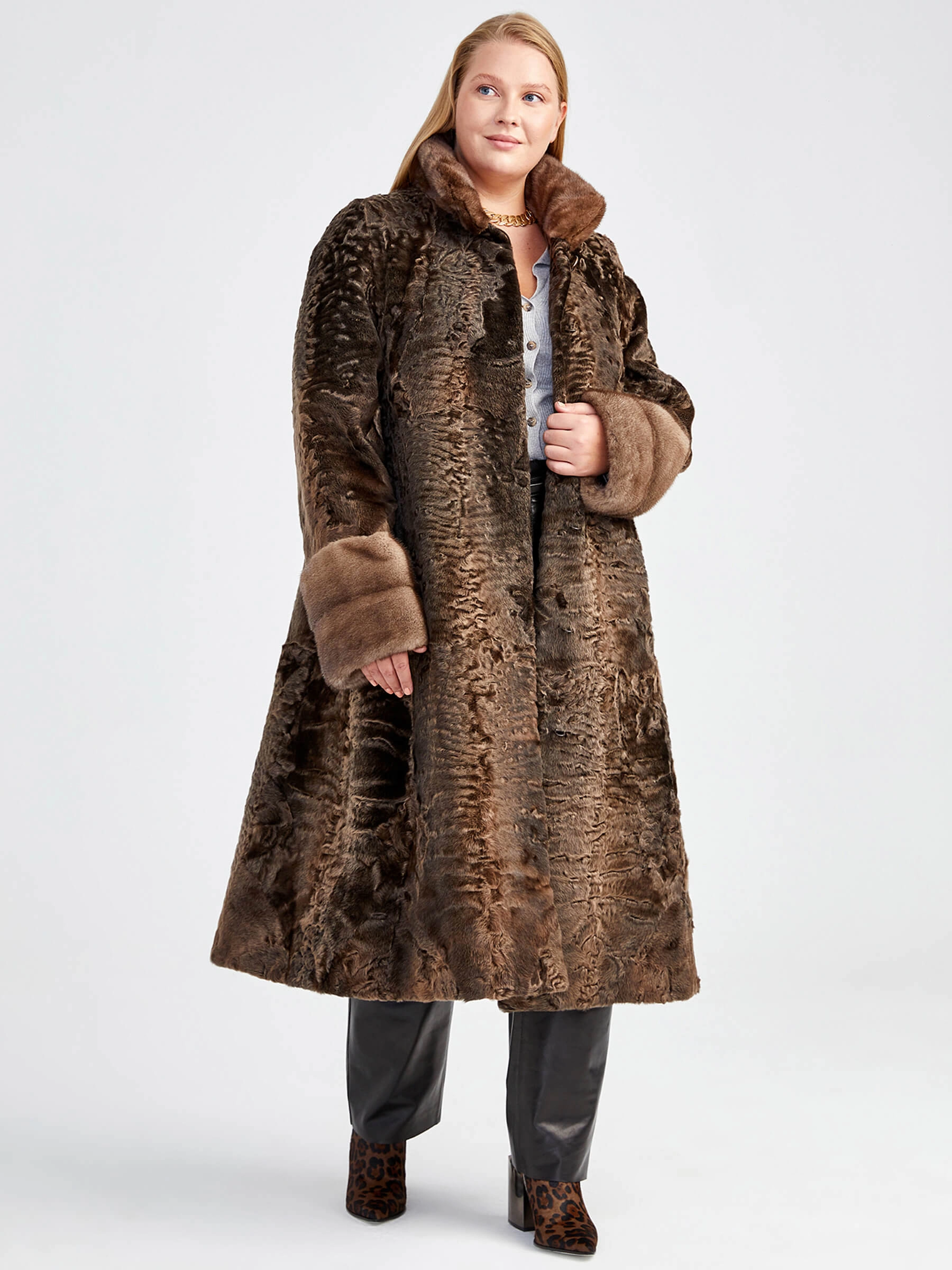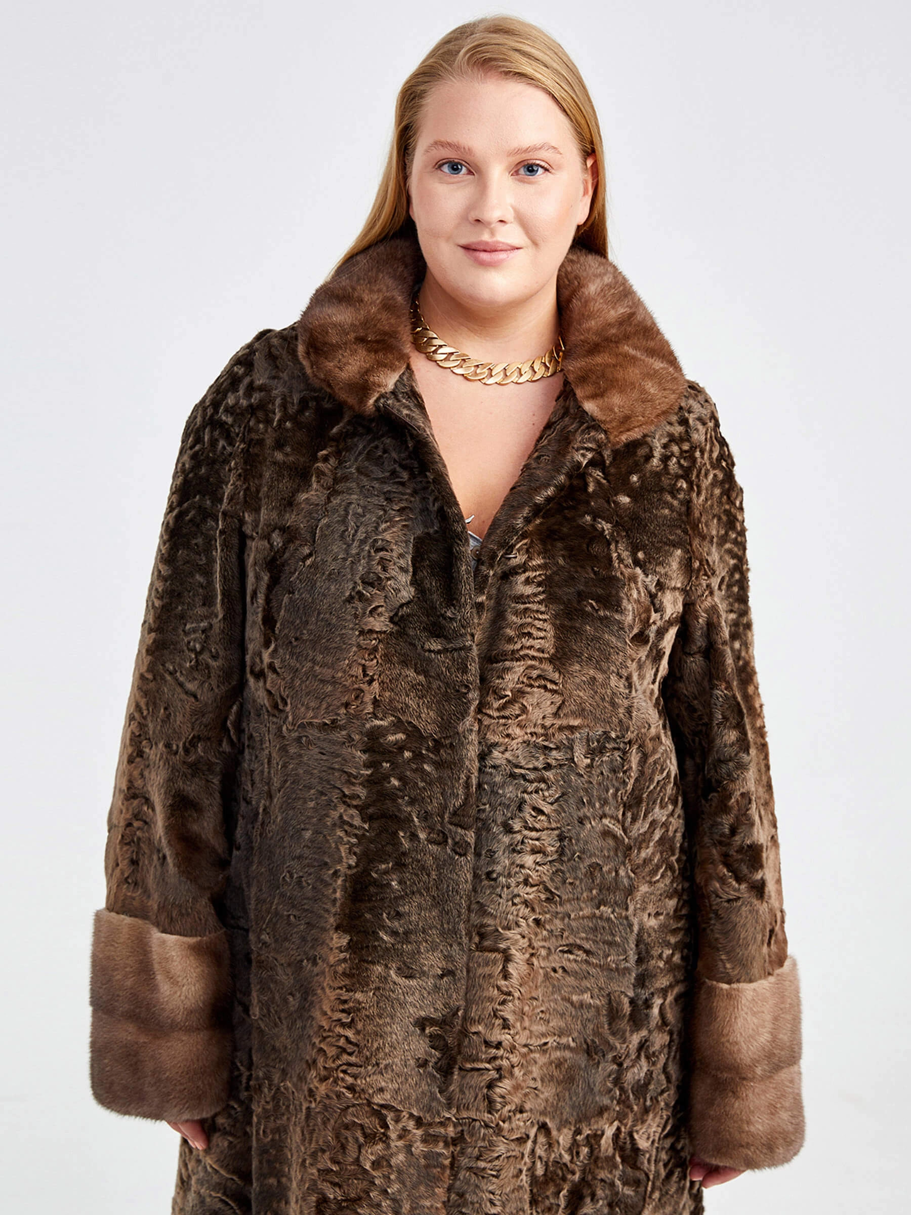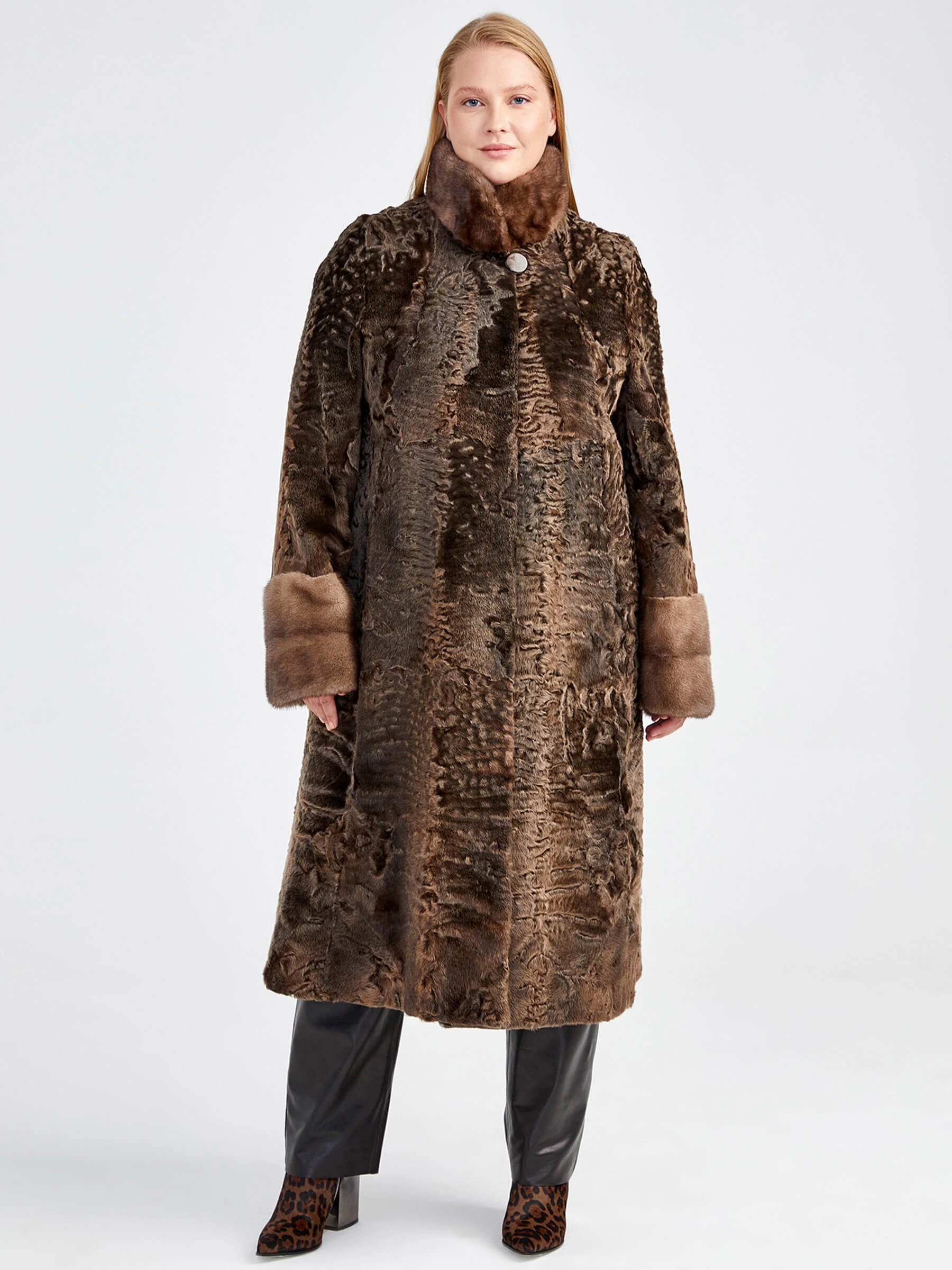 Товар женская шуба из меха каракуля с мехом норки надежда(сн) _1, бронзовая, размер 64, артикул 22800 выполнен из мех каракуля с застежкой клипсы. Рассчитан на сезон: осень-зима. Длина изделия свыше 90 см, силуэт прямой.