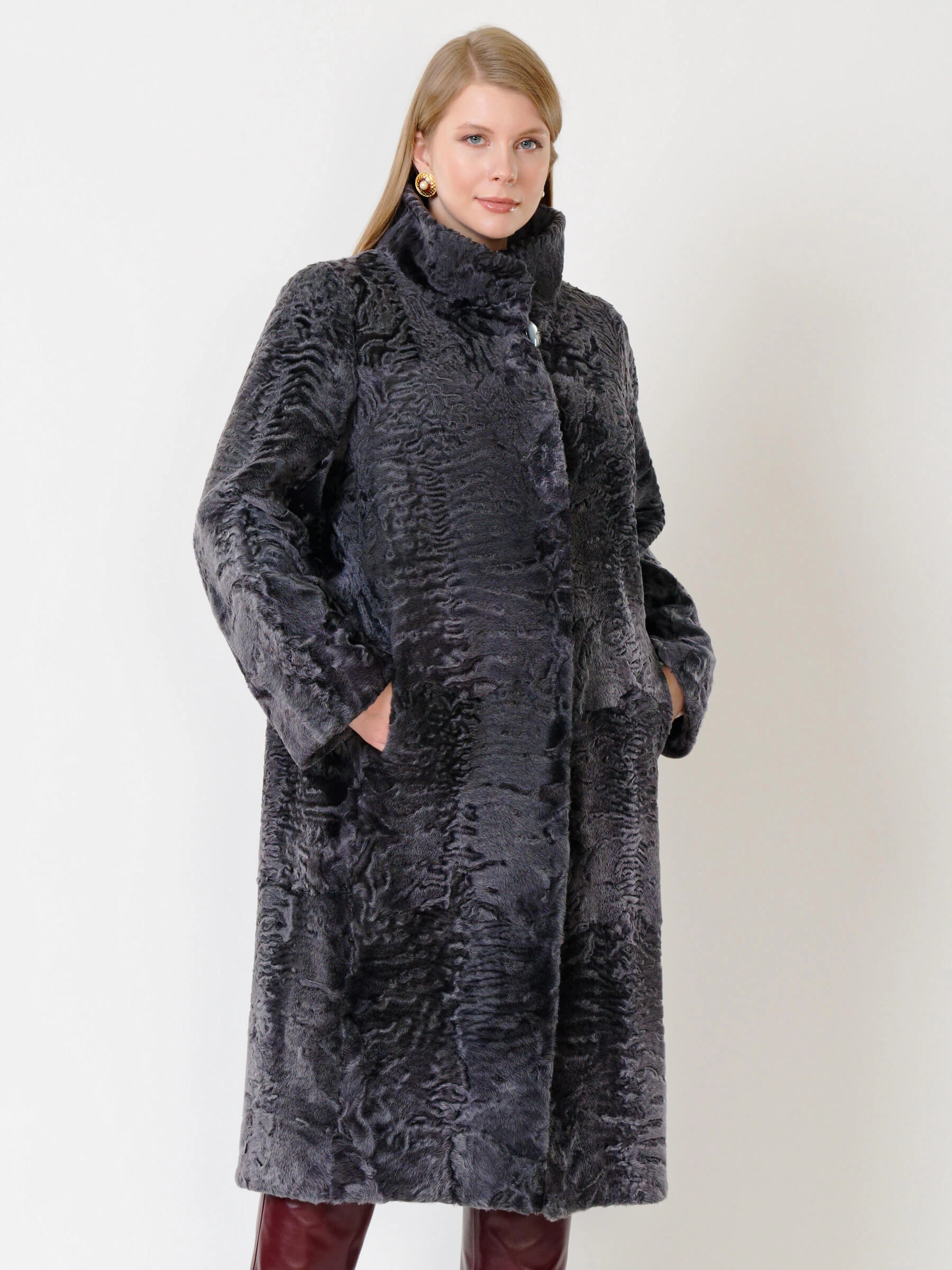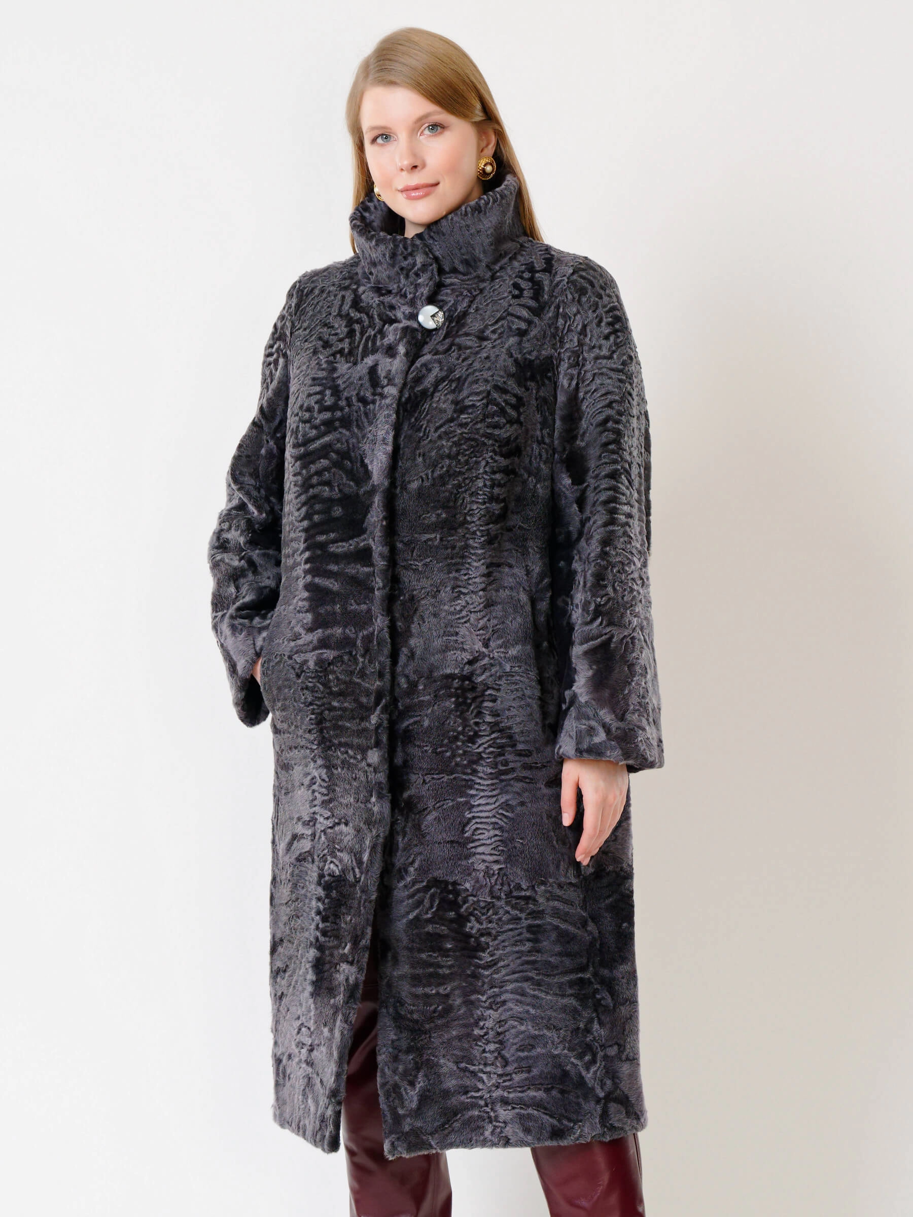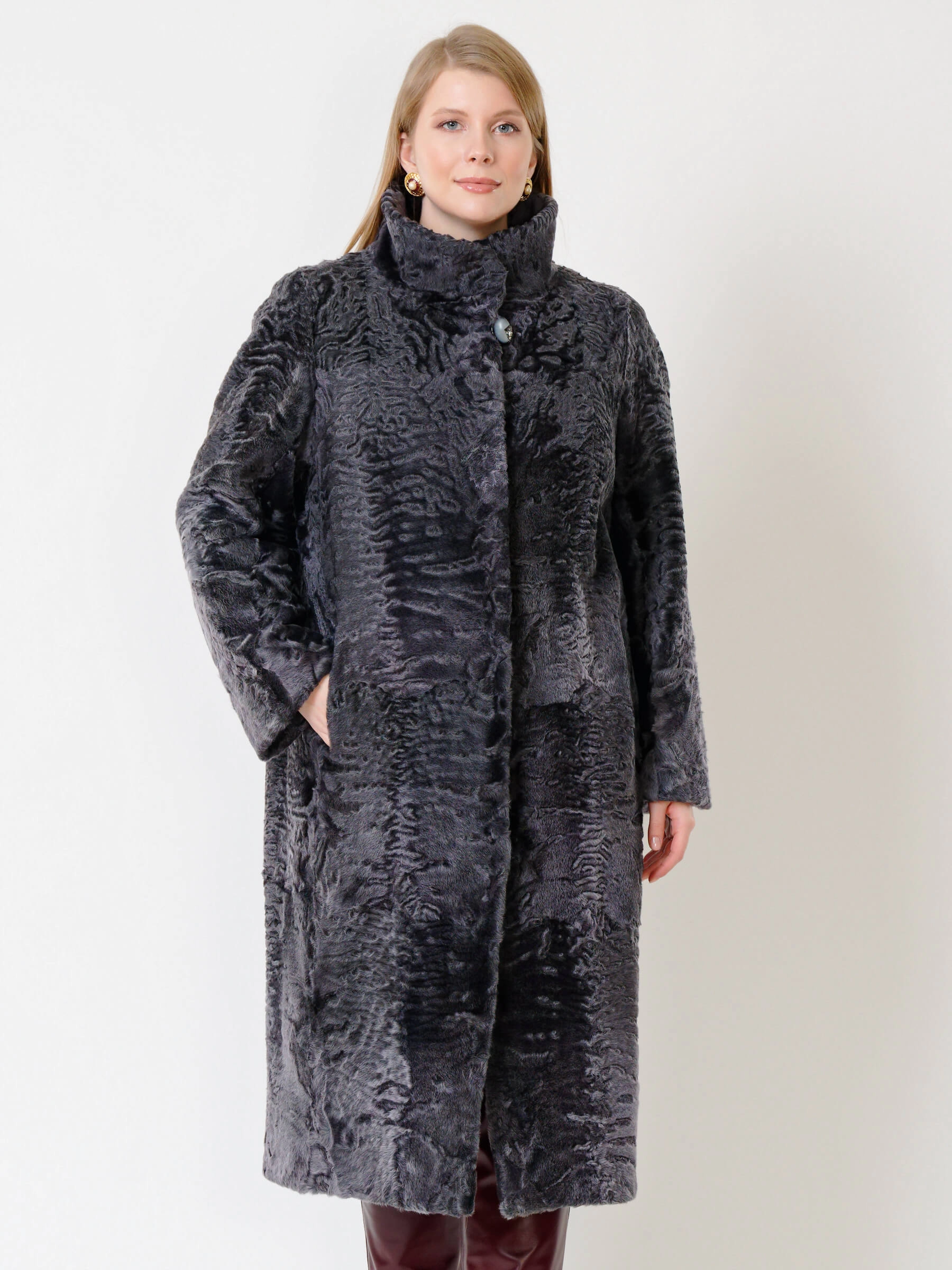 Элегантная длинная шуба из меха каракуля с воротником-стойкой на клипсах представлена в классическом прямом силуэте свыше 120 см. Модель из афганского каракульчи благородного цвета перл с плотным плоским завитком и врезными карманами обеспечивает комфортную посадку. Совет стилиста: сочетайте с тонким свитером, кожаными брюками и сапогами для повседневного образа или с вечерним платьем и туфлями-лодочками для выхода в свет.