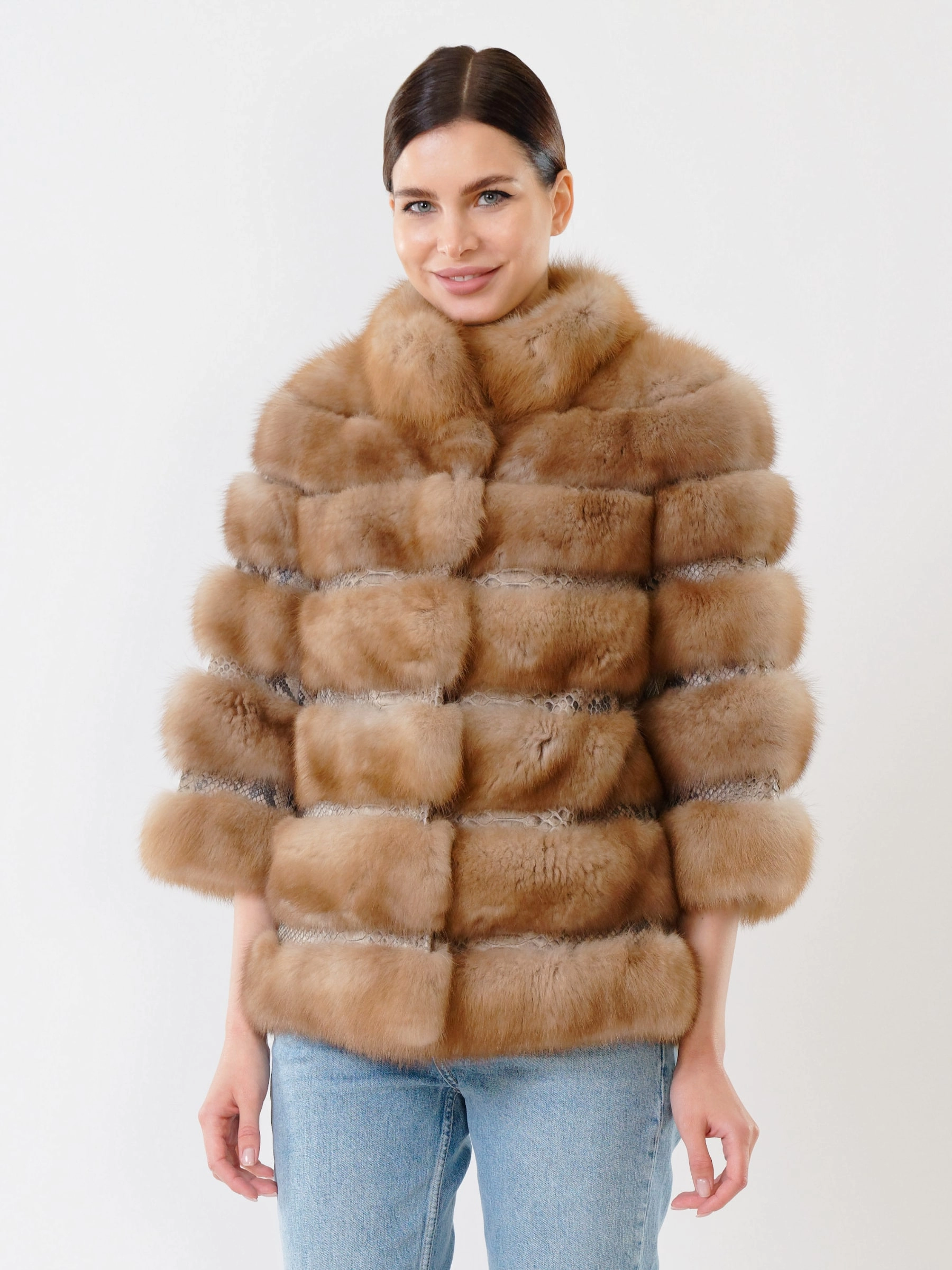 Представляем элегантную куртку из меха куницы, где классический силуэт встречается с экзотической отделкой. Модель прямого кроя длиной 88 см с лаконичным воротником-стойкой сшита из шкурок высшего качества, приобретённых на аукционе «СОЮЗПУШНИНА» и выделанных на фабрике «Мета-Сибирь». Визитной карточкой изделия является уникальная отделка: густой мех куницы искусно расшит фактурной кожей питона, что подчёркивает виртуозную работу наших мастеров. Завершают образ удобная застёжка на клипсах, мягкий подклад из 100% вискозы и официальная сертификация, подтверждающая высочайшее качество этой модели для сезона осень-зима.