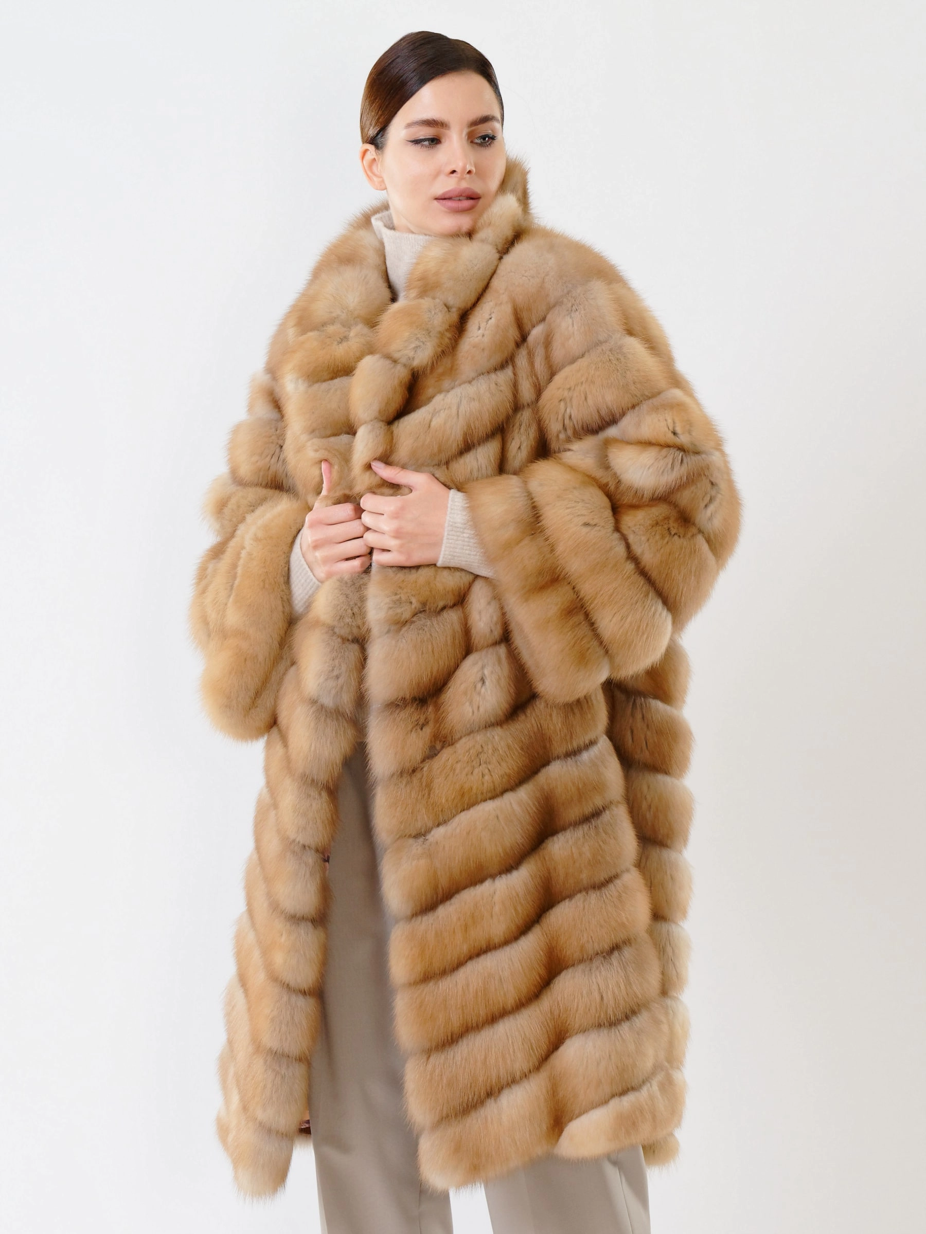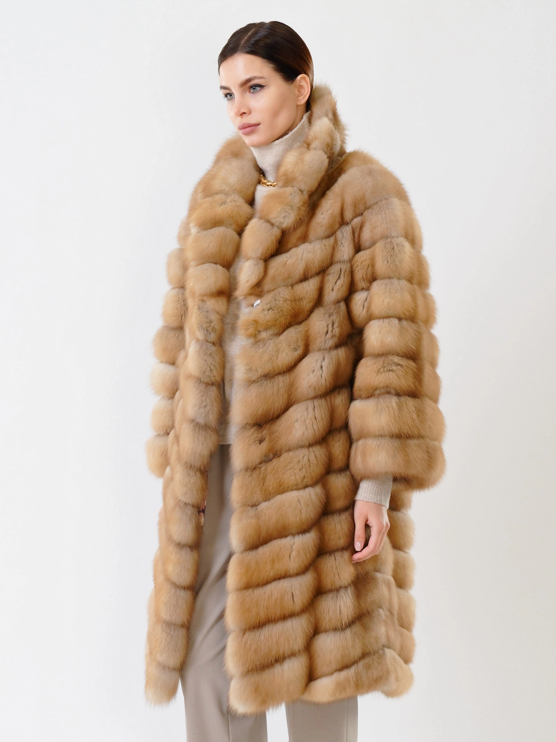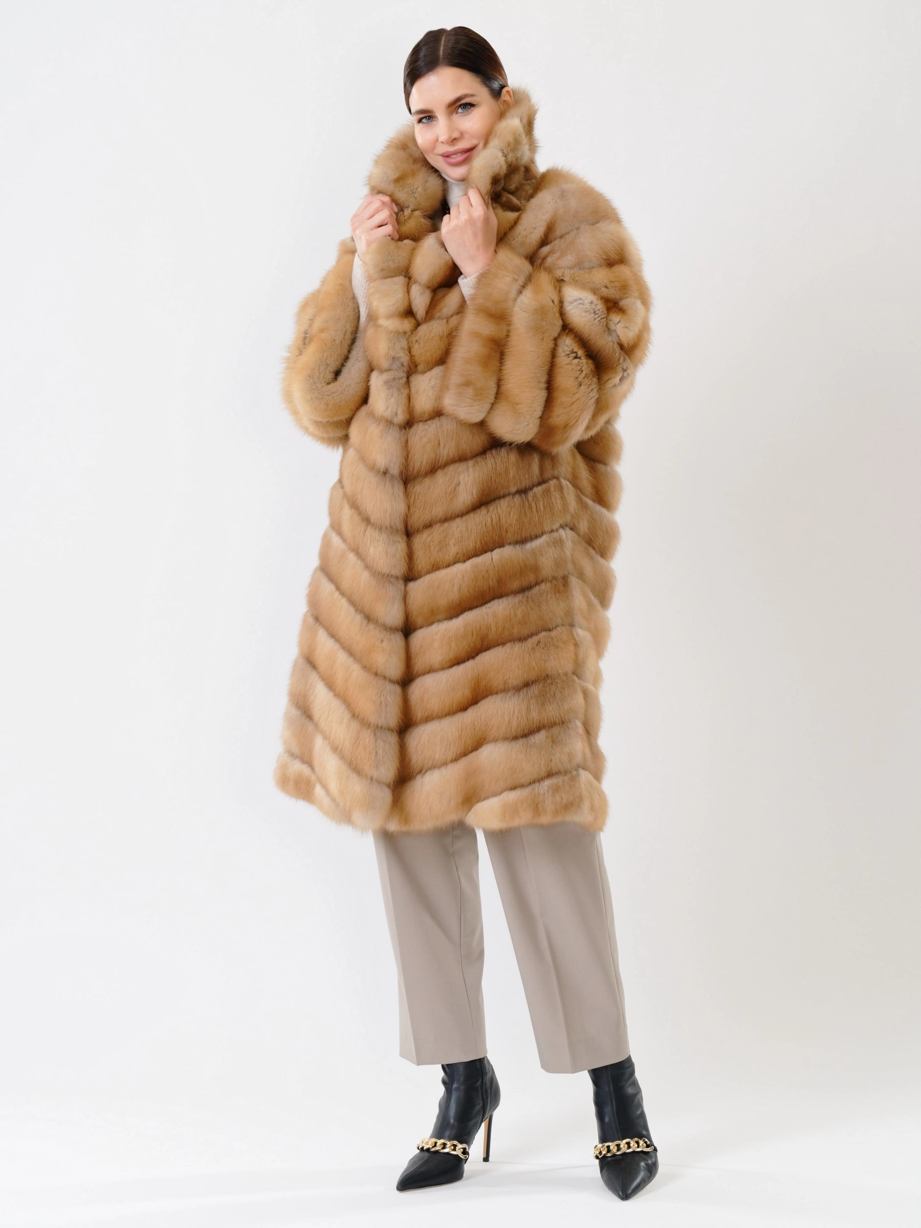 Длинная женская шуба из меха куницы премиум класса 318, светло-коричневая, размер 48, артикул 19040
