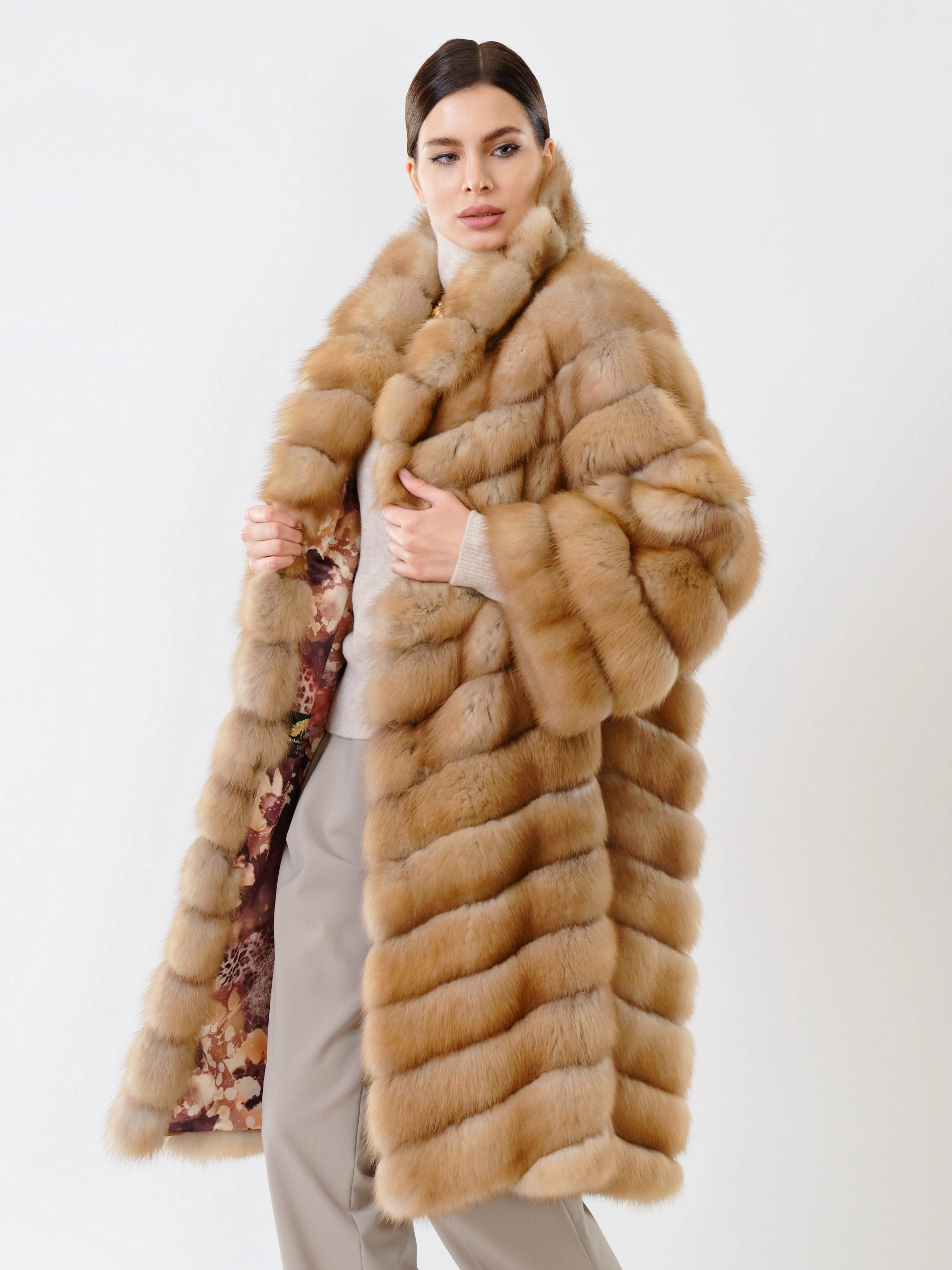 Товар длинная женская шуба из меха куницы премиум класса 318, светло-коричневая, размер 48, артикул 19040 выполнен из мех куницы с застежкой клипсы. Рассчитан на сезон: осень-зима. Длина изделия 51-74 см, силуэт свободный.