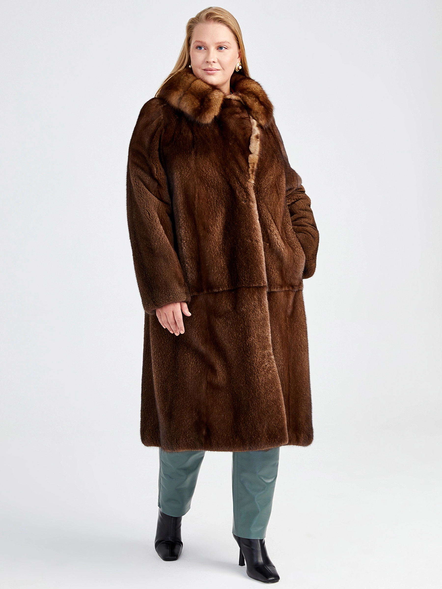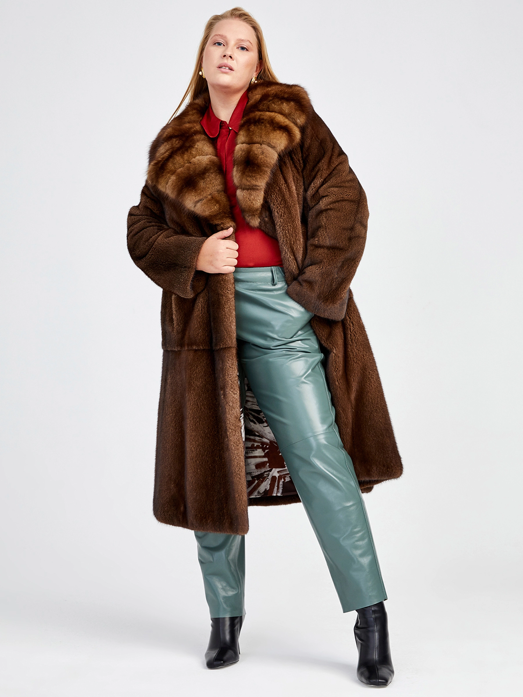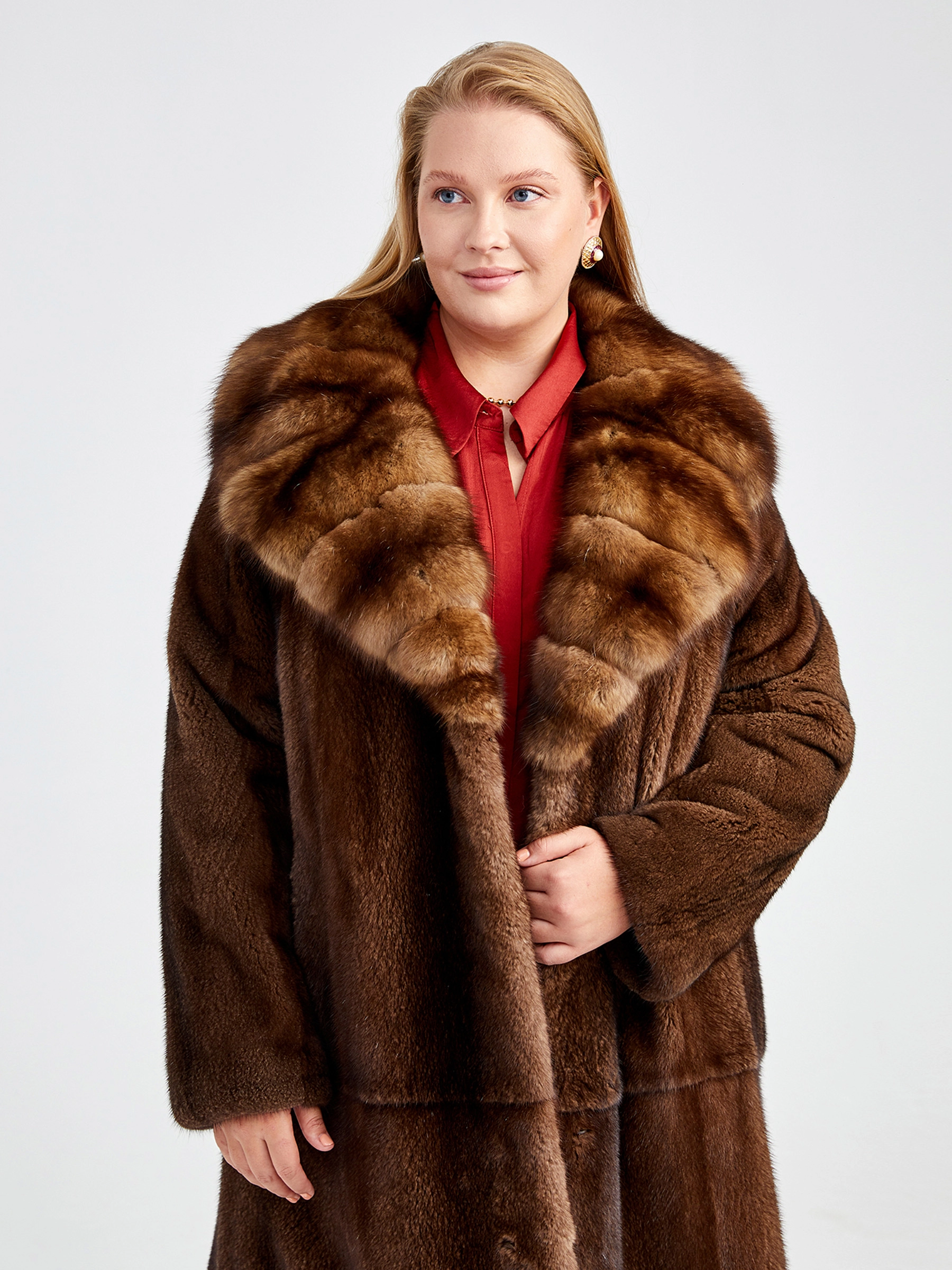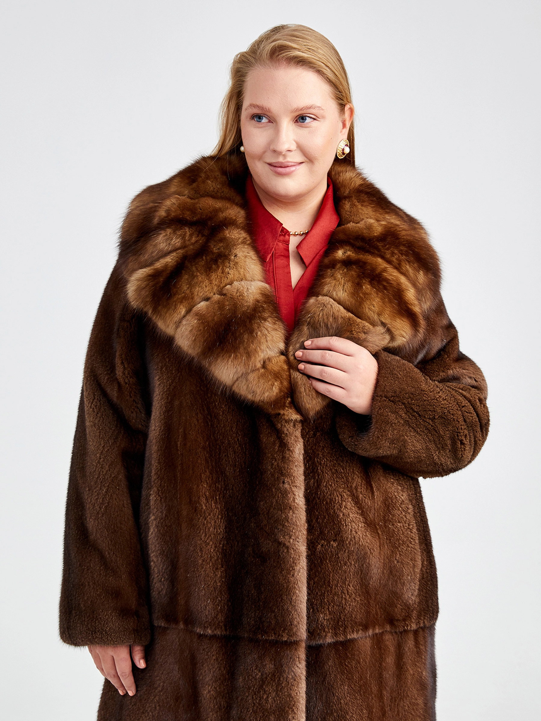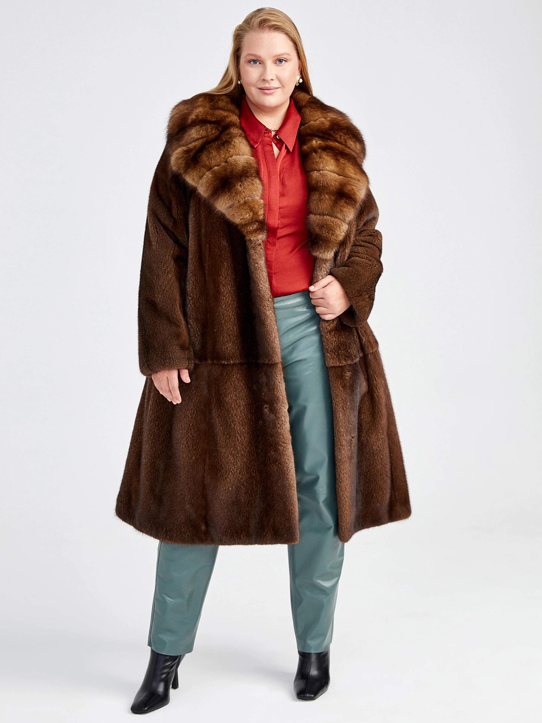 Товар женская шуба из меха норки с воротником из меха соболя 4021(авс), коричневая, размер 44, артикул 32900 выполнен из мех норки с застежкой клипсы. Рассчитан на сезон: осень-зима. Длина изделия свыше 90 см, силуэт прямой.