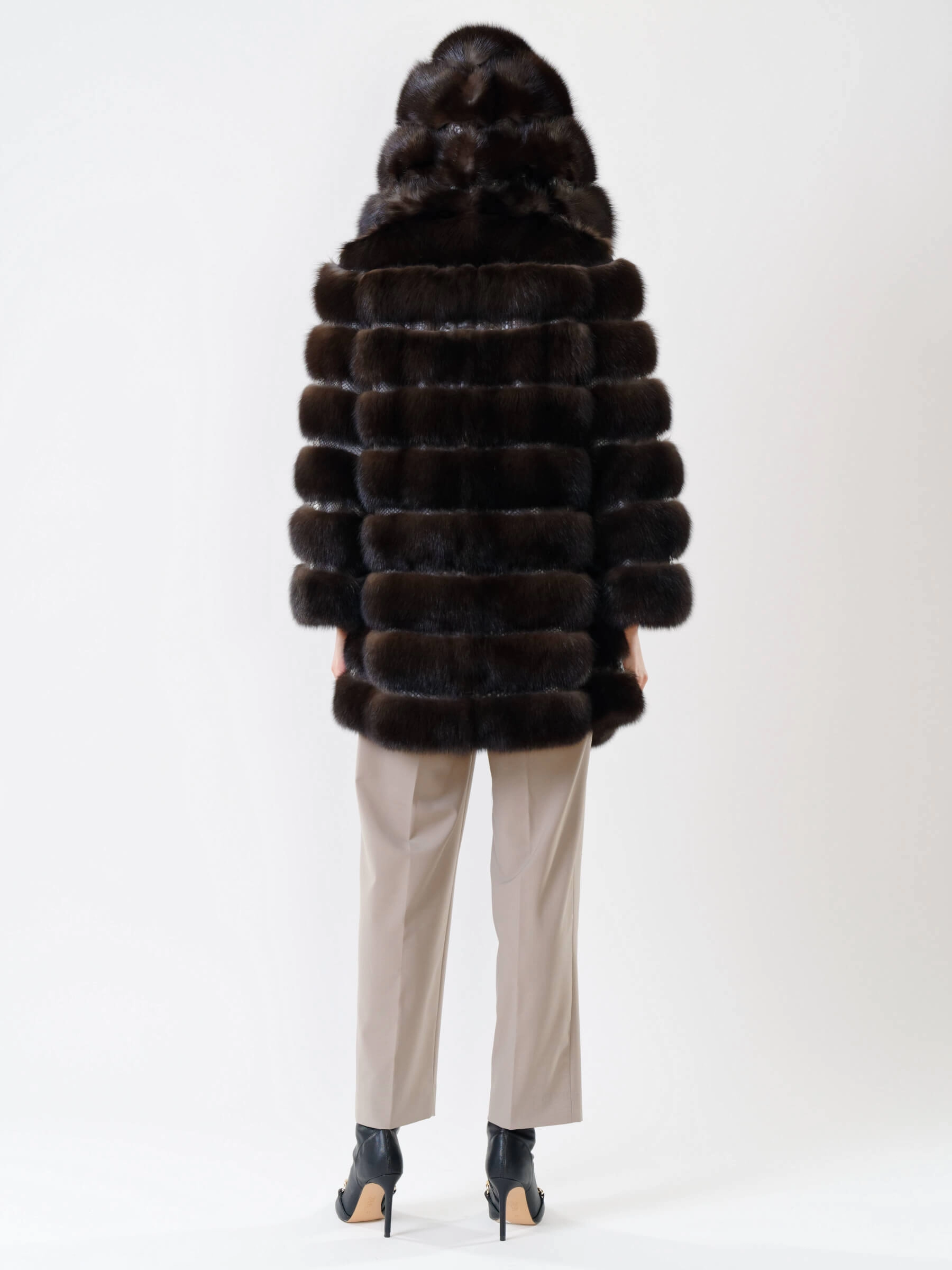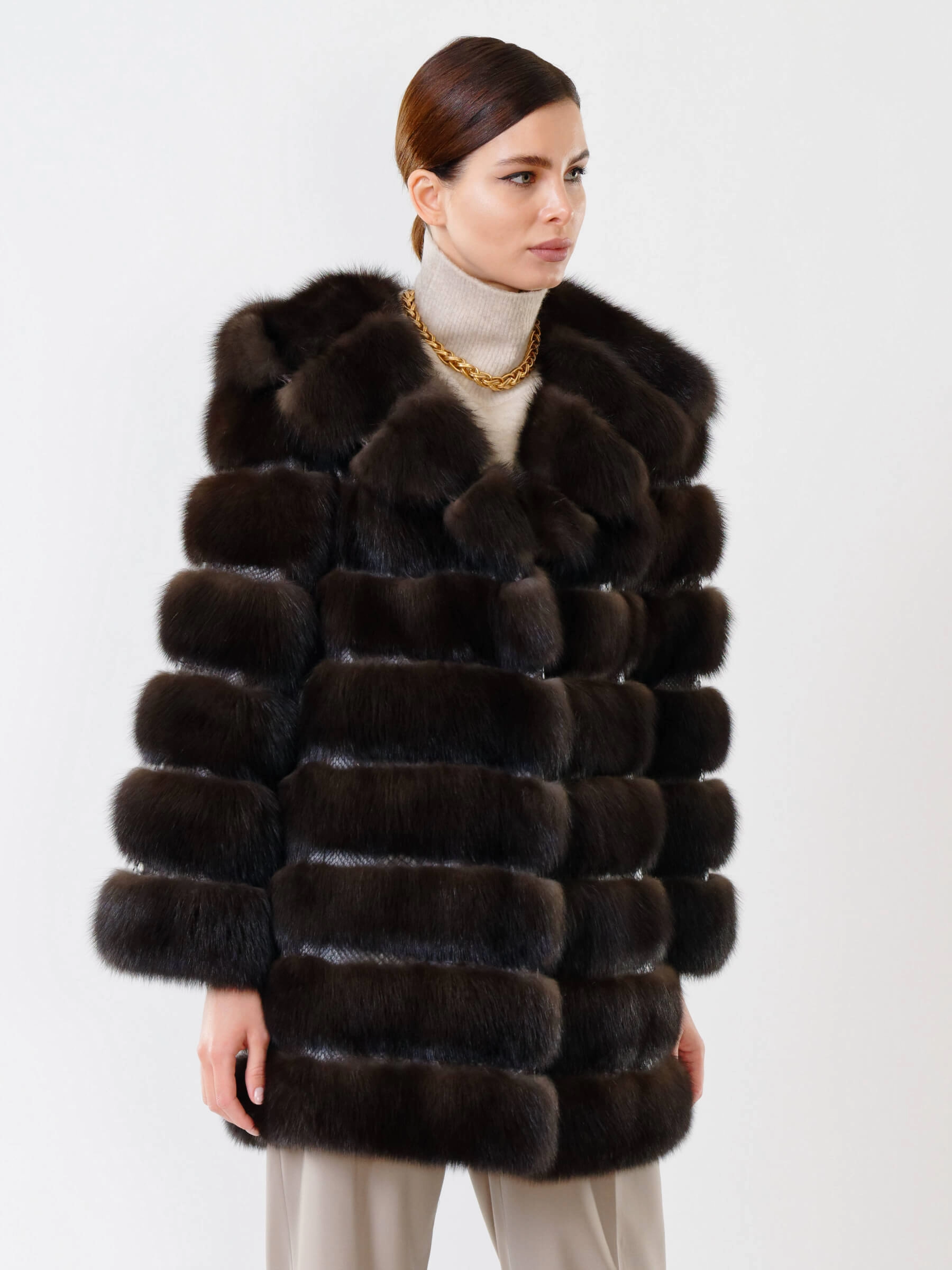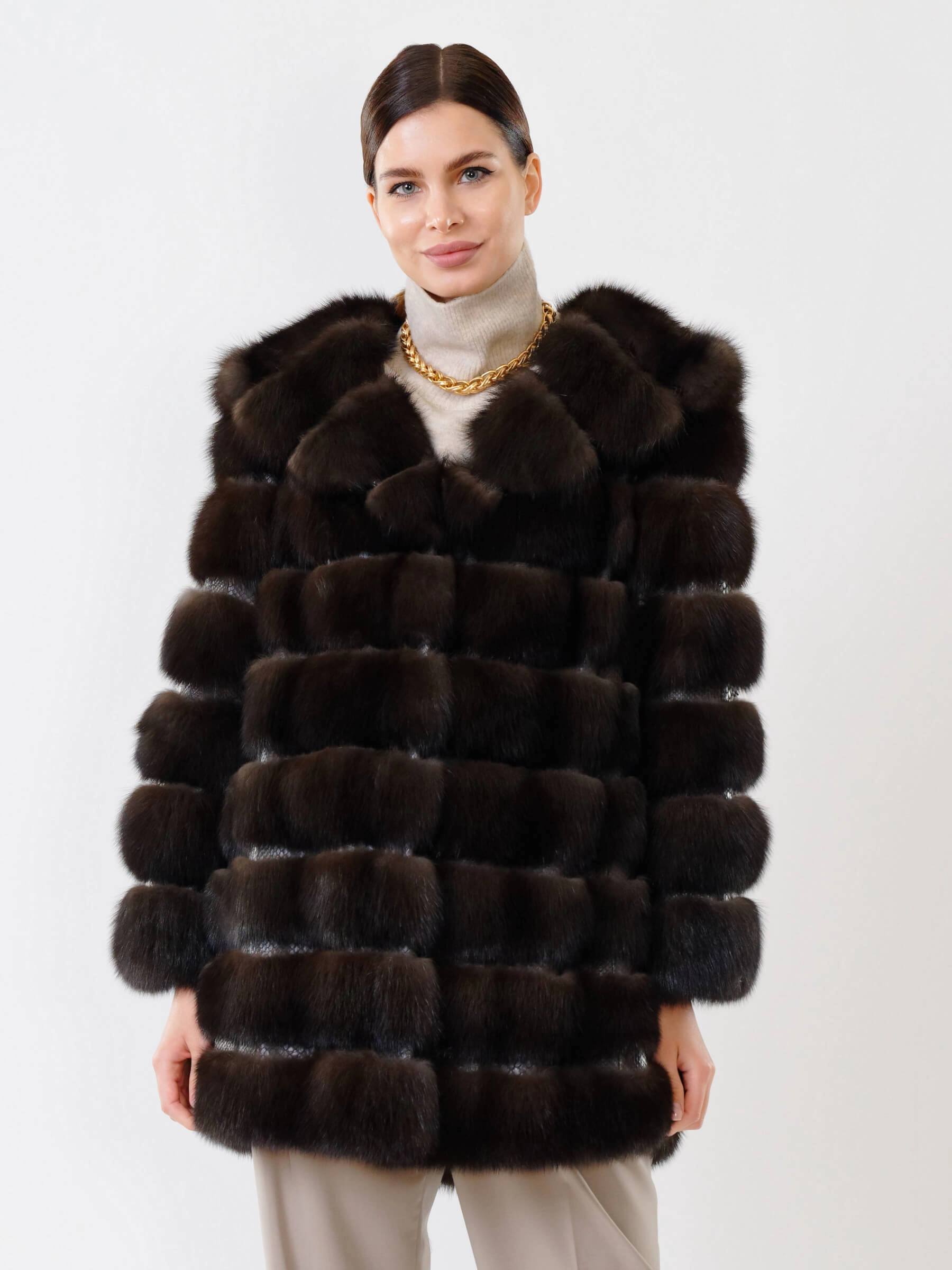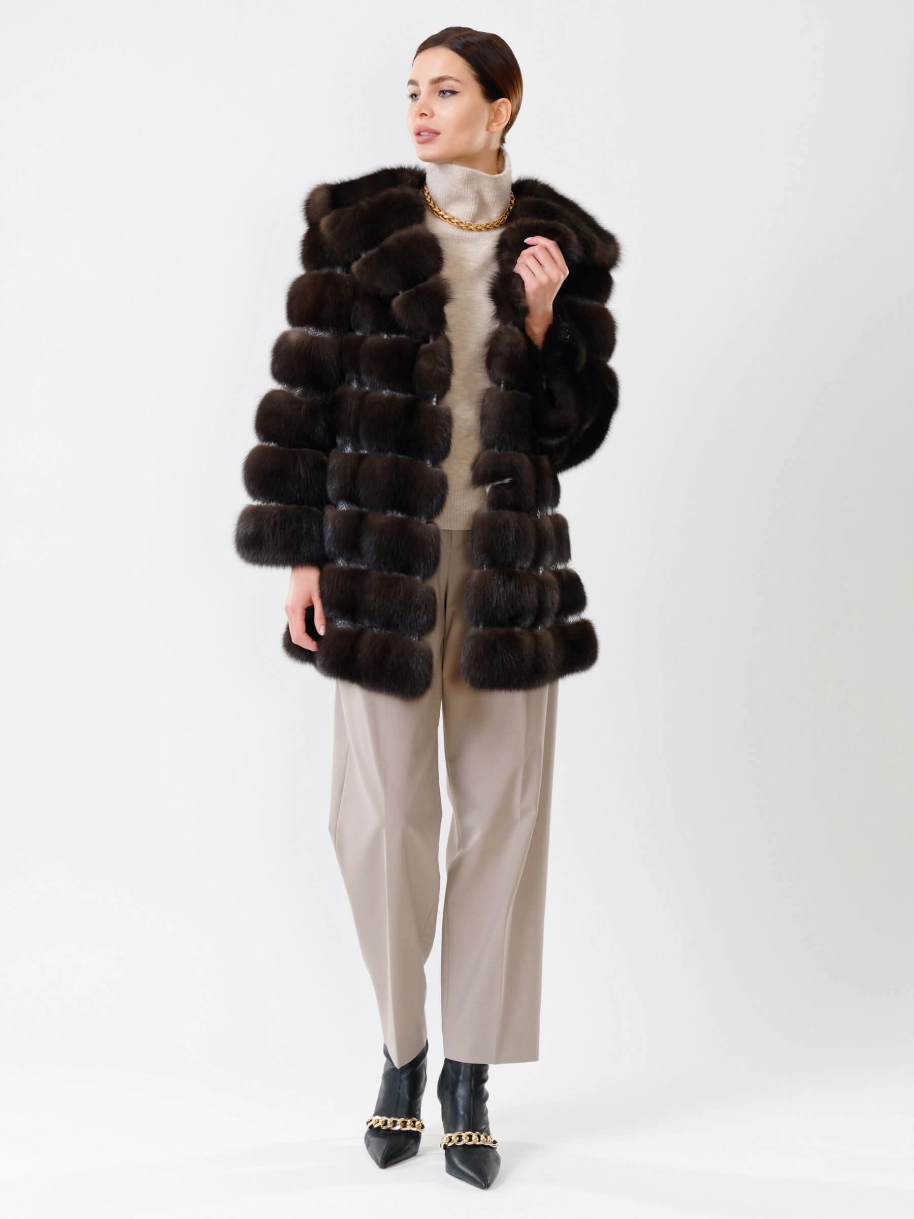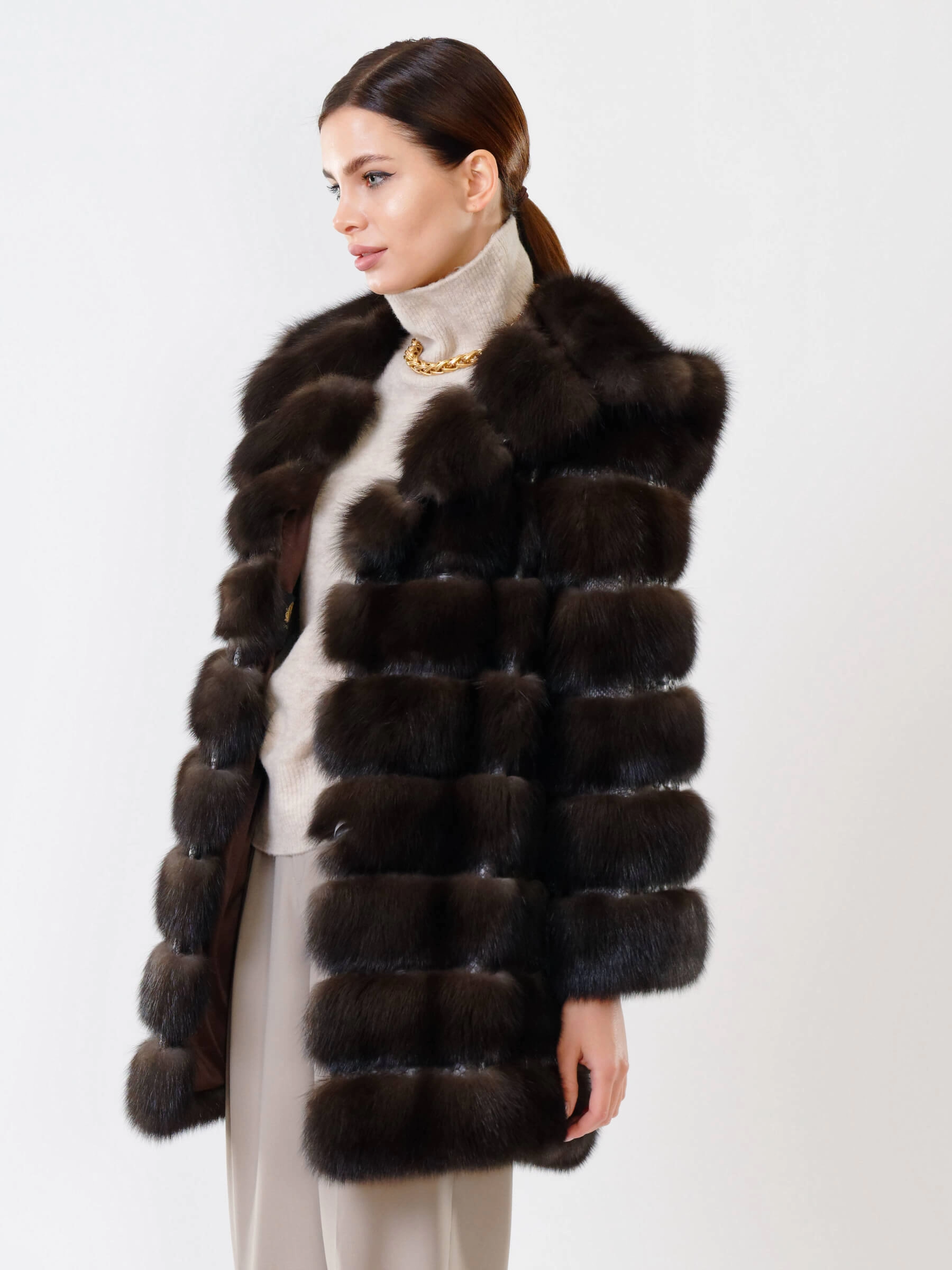 Шуба из меха соболя женская 313, коричневая, размер 48, артикул 19000