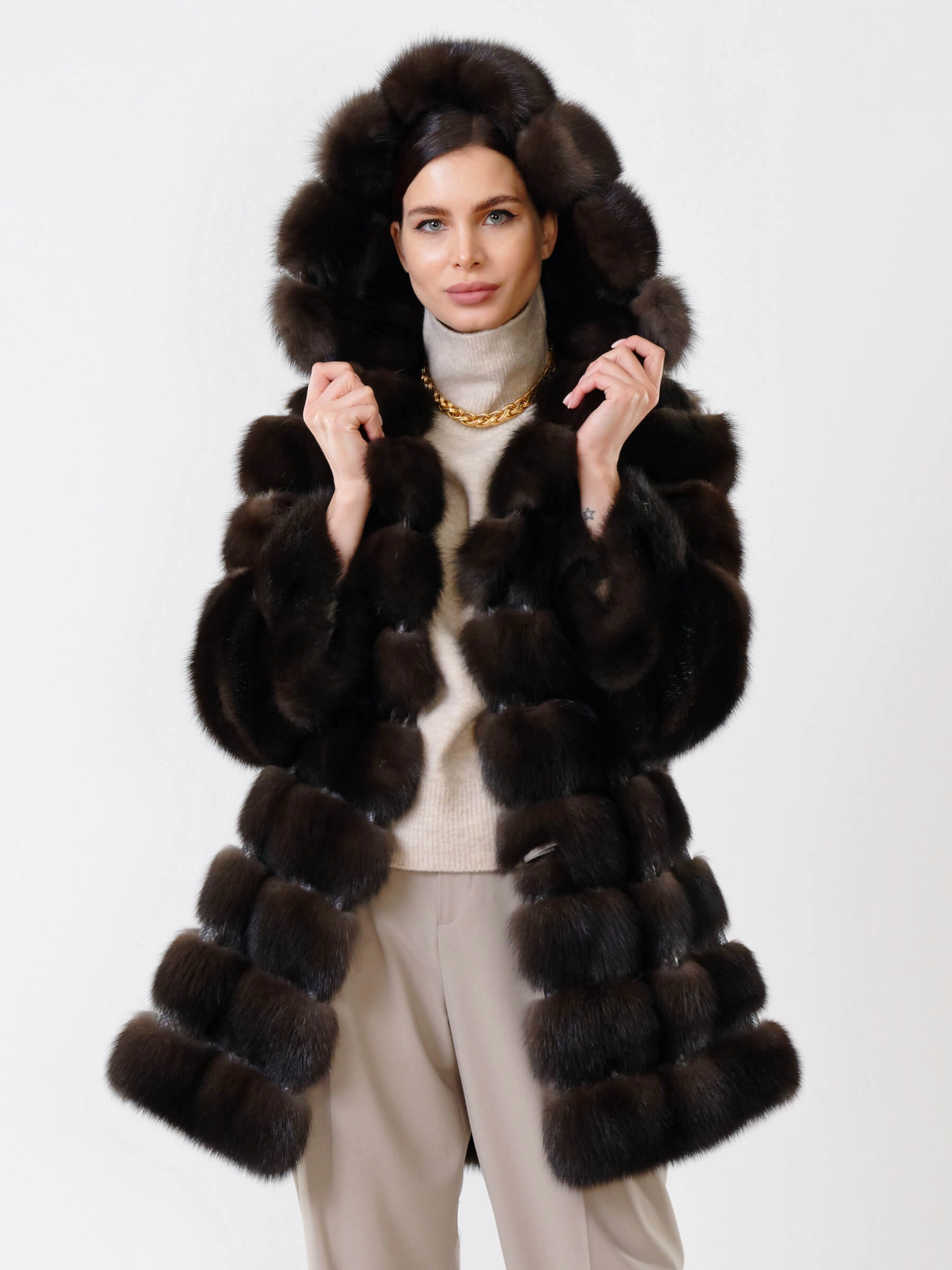 Эксклюзивная модель прямого кроя длиной 80 см создана из отборных шкурок соболя, приобретённых на легендарном аукционе «СОЮЗПУШНИНА» и выделанных на фабрике «Мета-Сибирь». Мех искусно дополнен кожей питона, а несъёмный капюшон и застёжка на клипсах подчёркивают безупречный силуэт. Совет стилиста: сочетайте с платьем-миди и лаковыми лодочками для вечернего выхода или с кожаными брюками и сапогами-ботфортами — эта сертифицированная шуба станет фамильной ценностью в вашем гардеробе. Не просто шуба, а наследие — где каждая шкурка прошла строгий отбор, чтобы стать частью вашей уникальной истории.