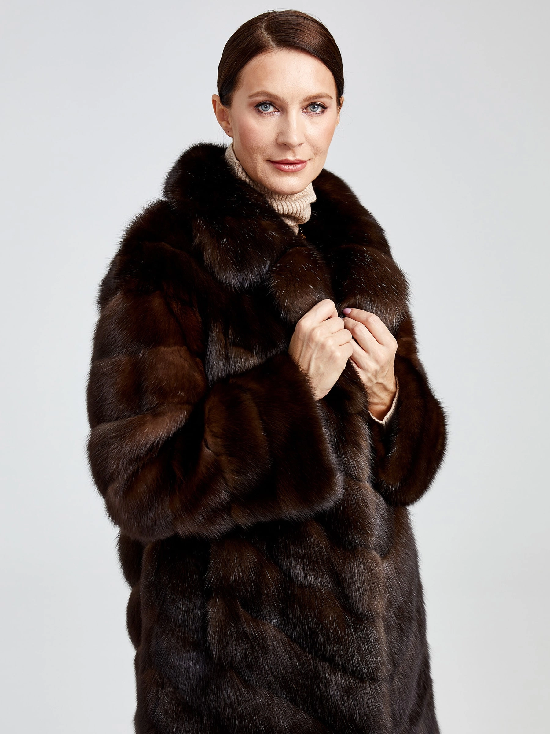 Изысканное пальто длиной 90 см из меха соболя с диагональной раскладкой воплощает премиальное качество и безупречный вкус. Его густой, шелковистый подшёрсток надёжно сохраняет тепло, а элегантный английский воротник и застёжка на клипсах создают выразительный силуэт. Невероятная лёгкость и комфорт модели делают её идеальной для создания стильных образов: сочетайте пальто с кожаными брюками и сапогами-ботфортами для вечернего выхода или с платьем-миди и лаковыми лодочками — этот предмет гардероба подчеркнёт вашу индивидуальность и безупречный стиль.
